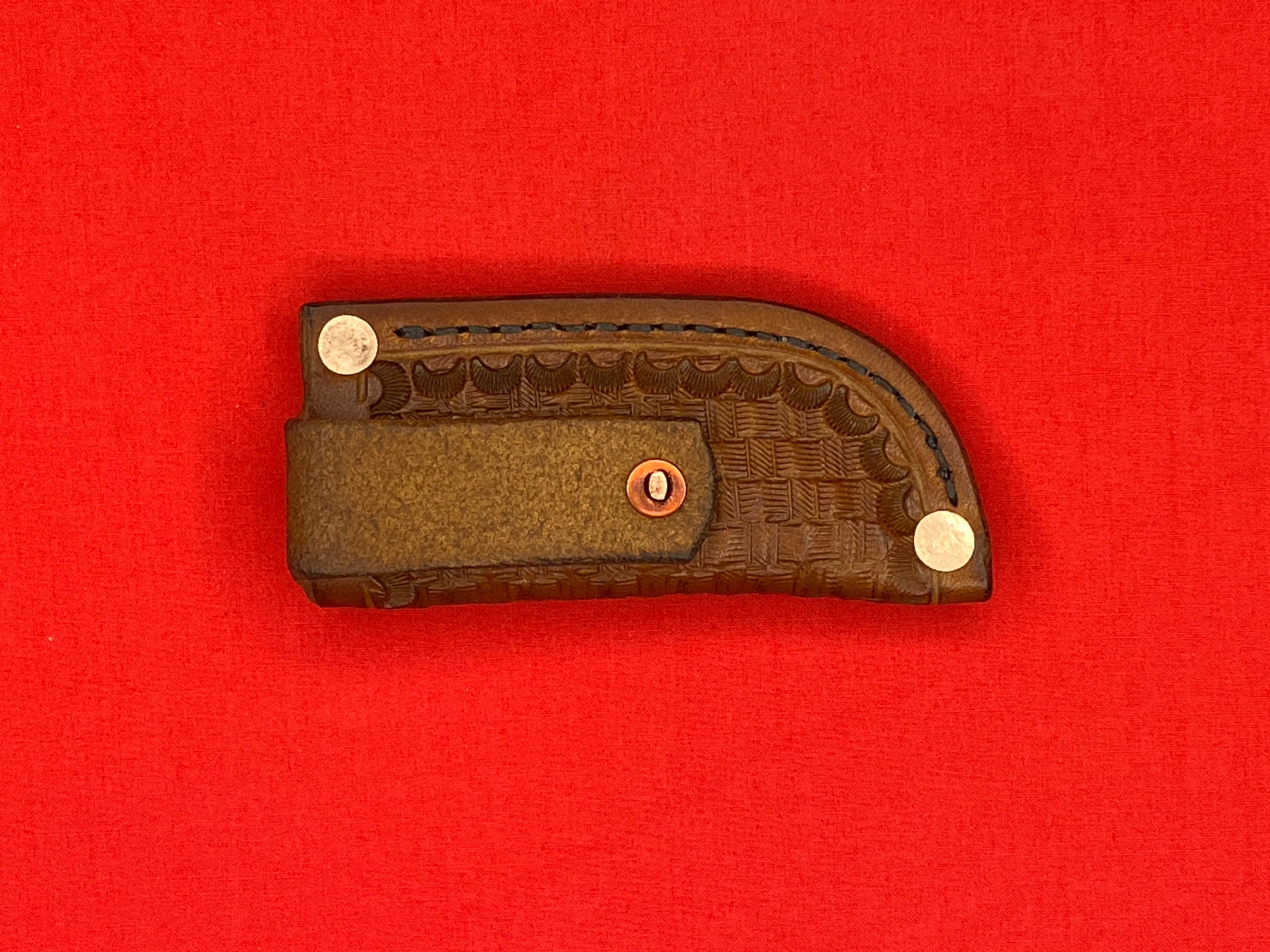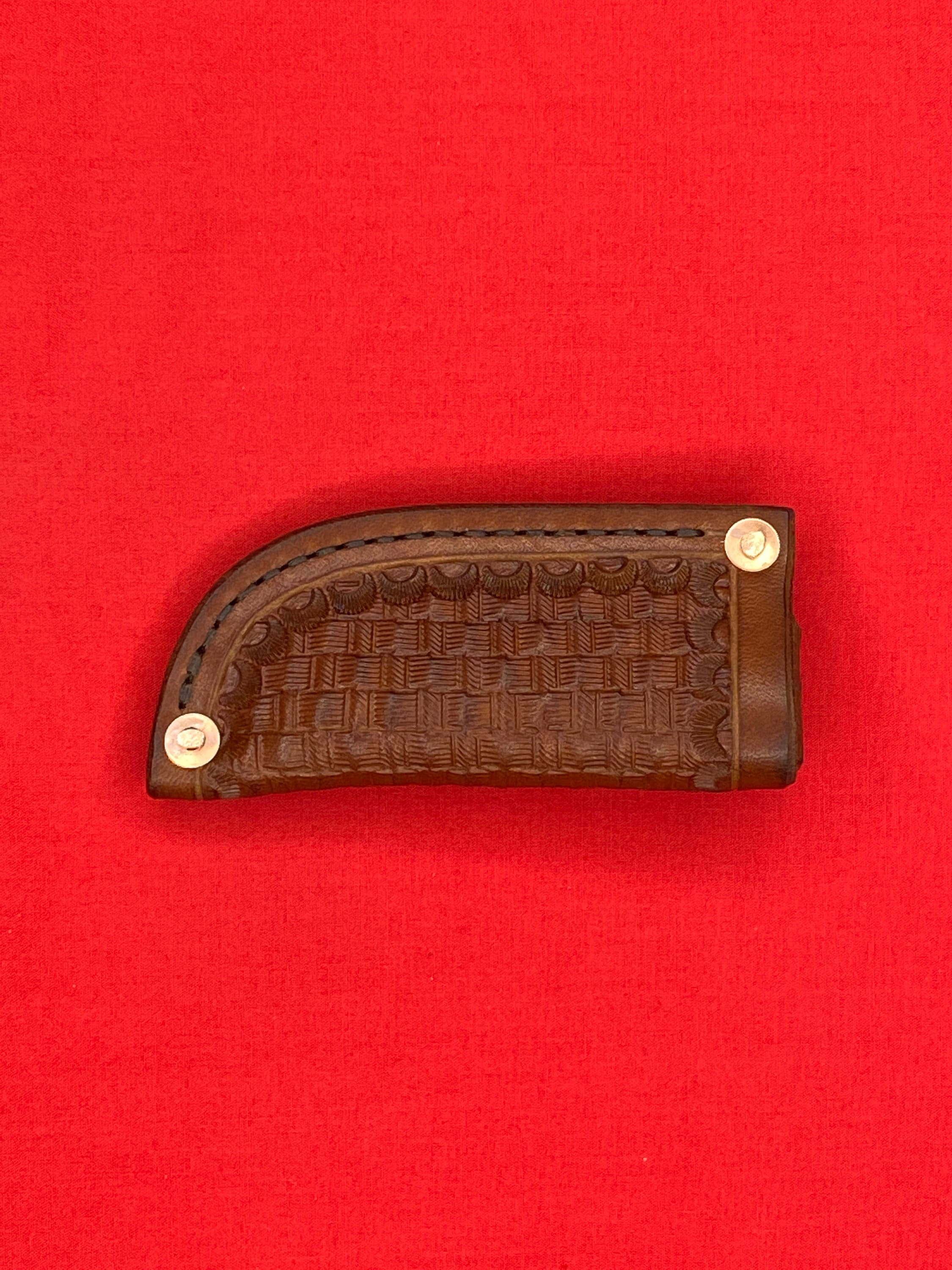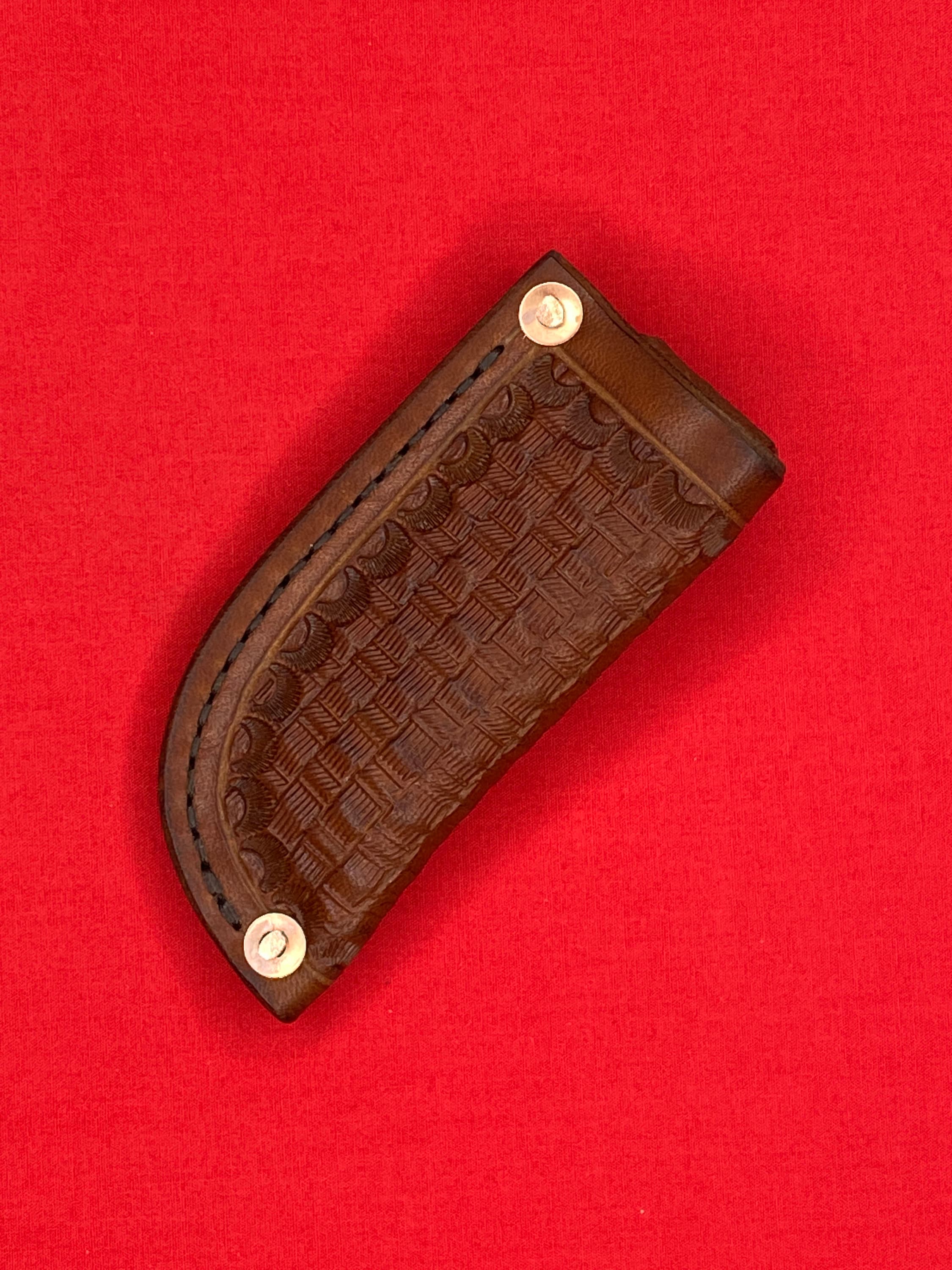 Handmade Leather folding knife sheath is made from 8/9 oz veg tan leather and given a basket weave design and dyed with Fiebings Pro Dye . The sheath was secured with copper rivets and burrs and hand stitched with Tiger thread . Will fit a folding knife up to 4 1/8 inches , such as a trapper style knife . Sheath made by Appalachian Axeworks