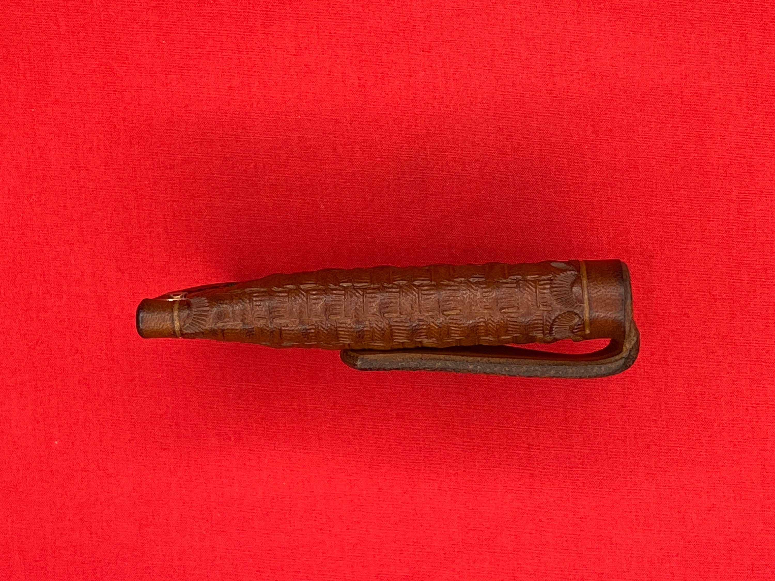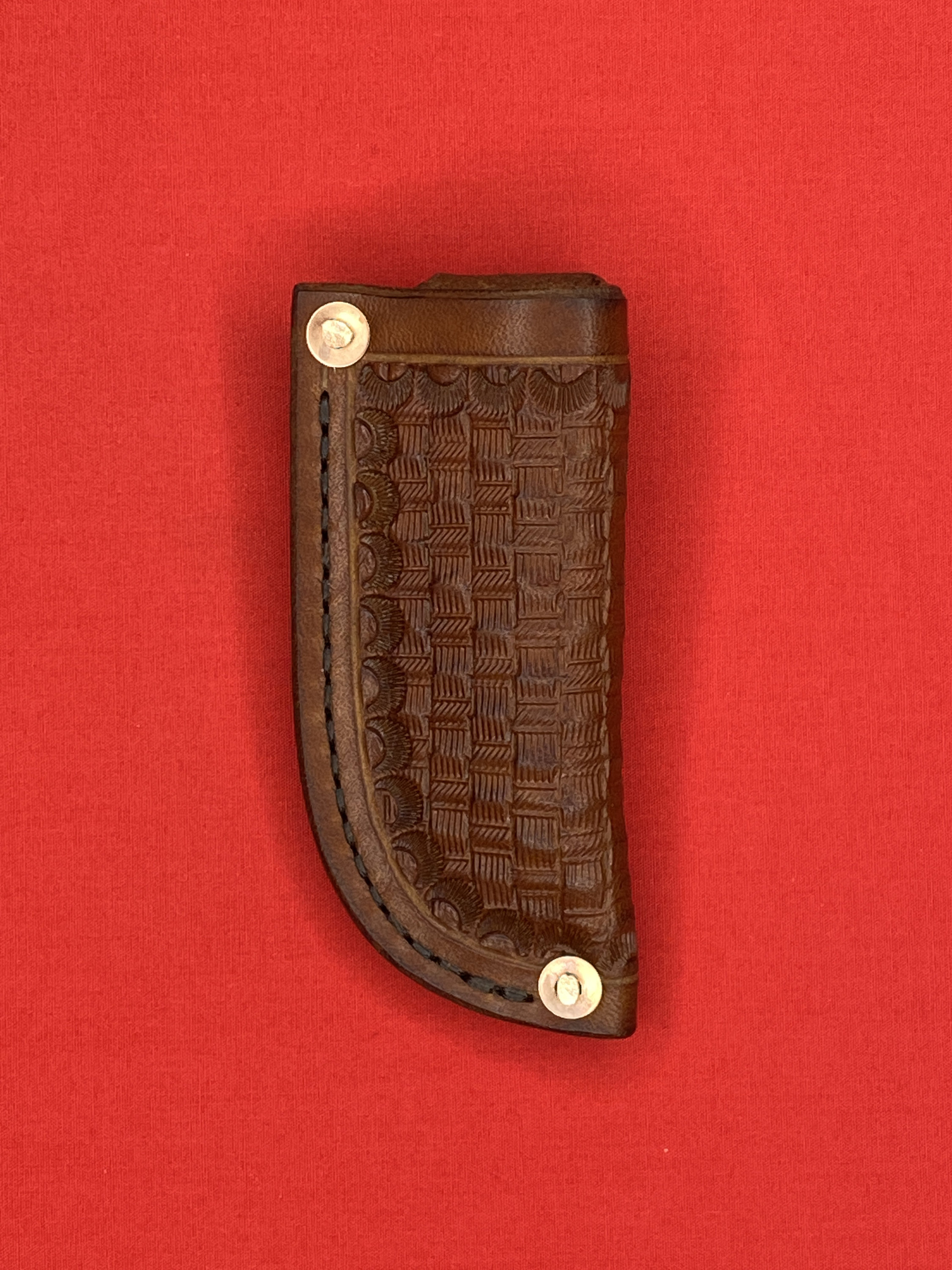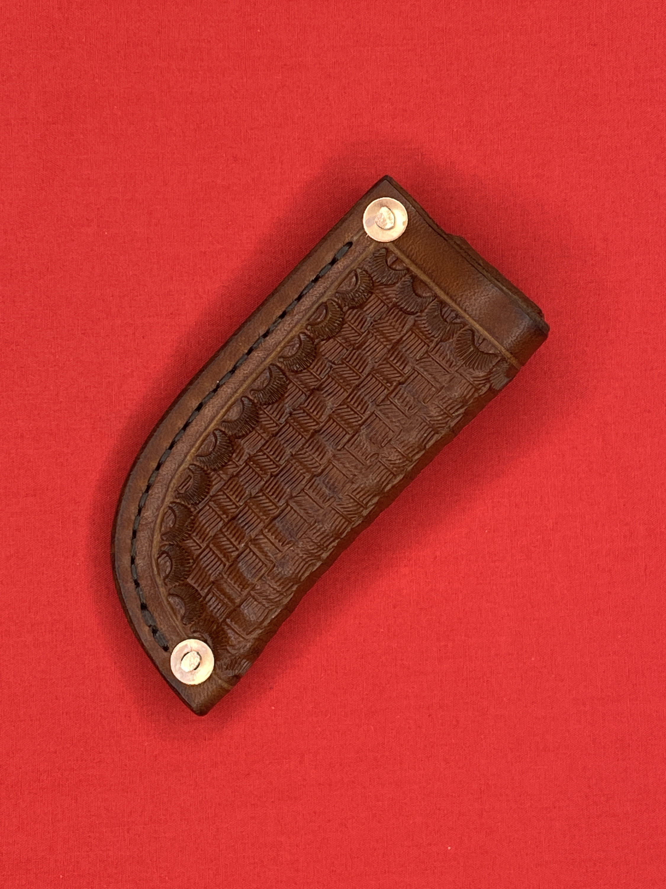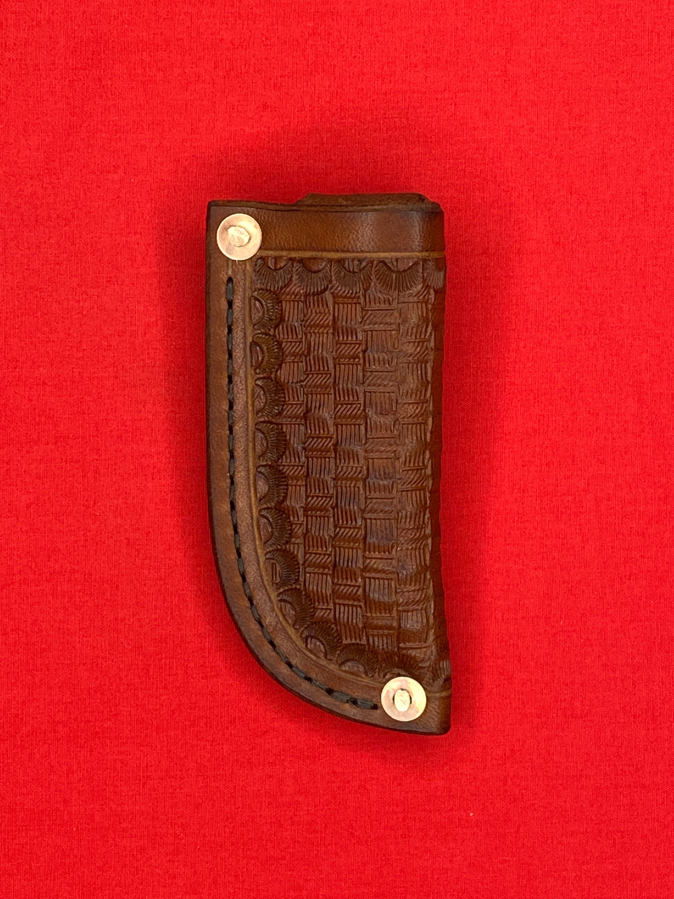 Handmade Leather folding knife sheath is made from 8/9 oz veg tan leather and given a basket weave design and dyed with Fiebings Pro Dye . The sheath was secured with copper rivets and burrs and hand stitched with Tiger thread . Will fit a folding knife up to 4 1/8 inches , such as a trapper style knife . Sheath made by Appalachian Axeworks