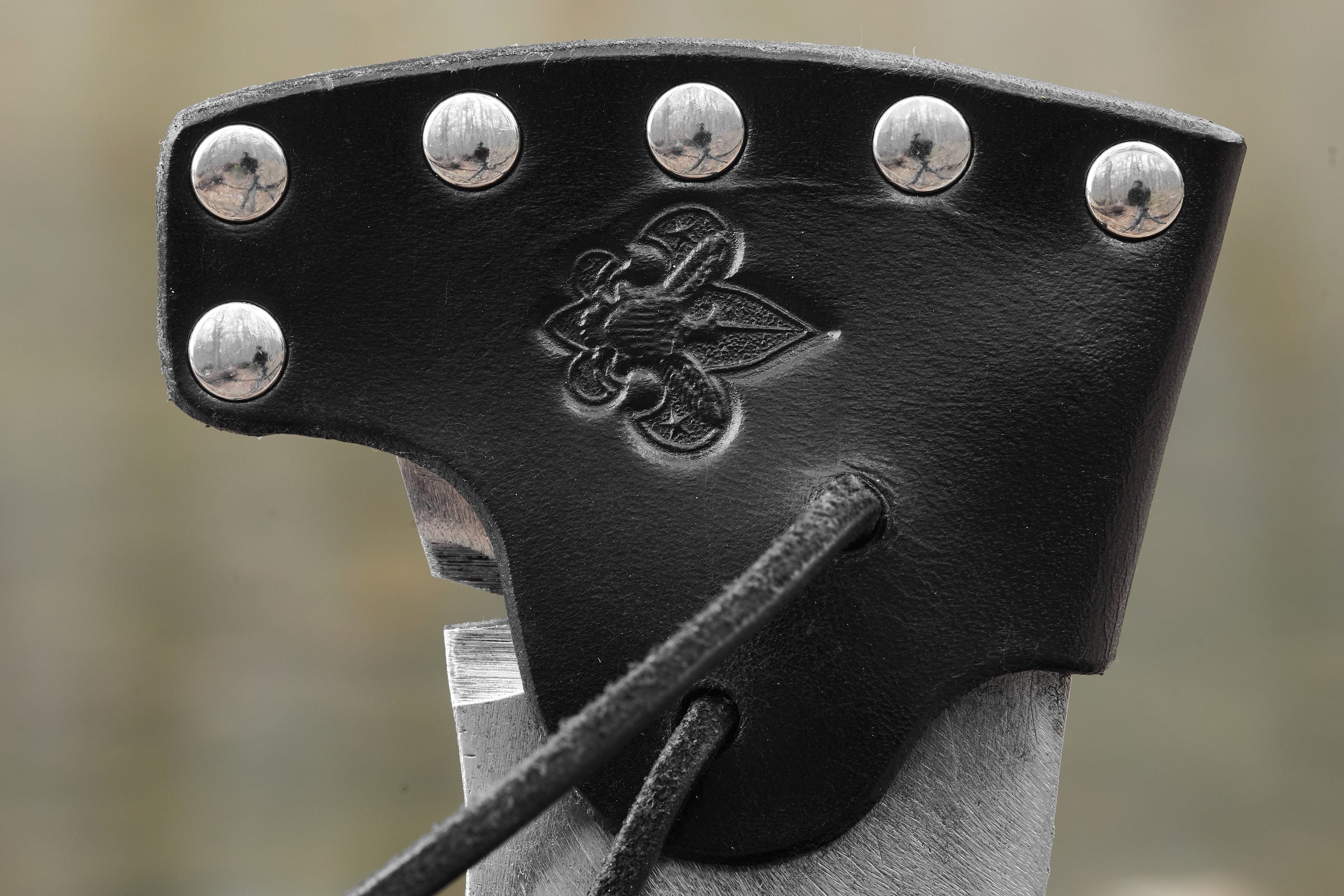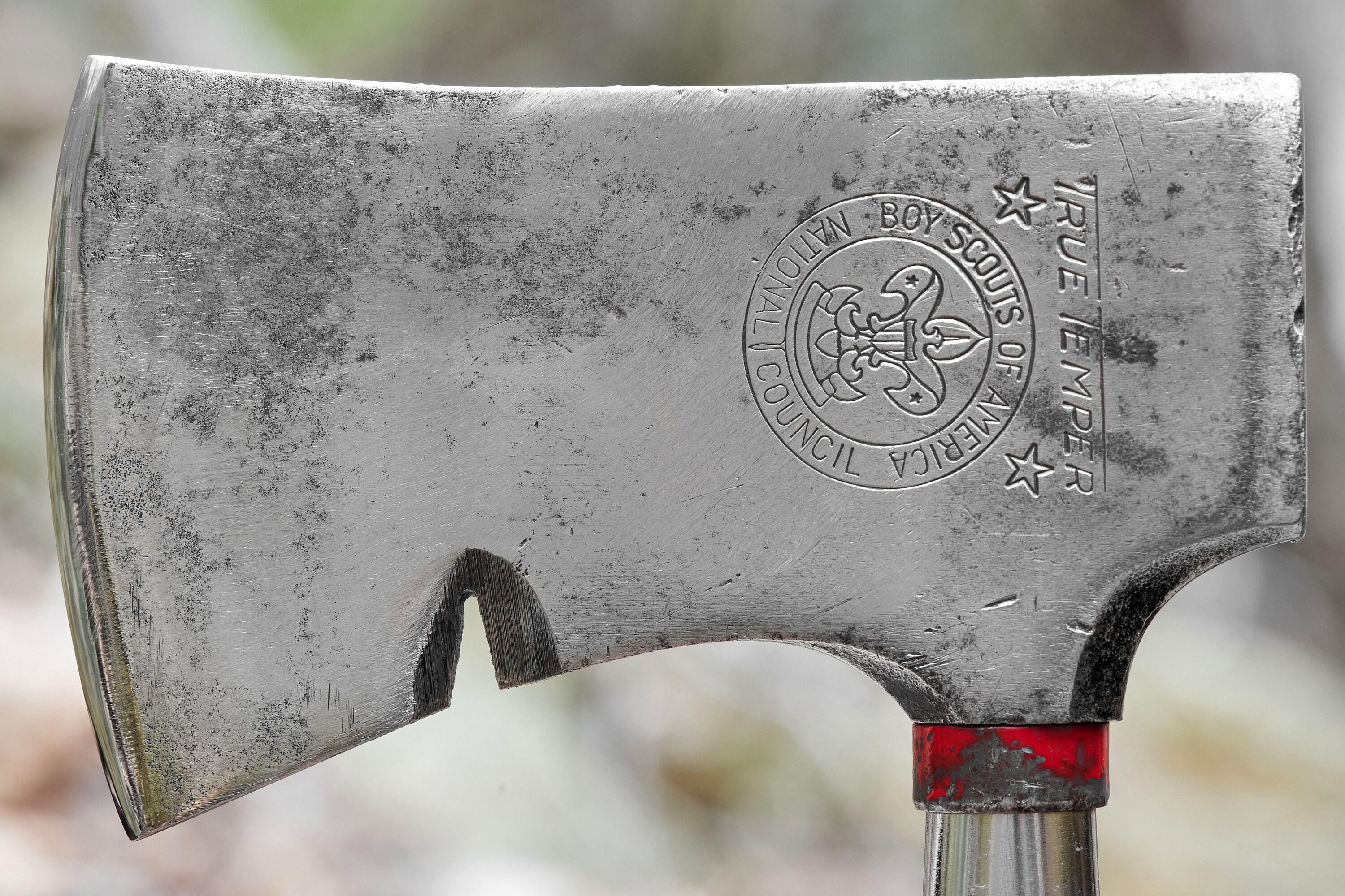 Vintage True Temper Boy Scout hatchet has been cleaned and sharpened . Comes with a handmade leather sheath with Boy Scout Logo stamped in the leather . Ready to put to work on your next camping trip .