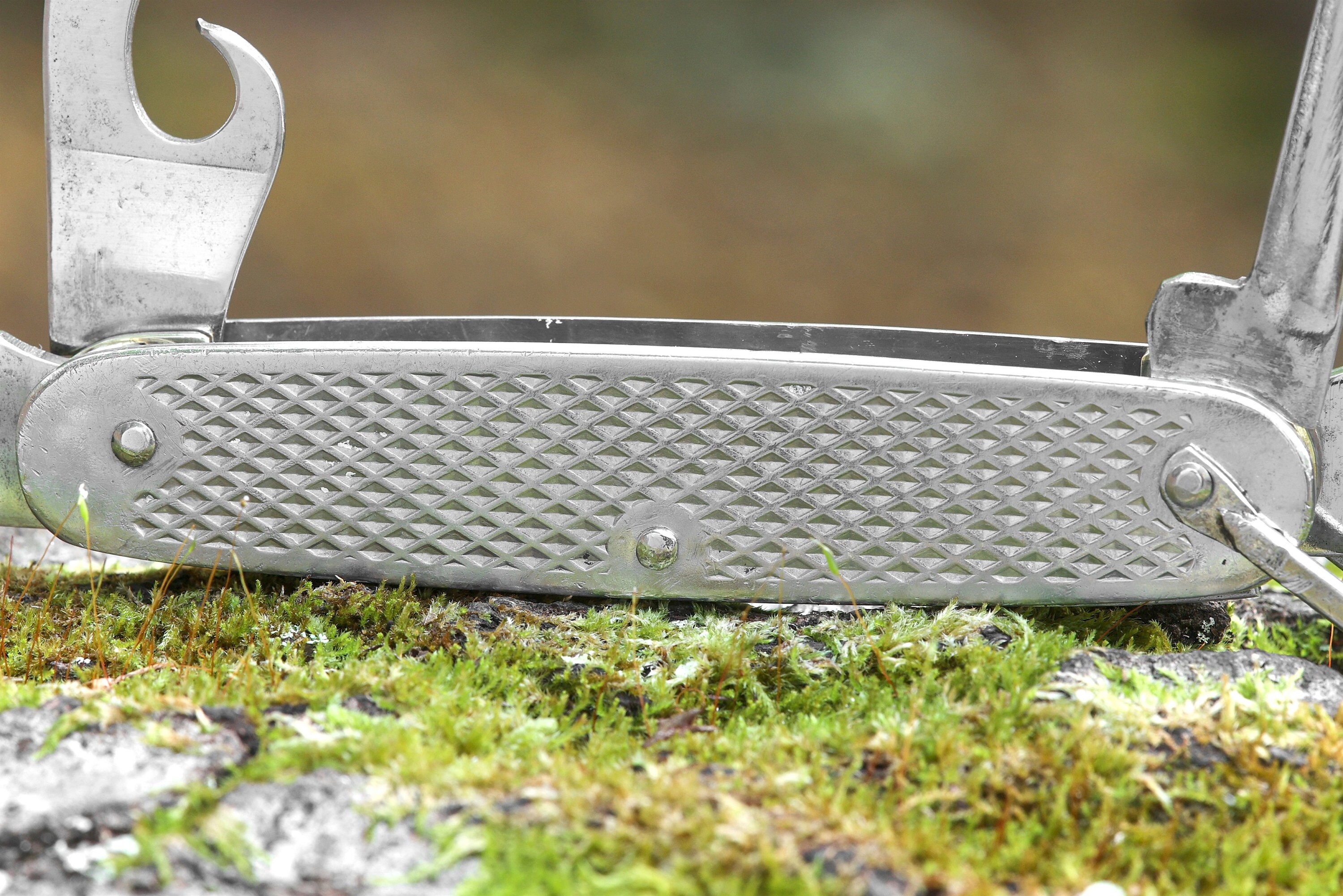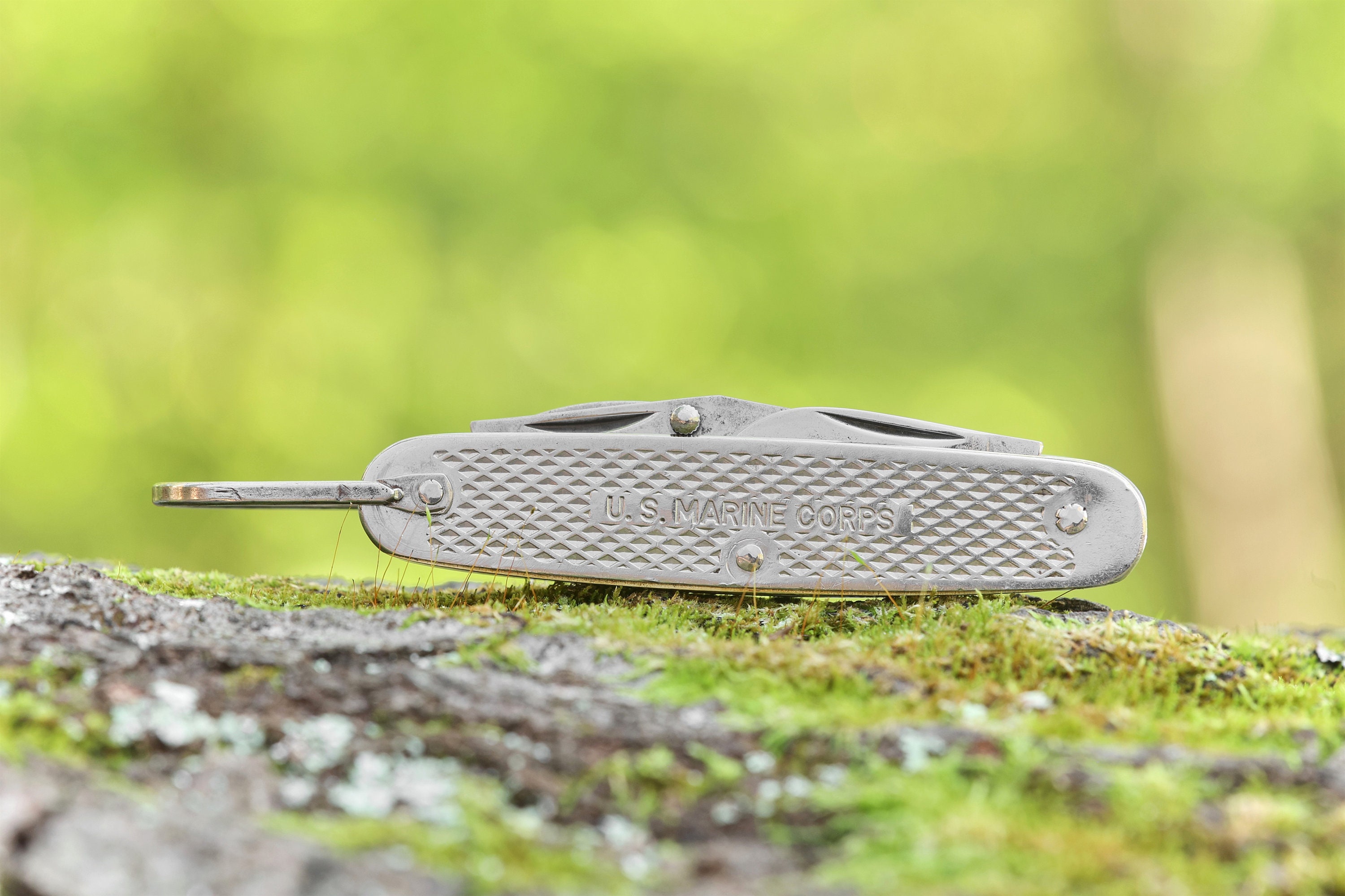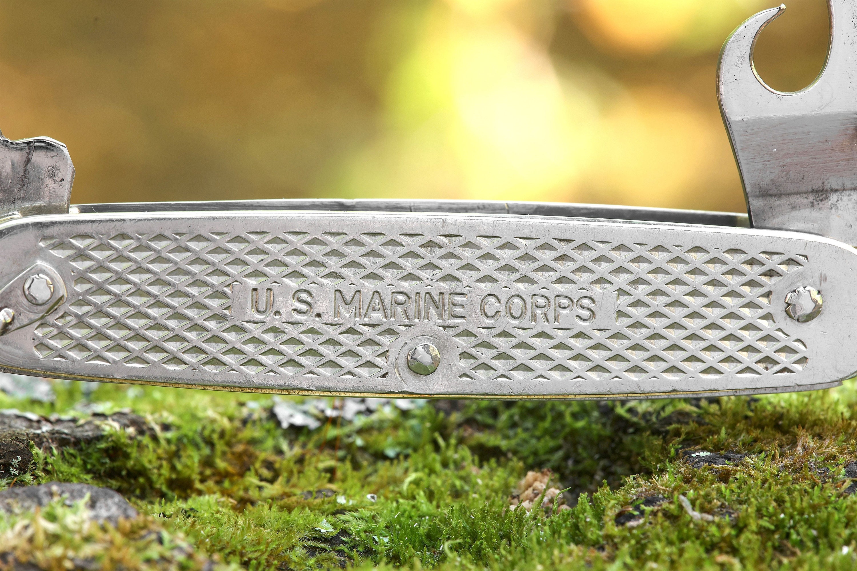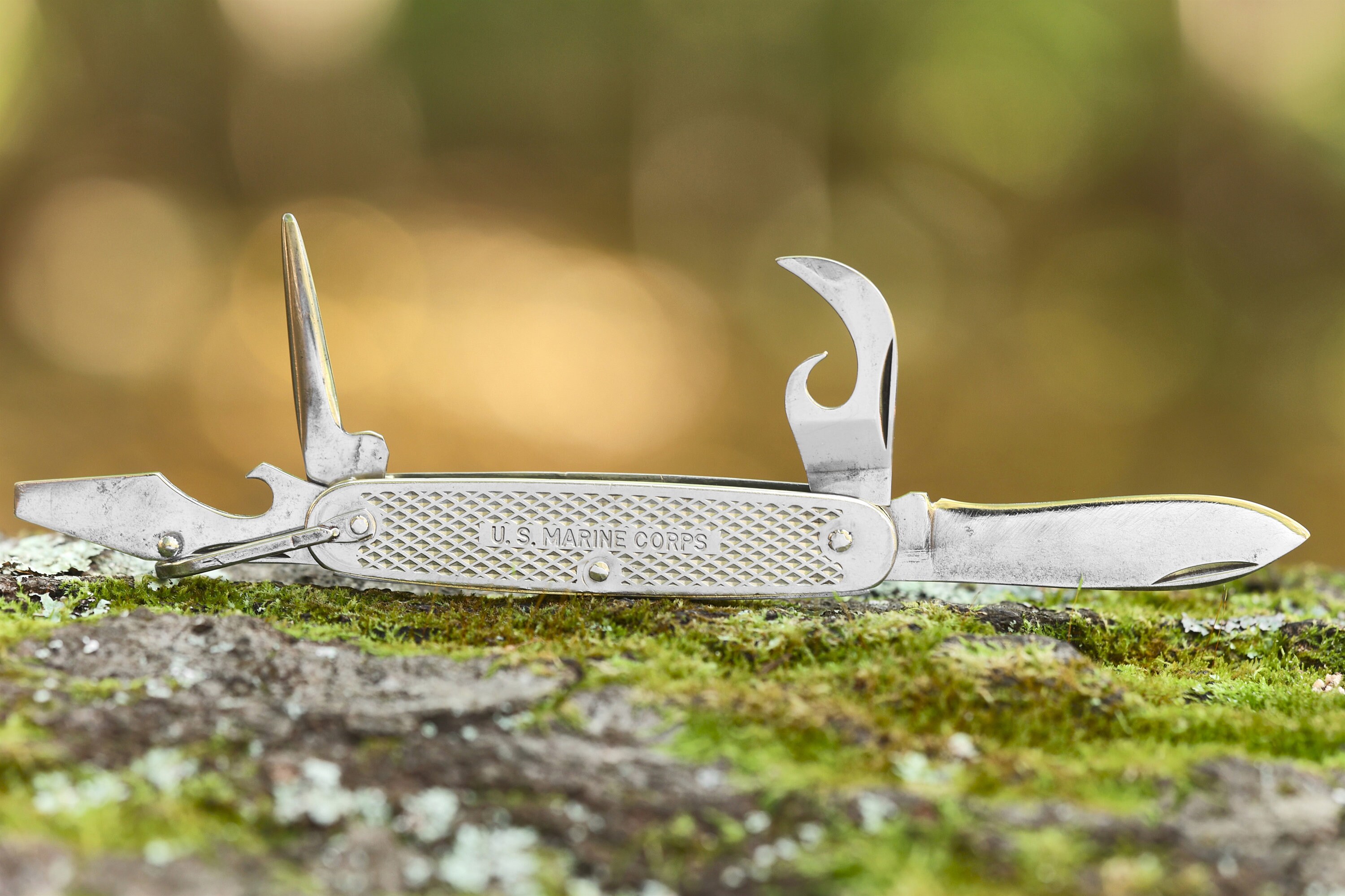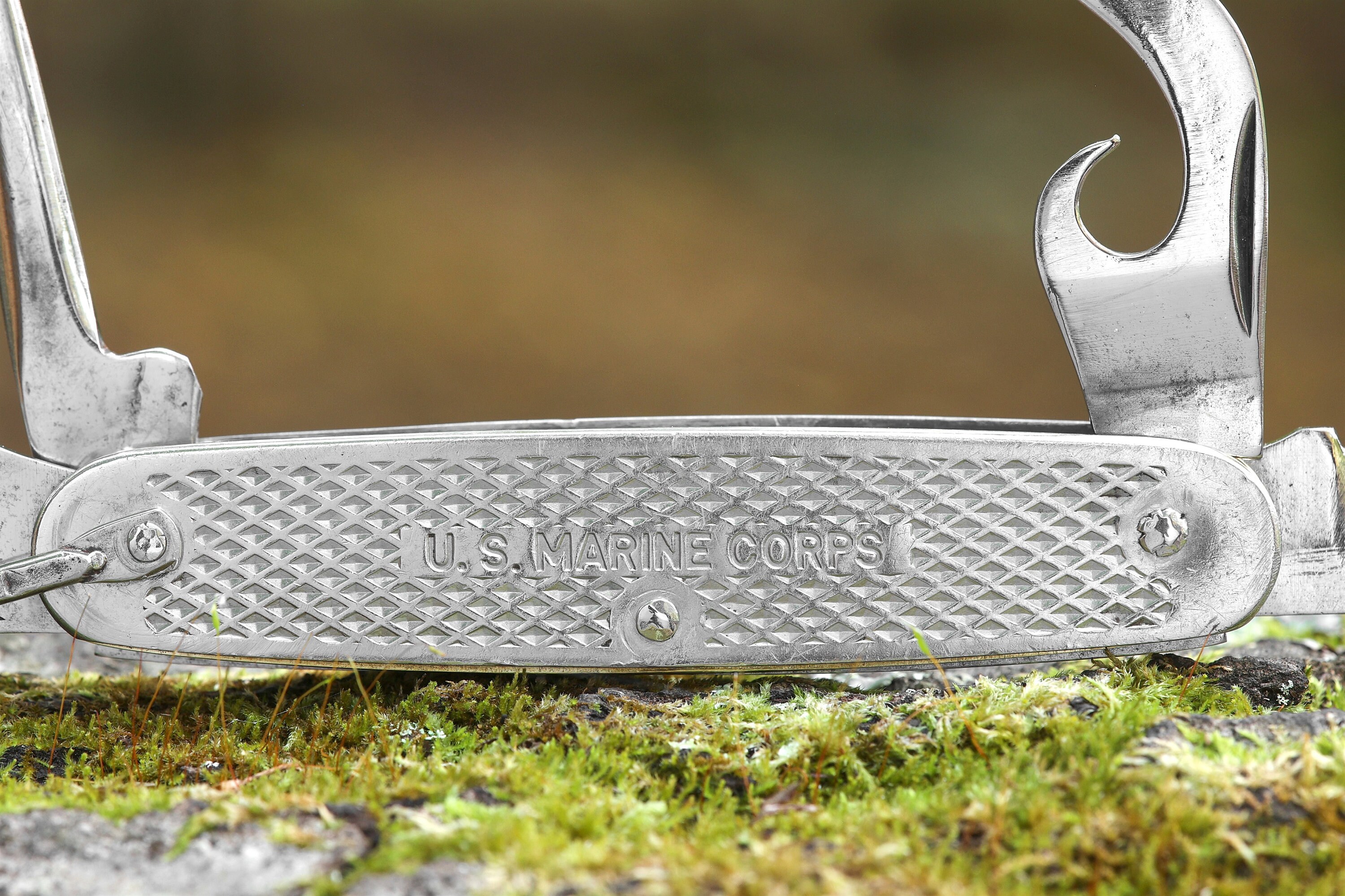 WW II Marine Corps Demo knife has been cleaned and sharpened .