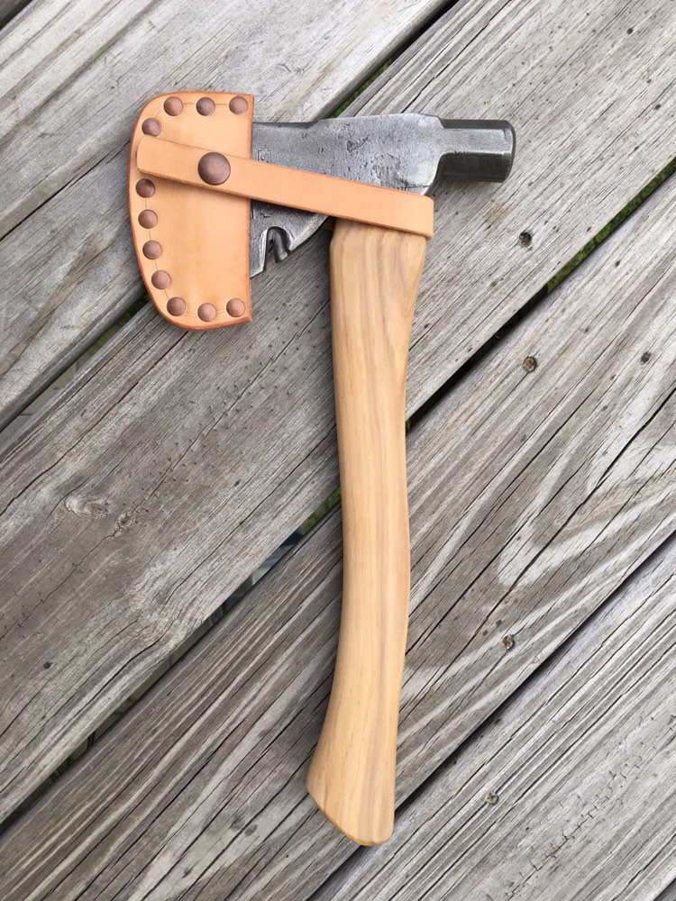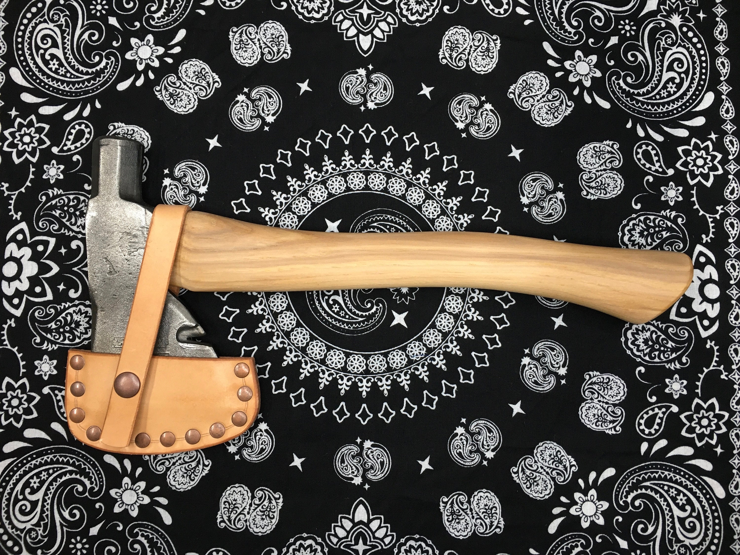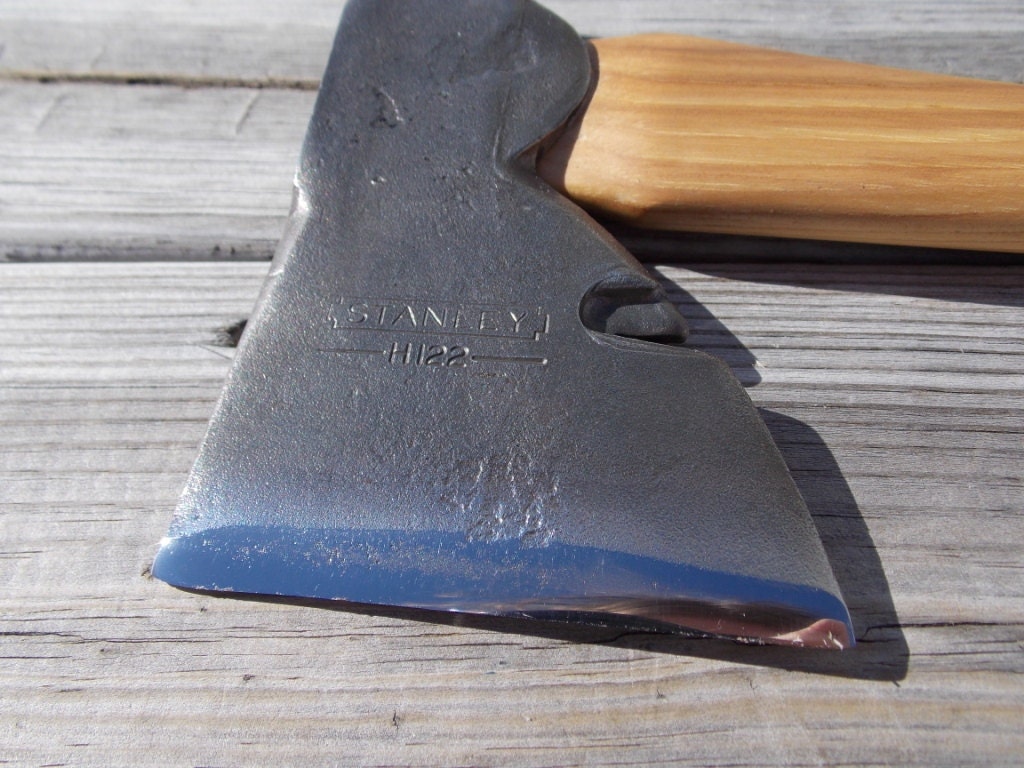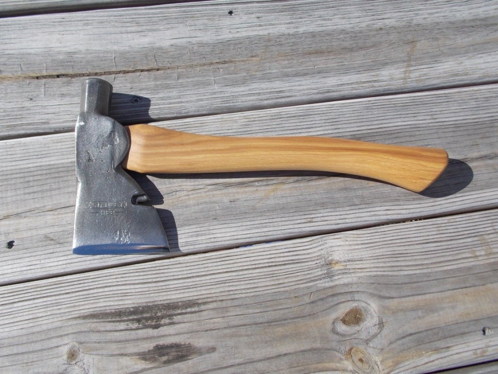 Stanley hatchet has had the rust removed and the edge sharpened.The handle is new of American Hickory .The handle has been sanded smooth and treated with orange oil and beeswax.Comes with a handmade leather sheath.