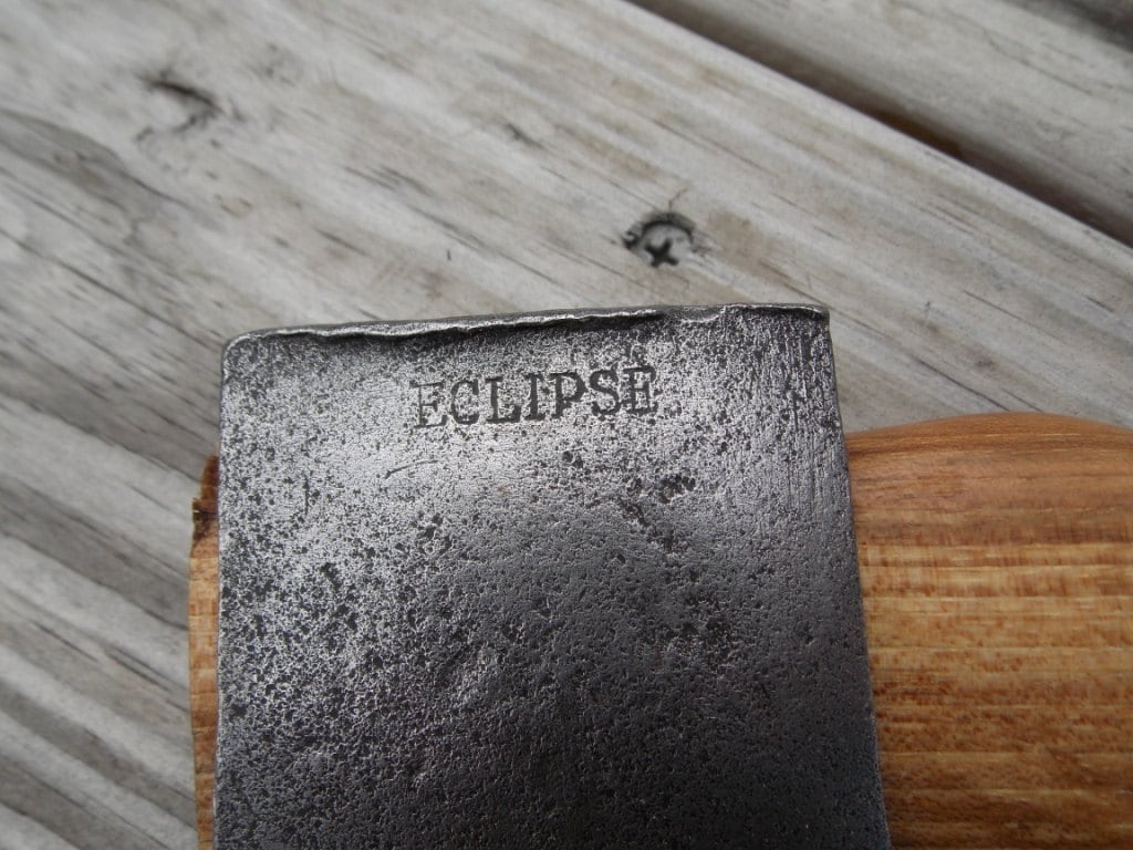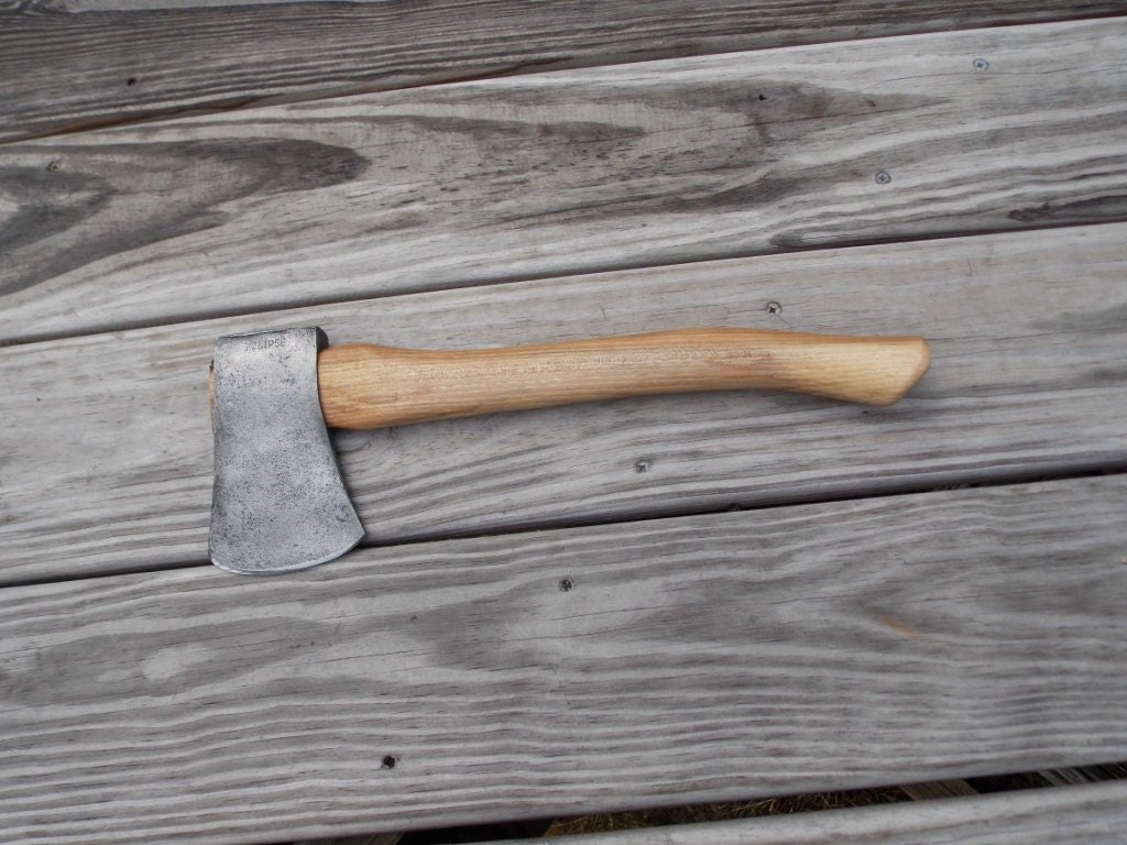 Vintage Eclipse marked hatchet has been cleaned of rust and the edge sharpened .The new 14 inch handle is of American Hickory .The handle has been hand sanded smooth and hand rubbed with orange oil and beeswax.Comes with a handmade leather sheath. Length 14 inches weighs 1 lb 10 oz