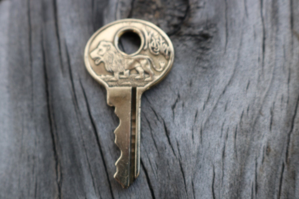 Vintage Masterlock with brass key has been cleaned and shined and is in working order .
