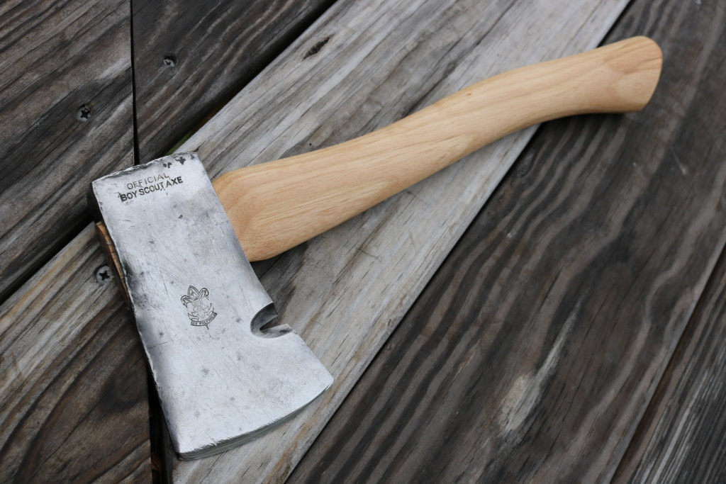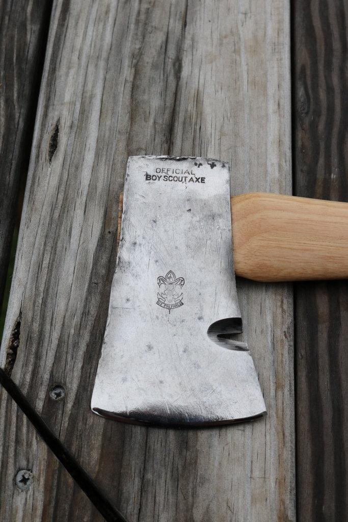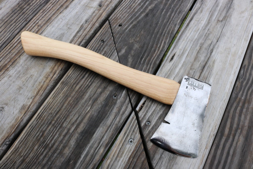 Vintage Collins Official Scout axe has been cleaned and sharpened .The new American Hickory handle has been hand sanded smooth and hand rubbed with orange oil and beeswax.Comes with a handmade leather sheath.