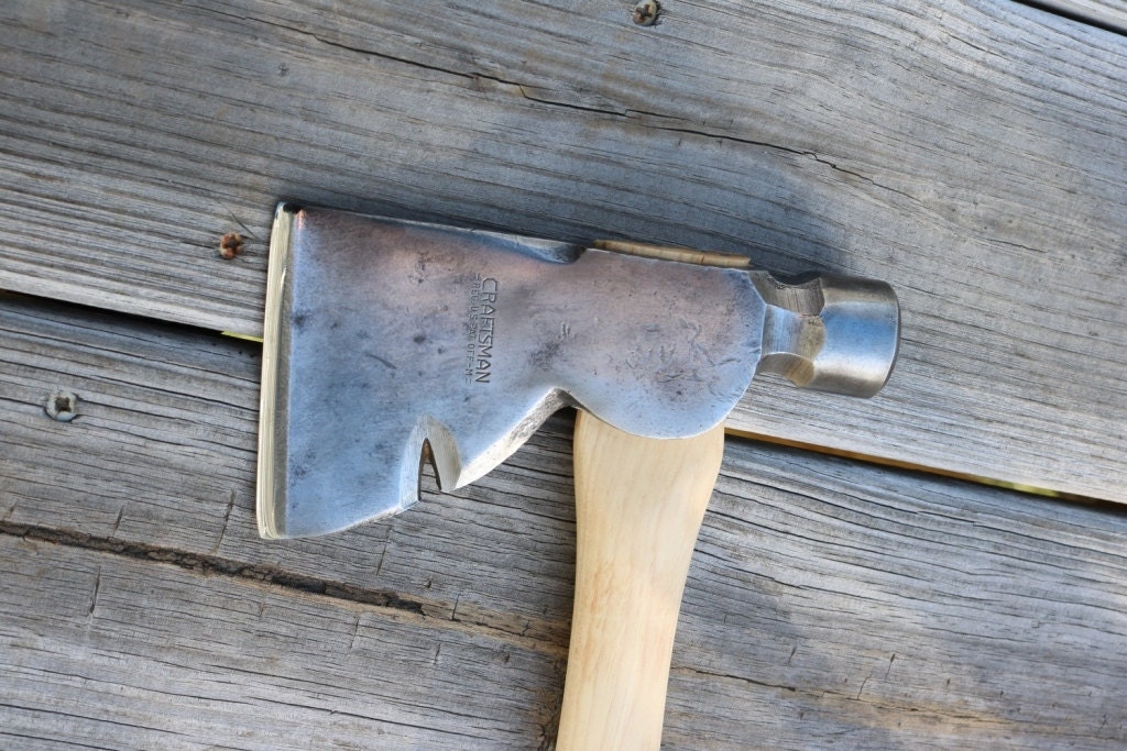 Vintage Craftsman hatchet has been cleaned of rust and the edge sharpened .The new American Hickory handle has been hand sanded smooth and hand rubbed with orange oil and beeswax .Come with a handmade leather sheath.