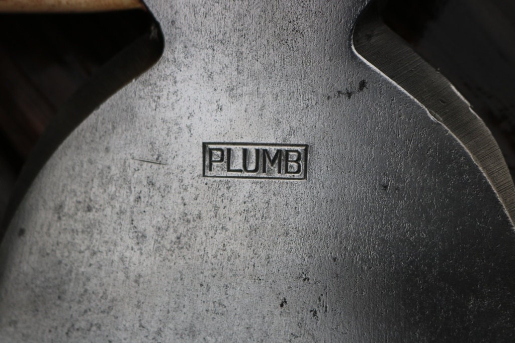 Vintage Plumb broad axe has been cleaned of rust and the edge sharpened .The handle has been stained to bring out the grains then the stain was sanded off and the handle was hand rubbed with orange oil and beeswax . Handmade leather sheath included .