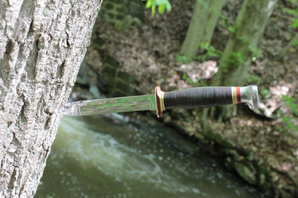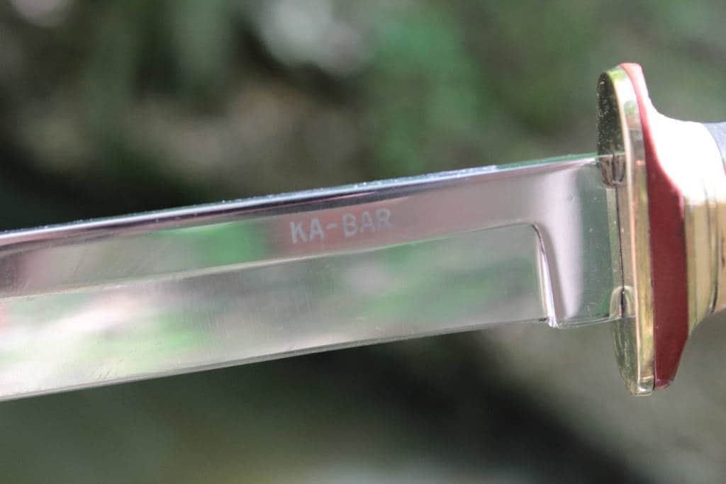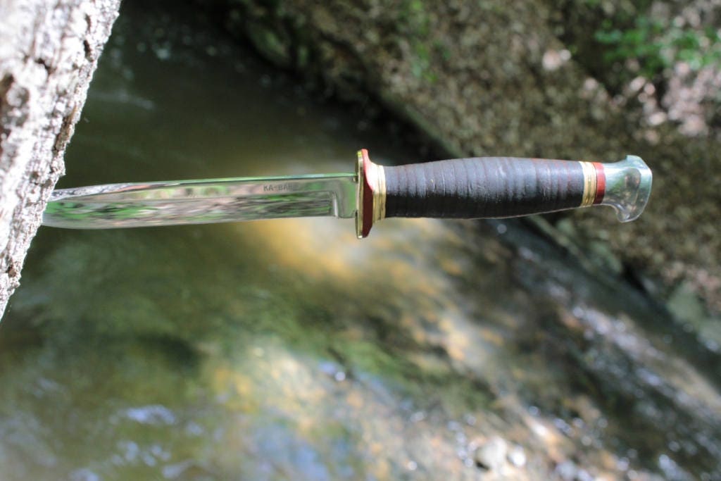 Vintage Ka Bar with leather stacked handle has been cleaned and the edge sharpened .This knife is 9 1/3 inches overall and the cutting edge is 5 1/4 inches .This knife is in great condition and is very sharp .The original leather sheath is in decent condition and is ready for work .