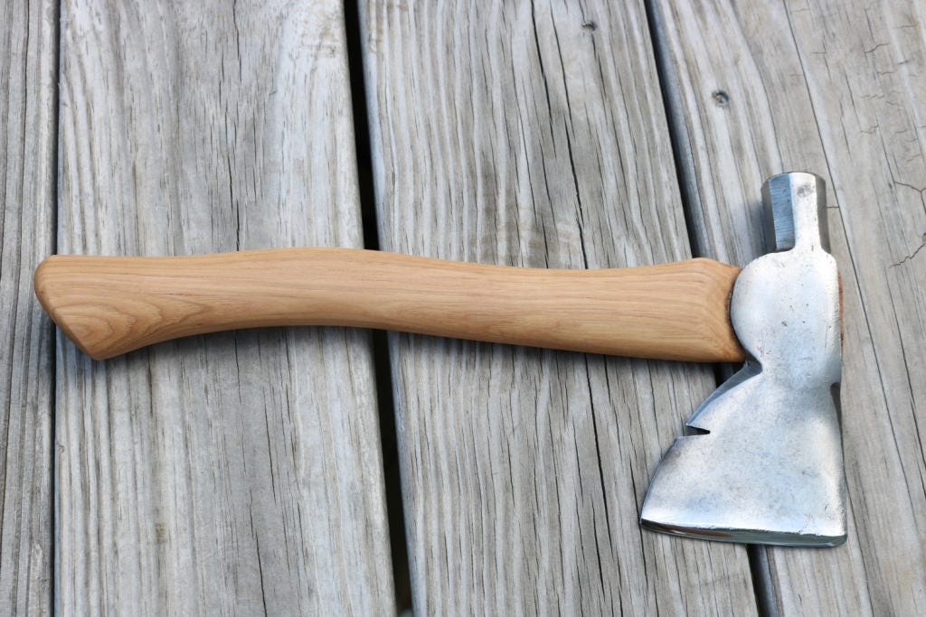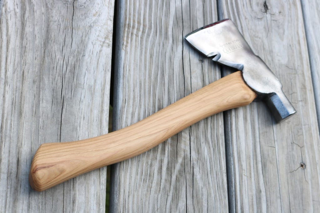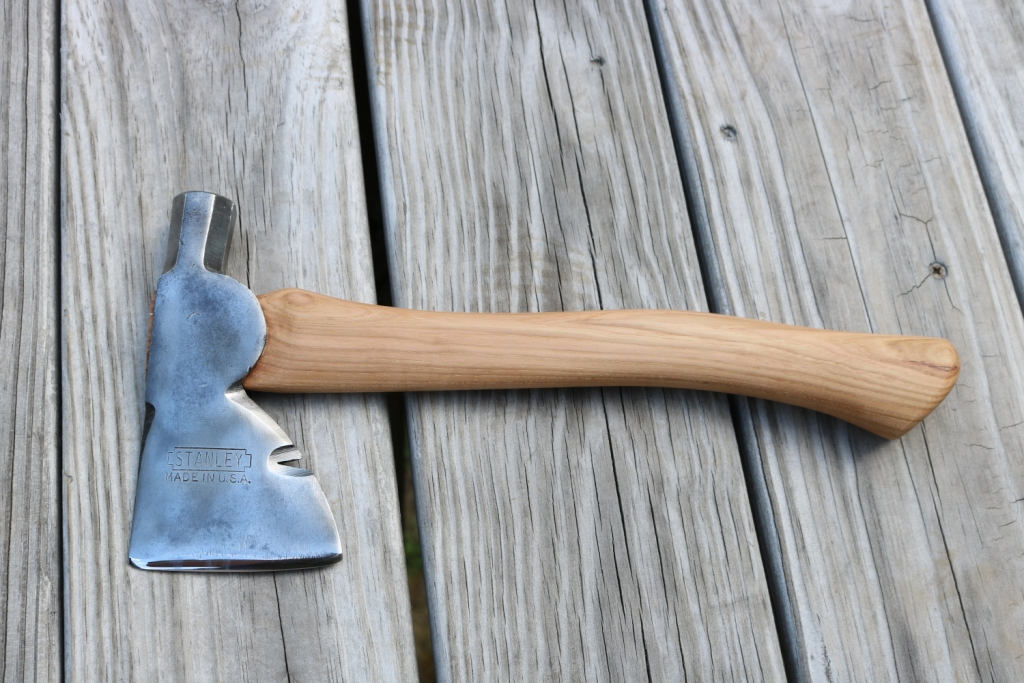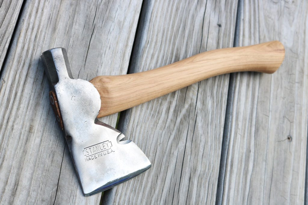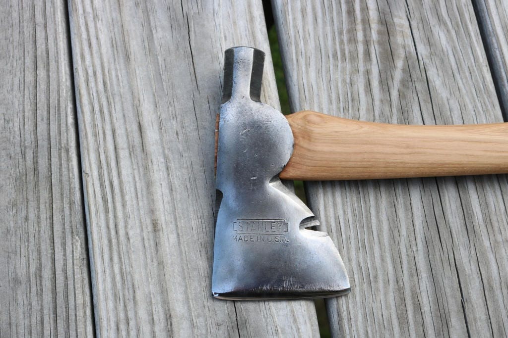 Vintage Stanley hatchet has been cleaned and the edge sharpened .This hatchet has been hung on a new American Hickory handle .The handle has been hand sanded smooth and hand rubbed with orange oil and beeswax.Comes with a handmade leather sheath .