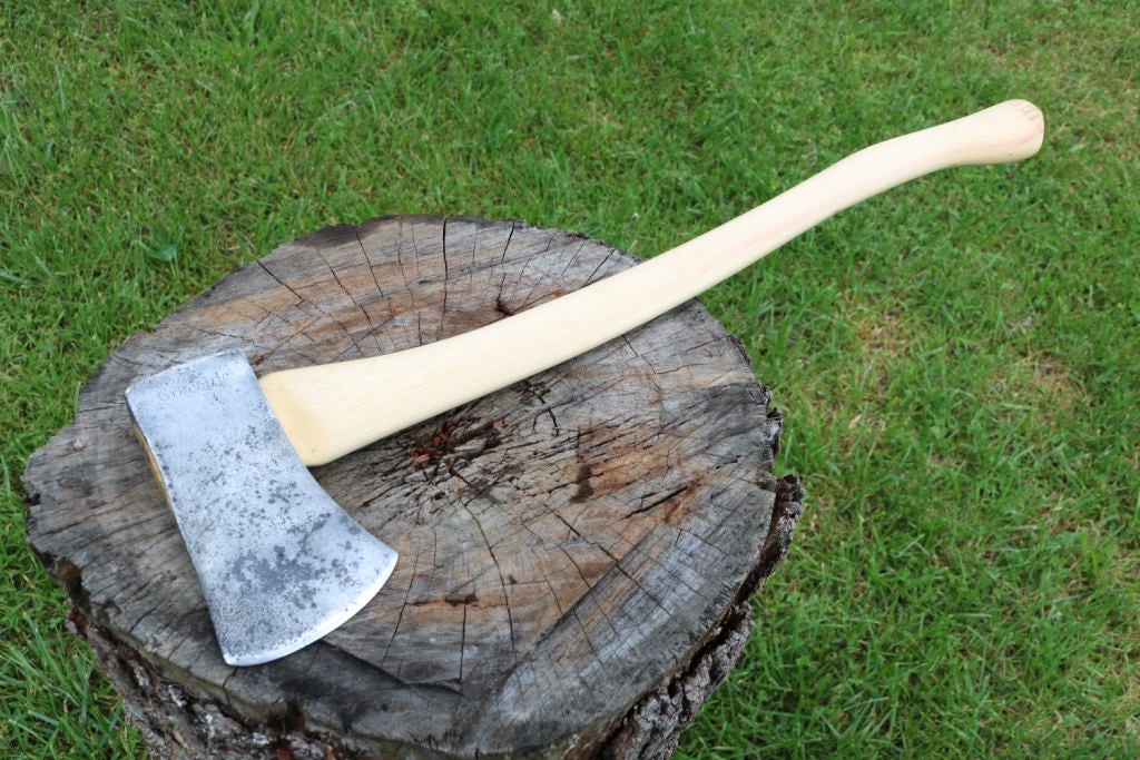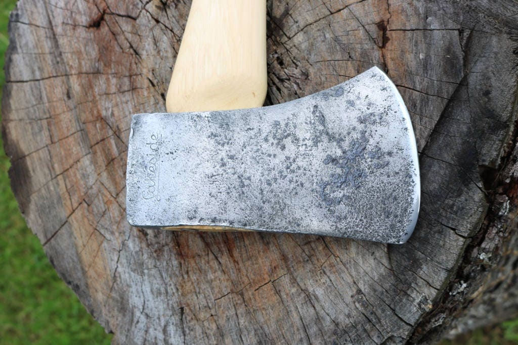 Vintage boys axe made by Lakeside has been cleaned of rust and the edge sharpened .The new American Hickory handle has been hand sanded smooth and hand rubbed with orange oil and beeswax .The handle is straight grain and the orange oil brought out some unique coloring in the grain . Comes with a hand made leather sheath .