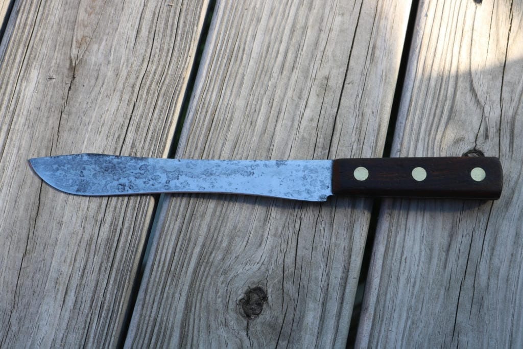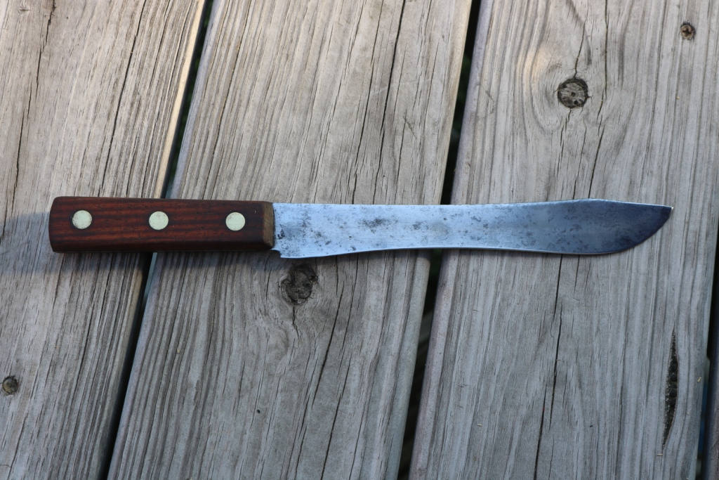 Vintage fixed blade knife has been cleaned and sharpened .The wood handles have been sanded smooth and hand rubbed with orange oil and beeswax .The overall length is 12.5 inches and the blade length is 8 inches .
