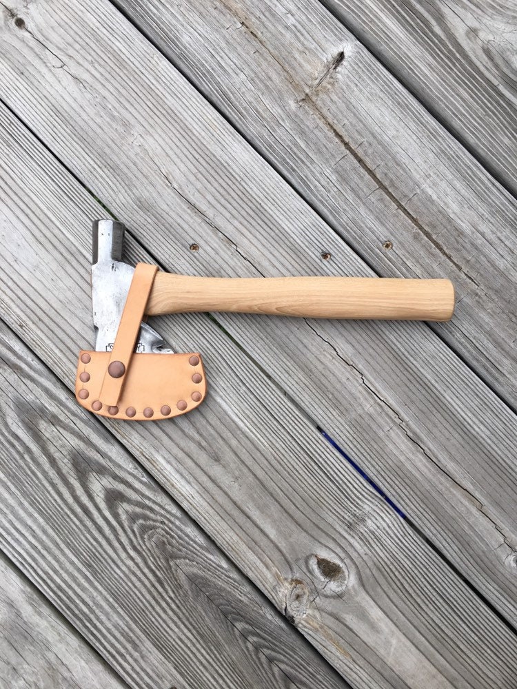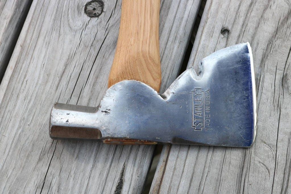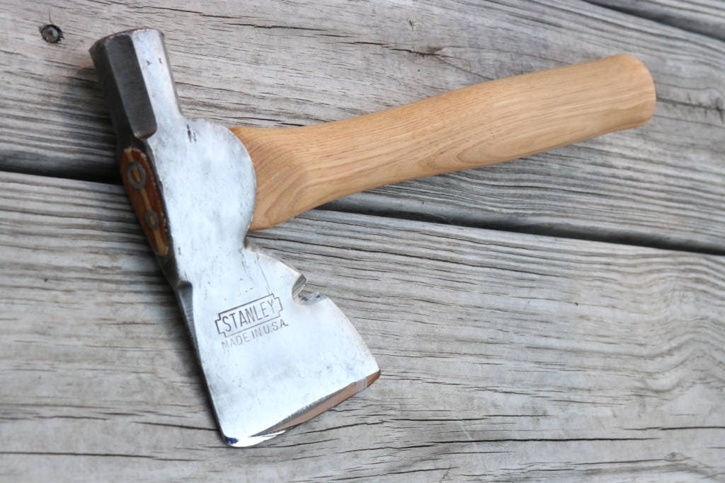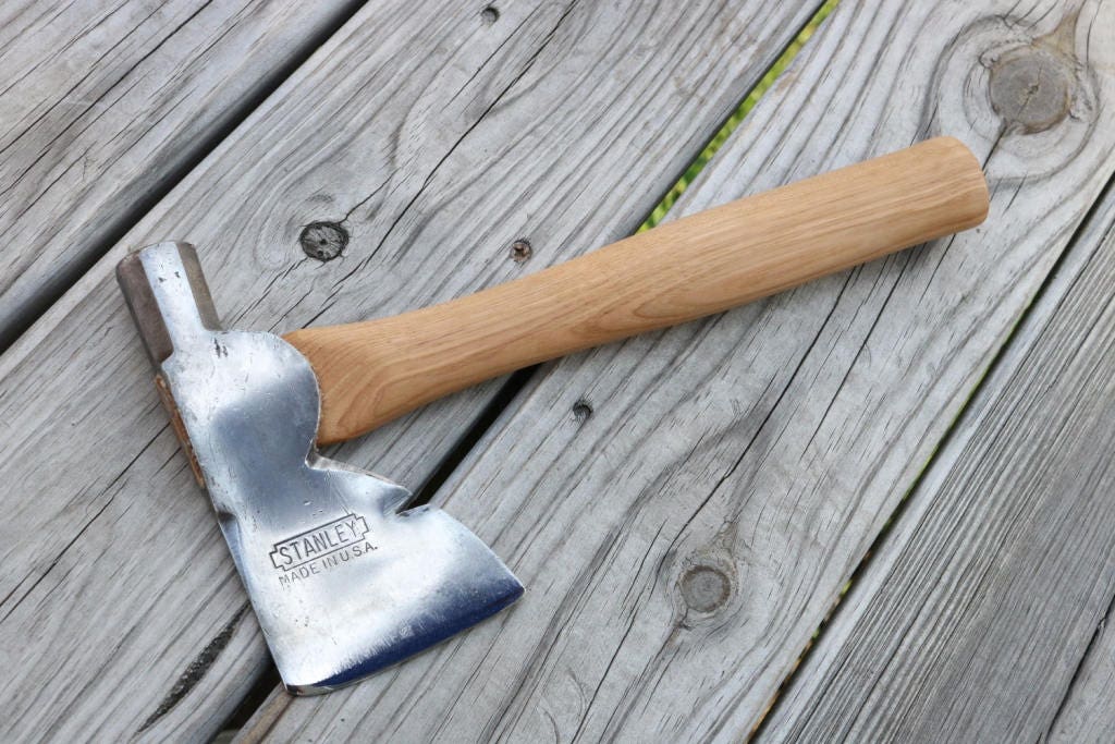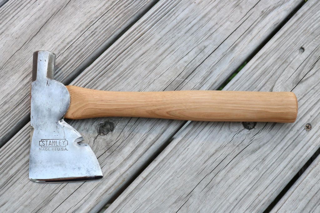 Vintage Stanley Hatchet has been cleaned of rust and dirt and the edge sharpened .The new American Hickory handle has been hand sanded smooth and hand rubbed with orange oil and beeswax.Comes with a handmade leather sheath .