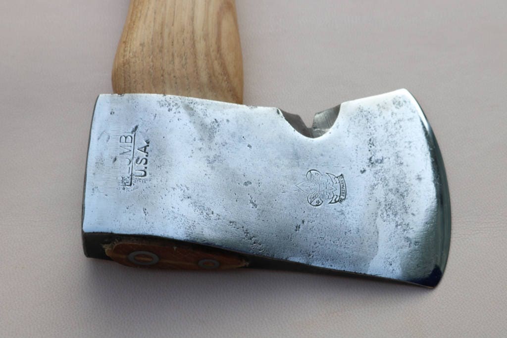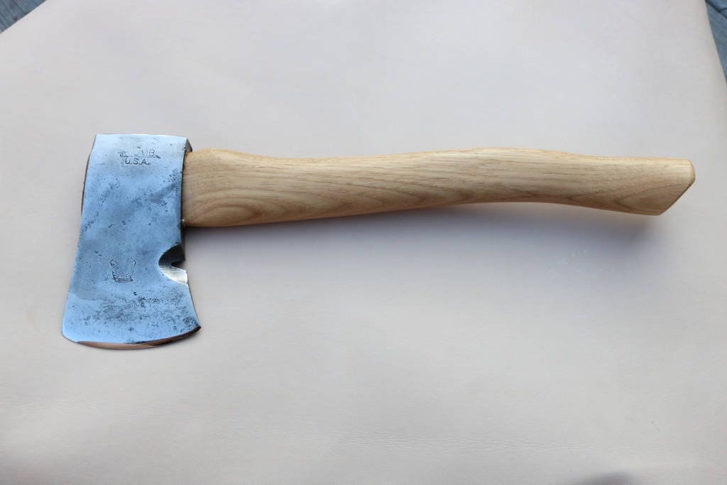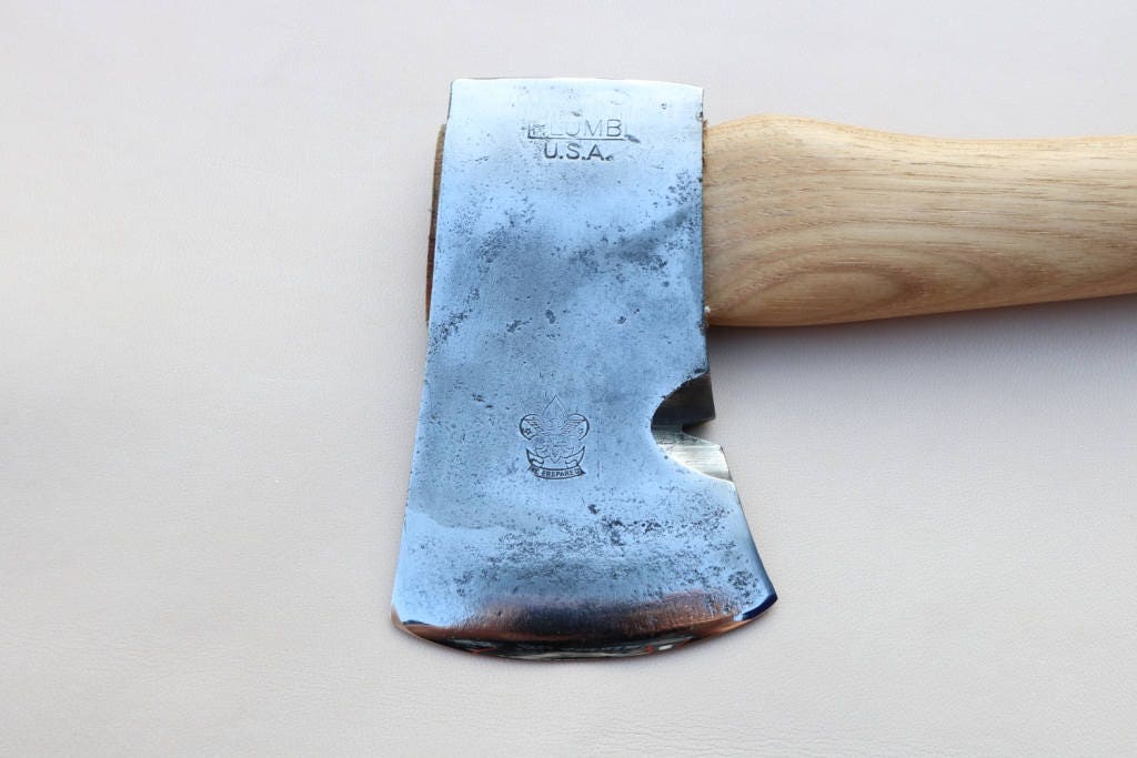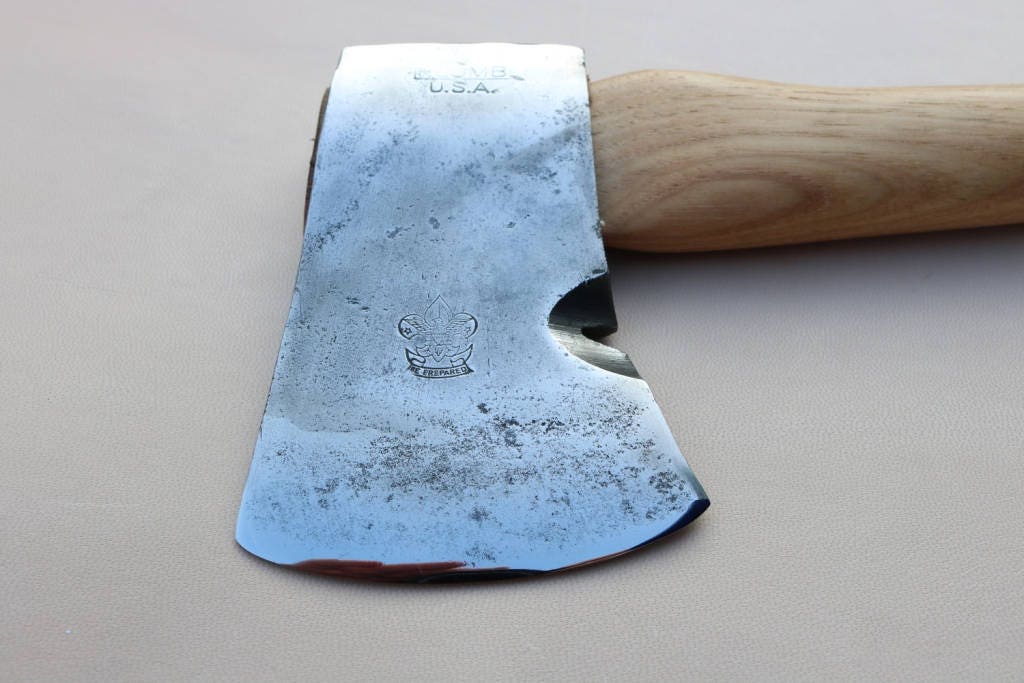 Vintage Plumb Boy Scouts of America hatchet has been cleaned and hung on a new American Hickory handle .The new American Hickory Handle has been hand sanded smooth and hand rubbed with orange oil and beeswax . Length 14 inches and weighs 1 lb 7 oz
