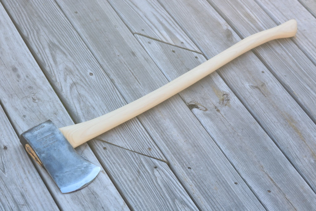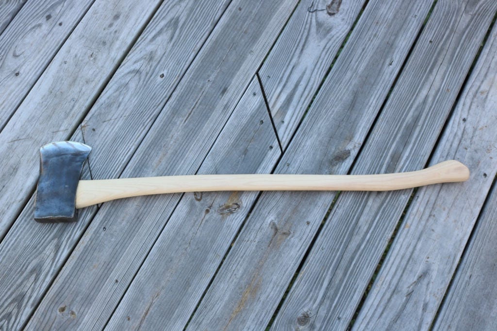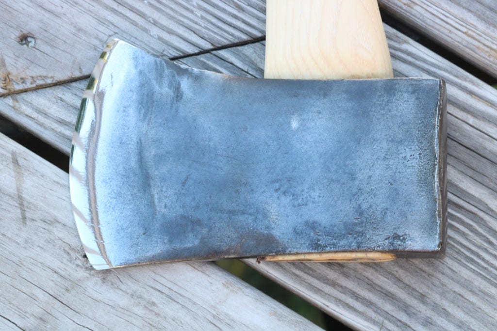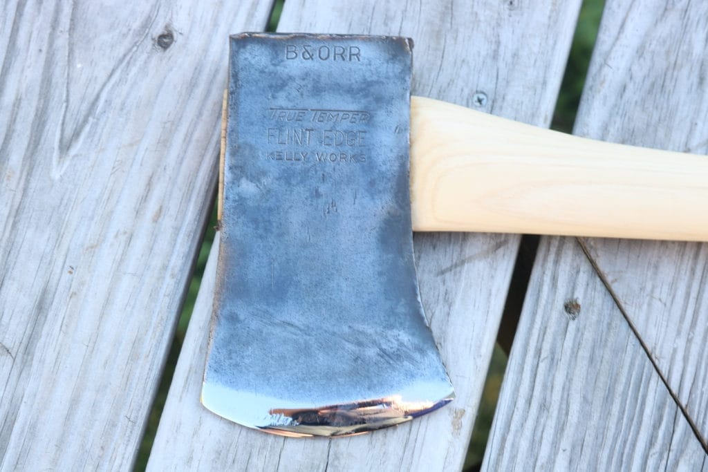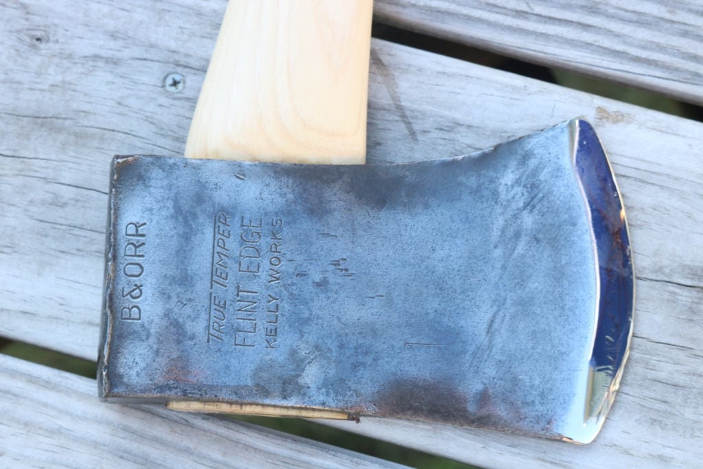 Vintage True Temper Kelly Works Flint Edge Axe has been cleaned of rust and the edge sharpened. The new American Hickory handle has been hand sanded smooth and hand rubbed with orange oil and beeswax. This axe has B and O rail road marking and is extremely collectible. Comes with a hand made leather sheath.
