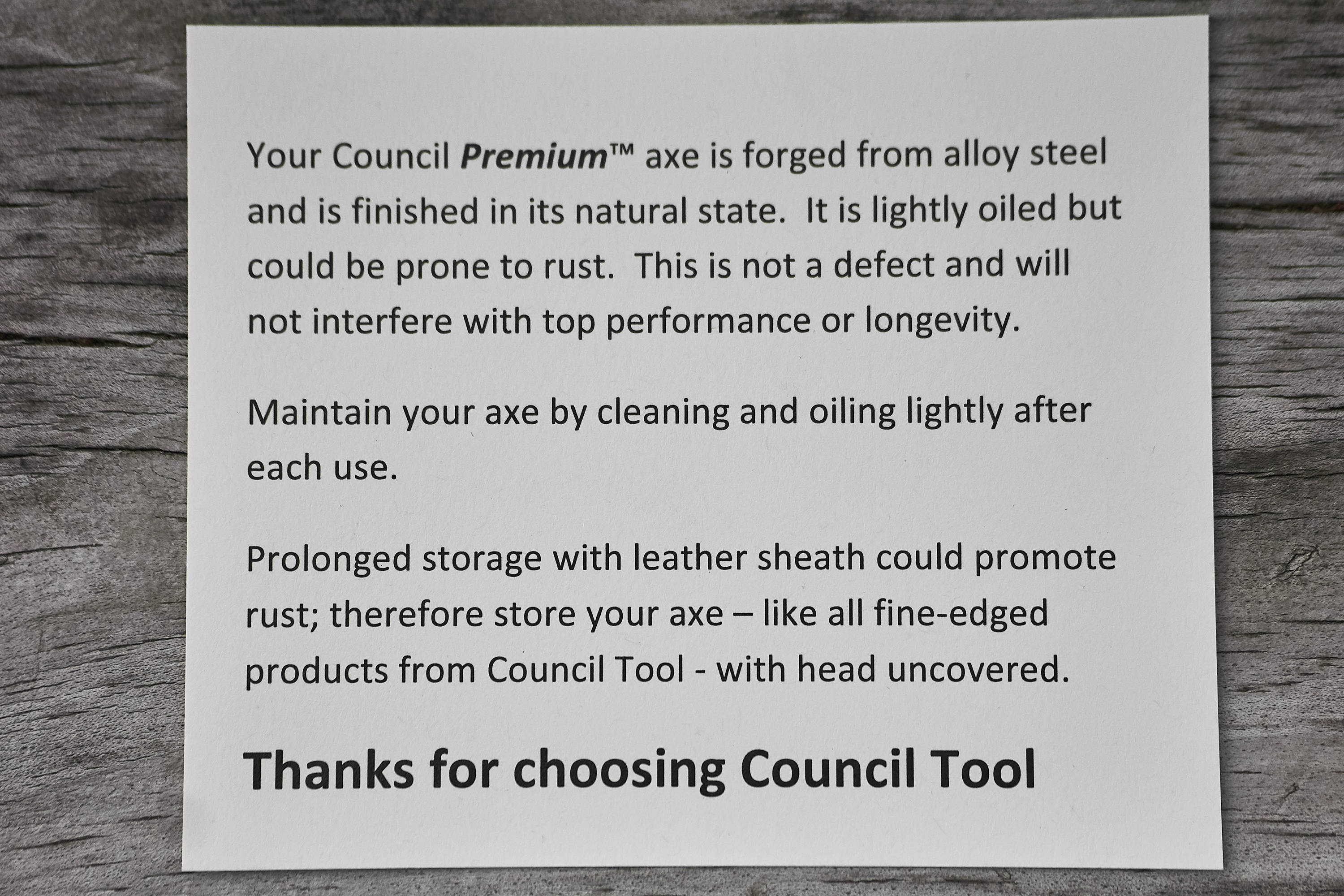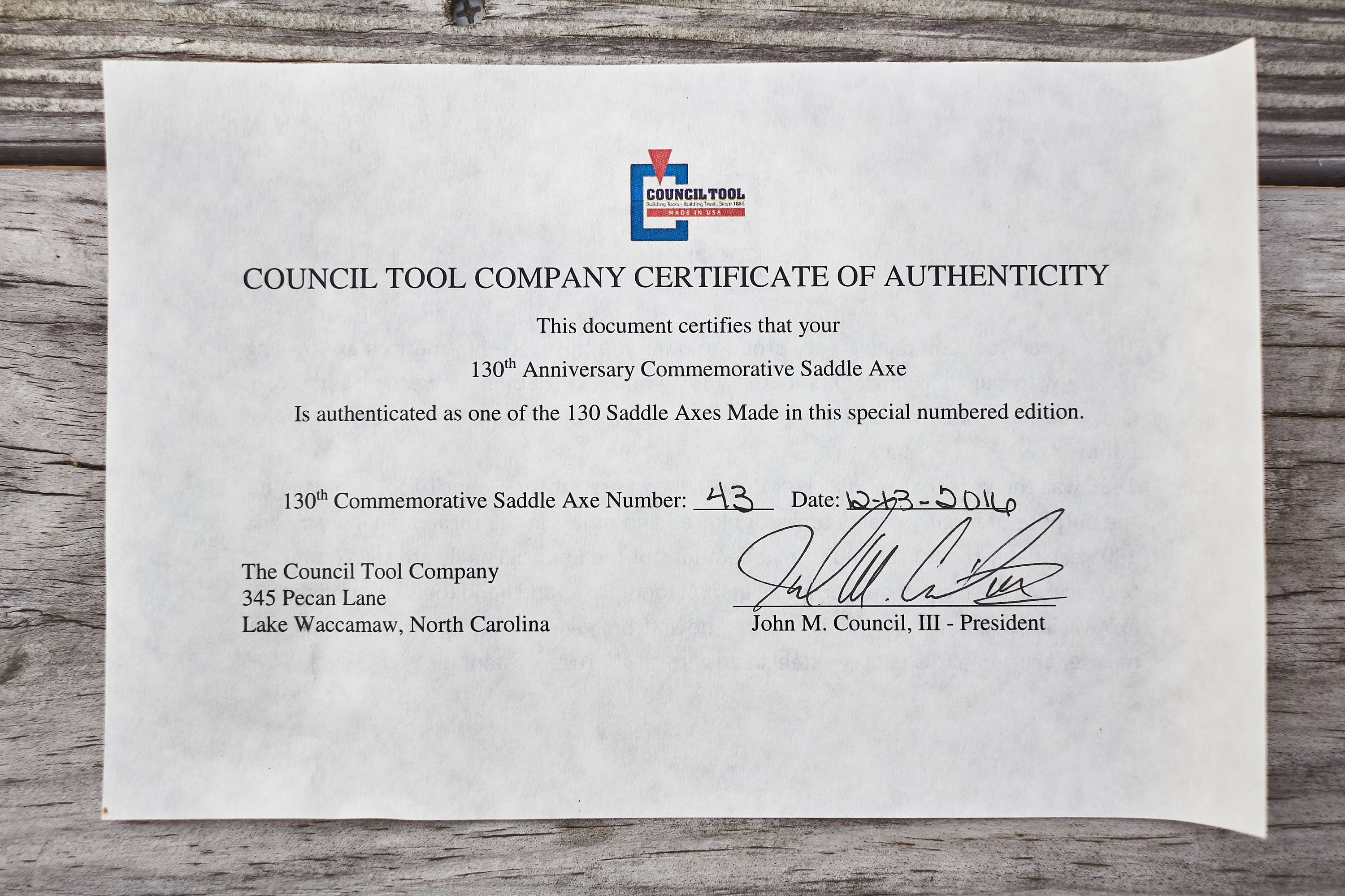 Council Tools 130 Anniversary Saddle Axe #43 of 130 made .This saddle axe has never been used it is still new in box .Only 130 of these were made to celebrate the 130 year Anniversary of the Council Tool Company .Comes with a numbered certificate of authenticity in the original box with factory paper work and factory leather sheath . 15 inches long ,weighing 2 lb 10 oz