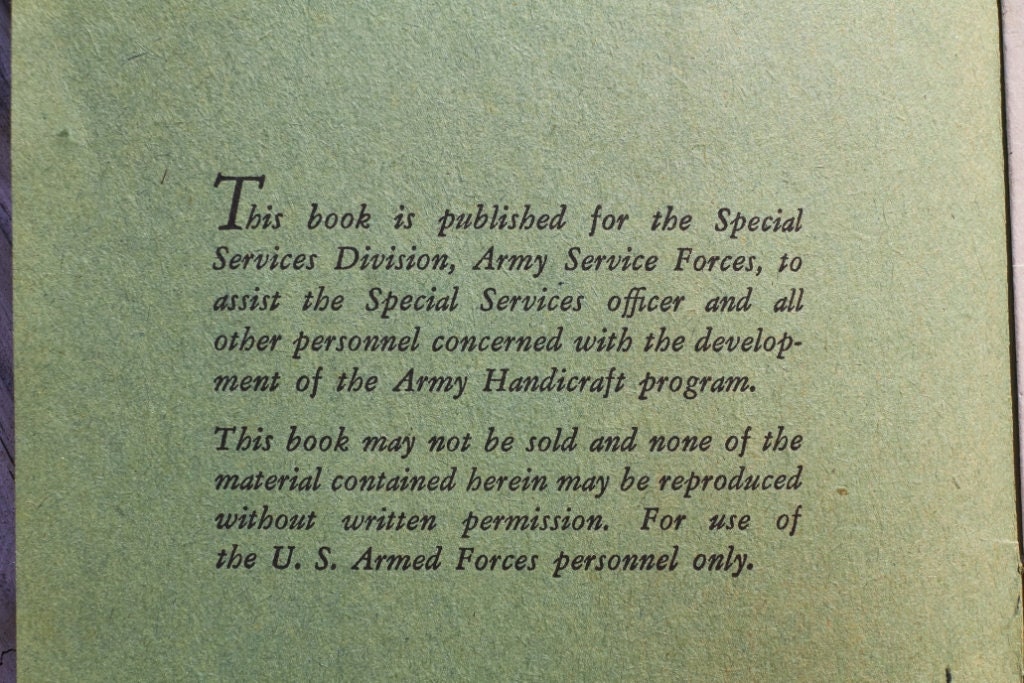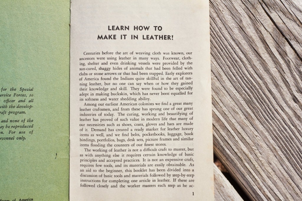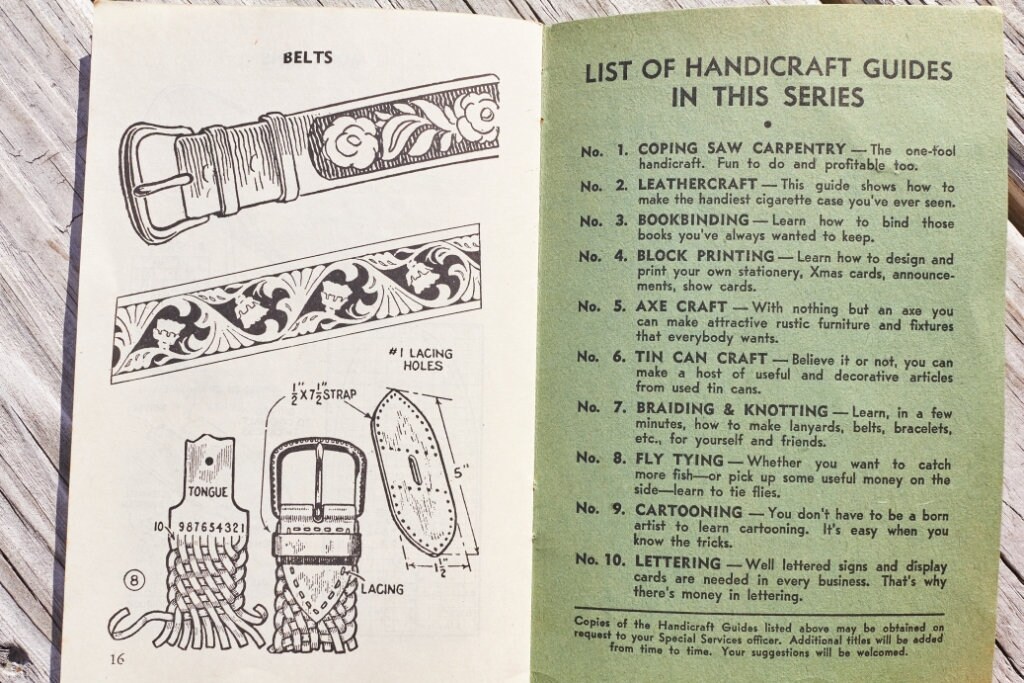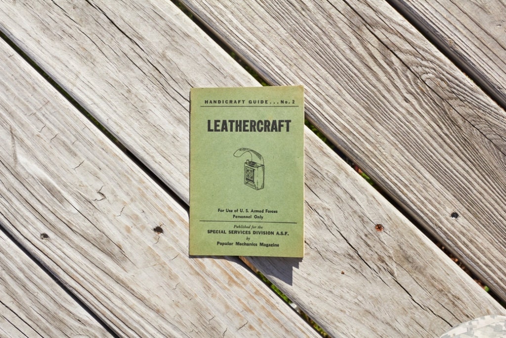 Vintage Leathercraft Guide book printed by Popular Mechanics for US Armed Forces use .This is handicraft Guide Book No 2 .16 pages .