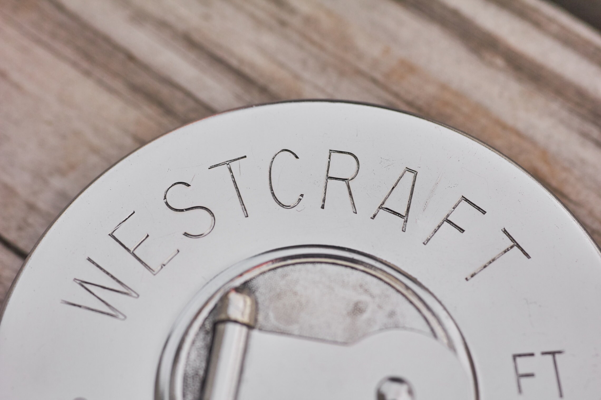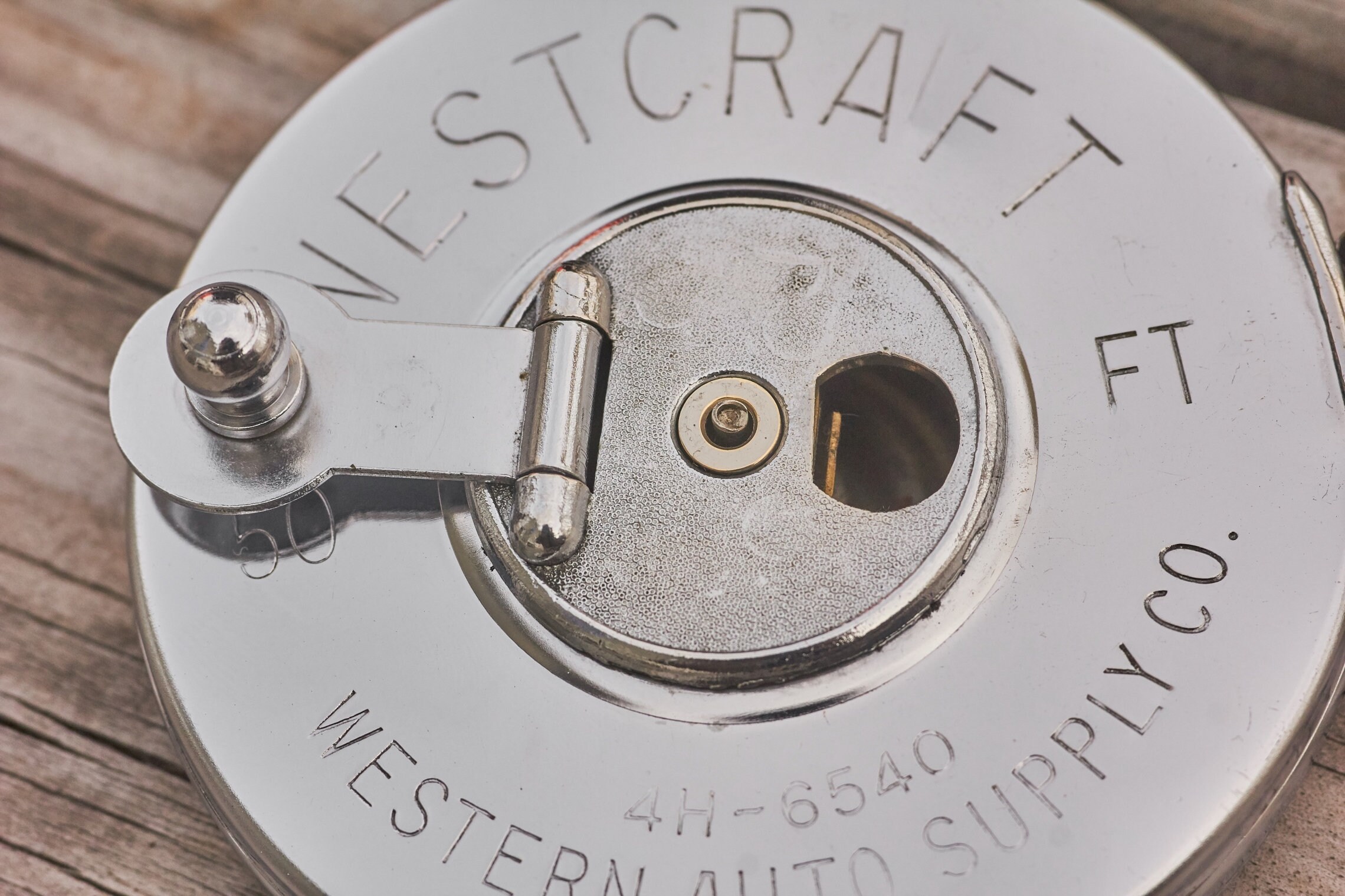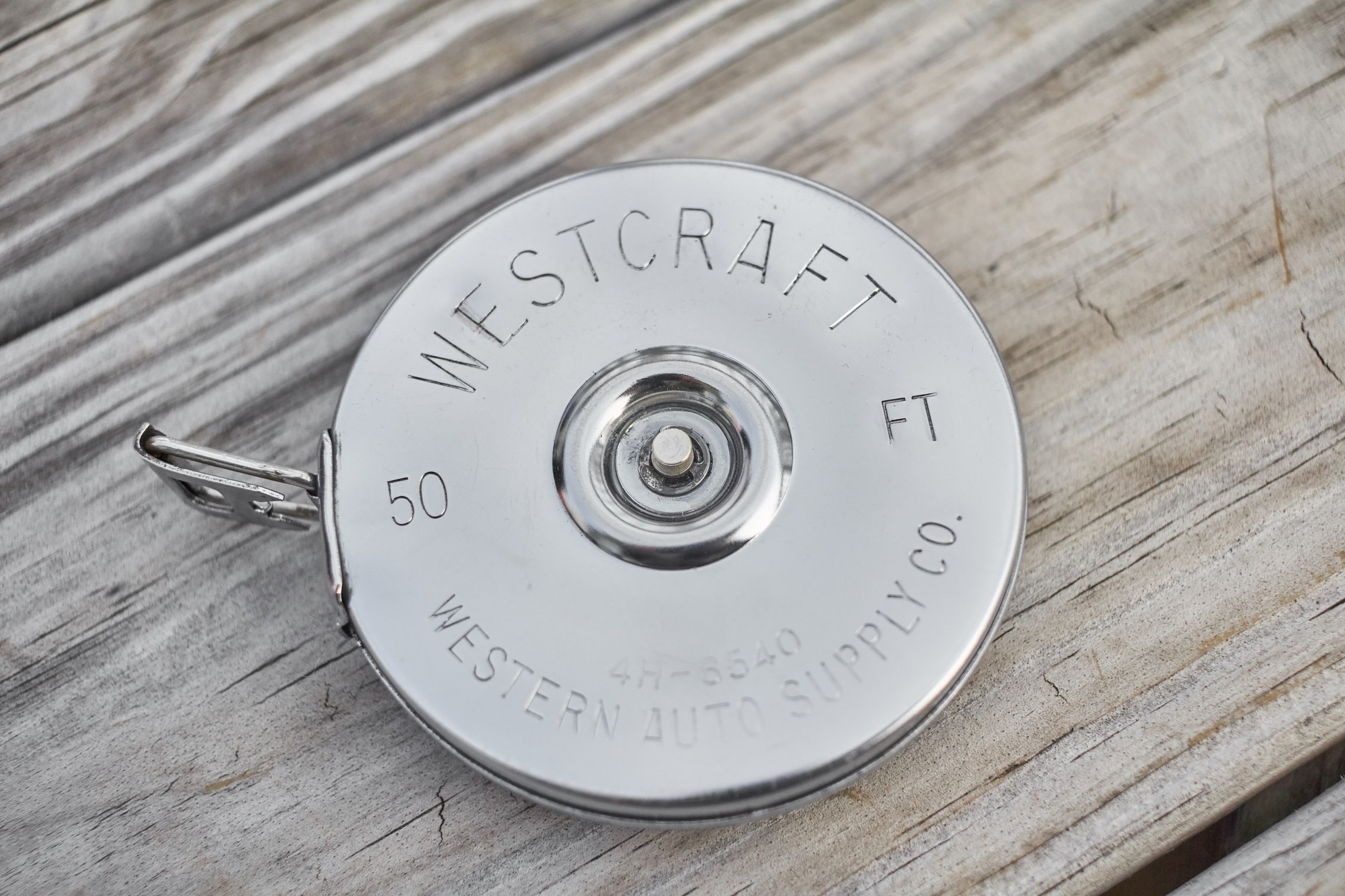 Vintage Westcraft 50 foot steel tape measure has been cleaned and tested and ready to work .This is from Western Auto Supply Co and in good condition .
