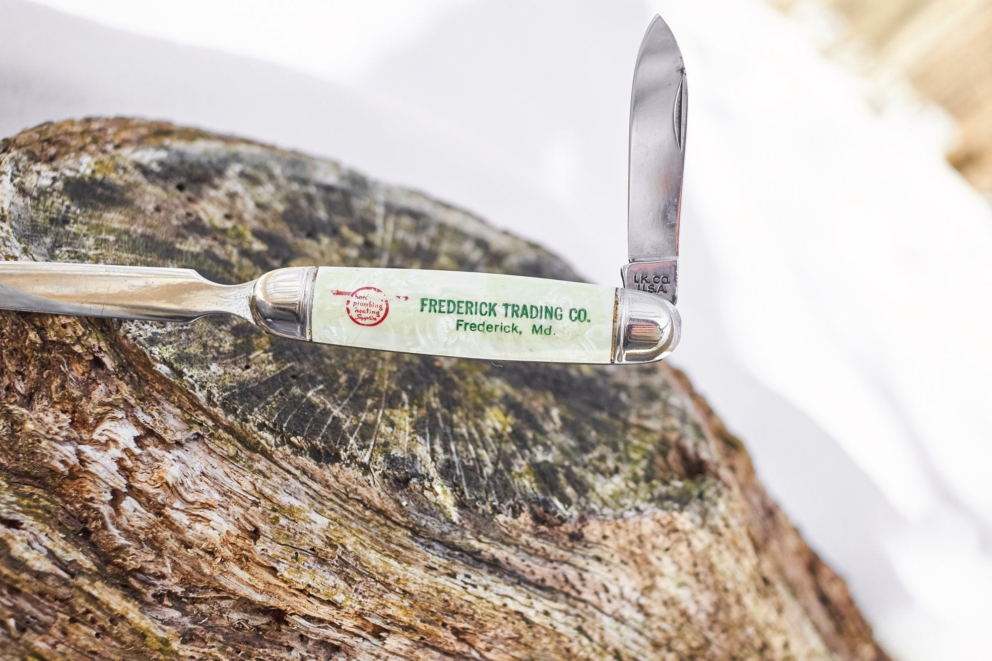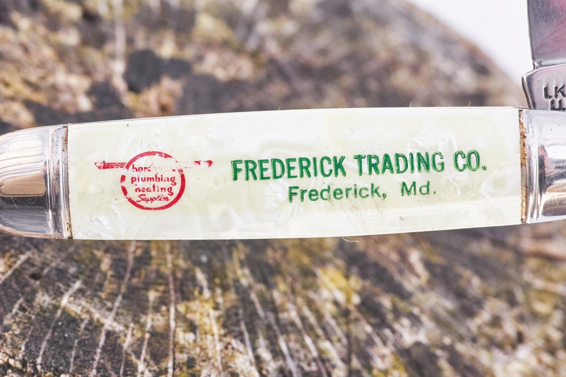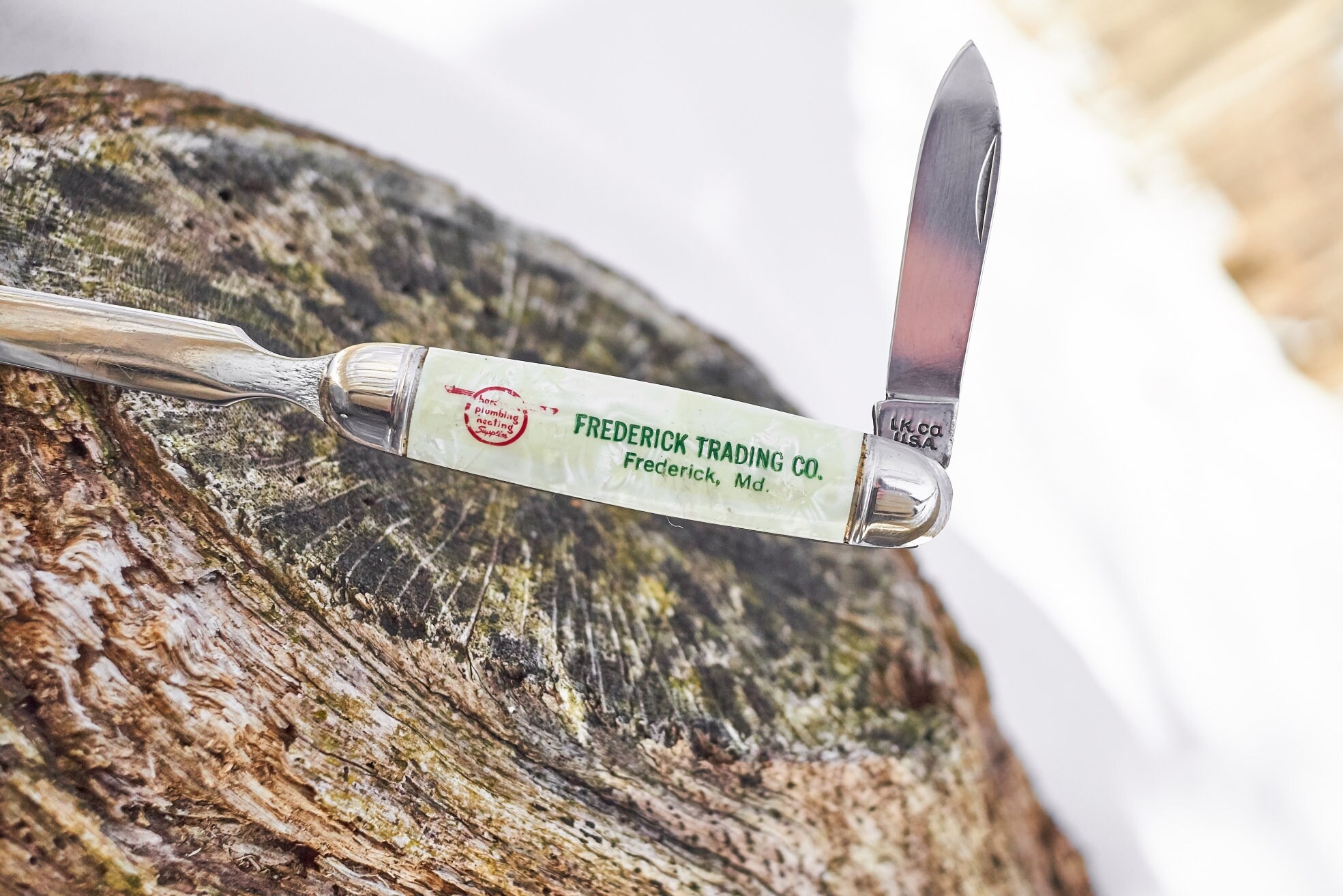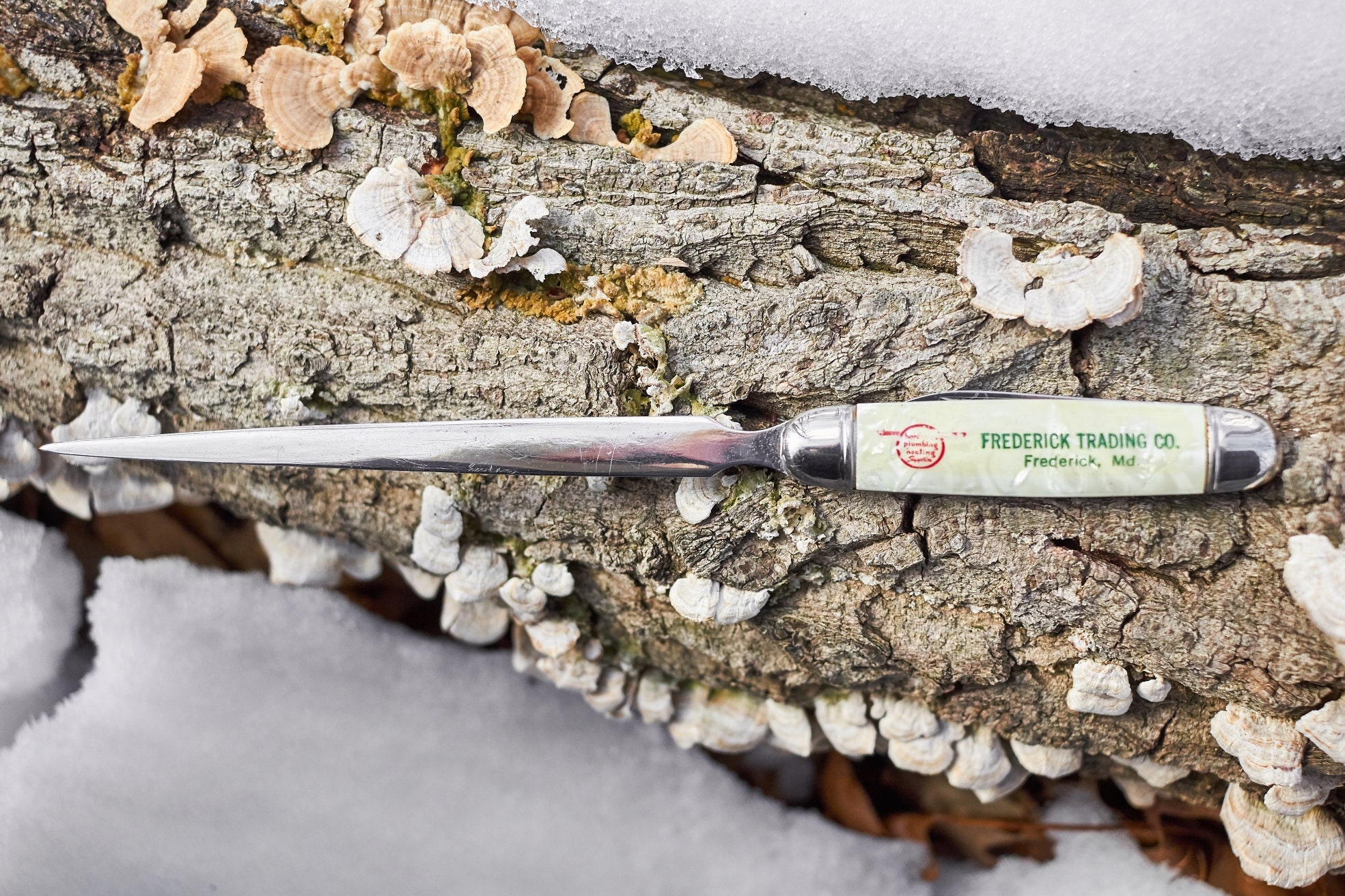 Vintage Frederick Trading Company letter opener pocket knife has been cleaned and sharpened .This is a very cool advertising collectible in good shape and ready to use or add it to your collection . length 9 inches