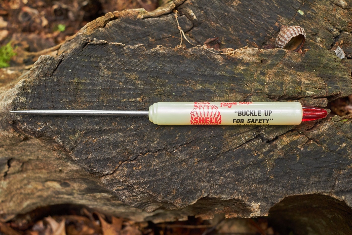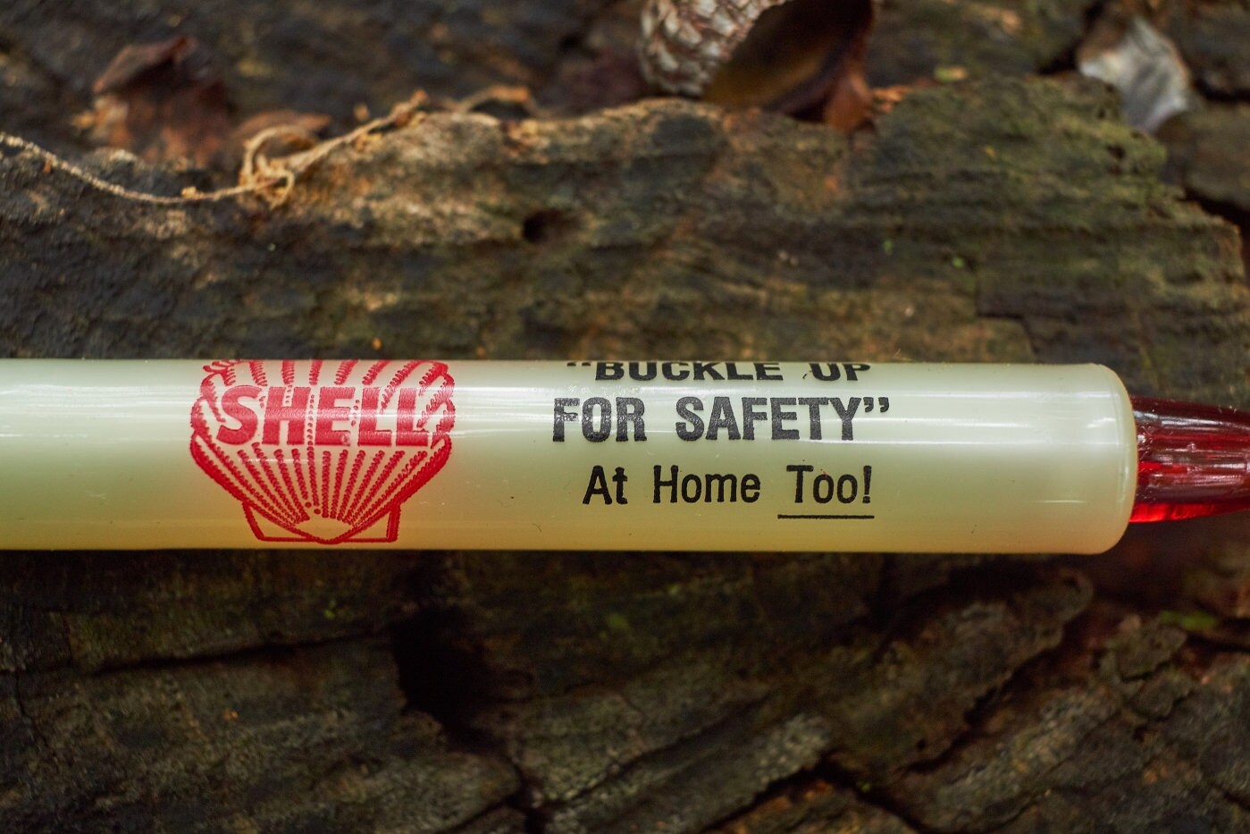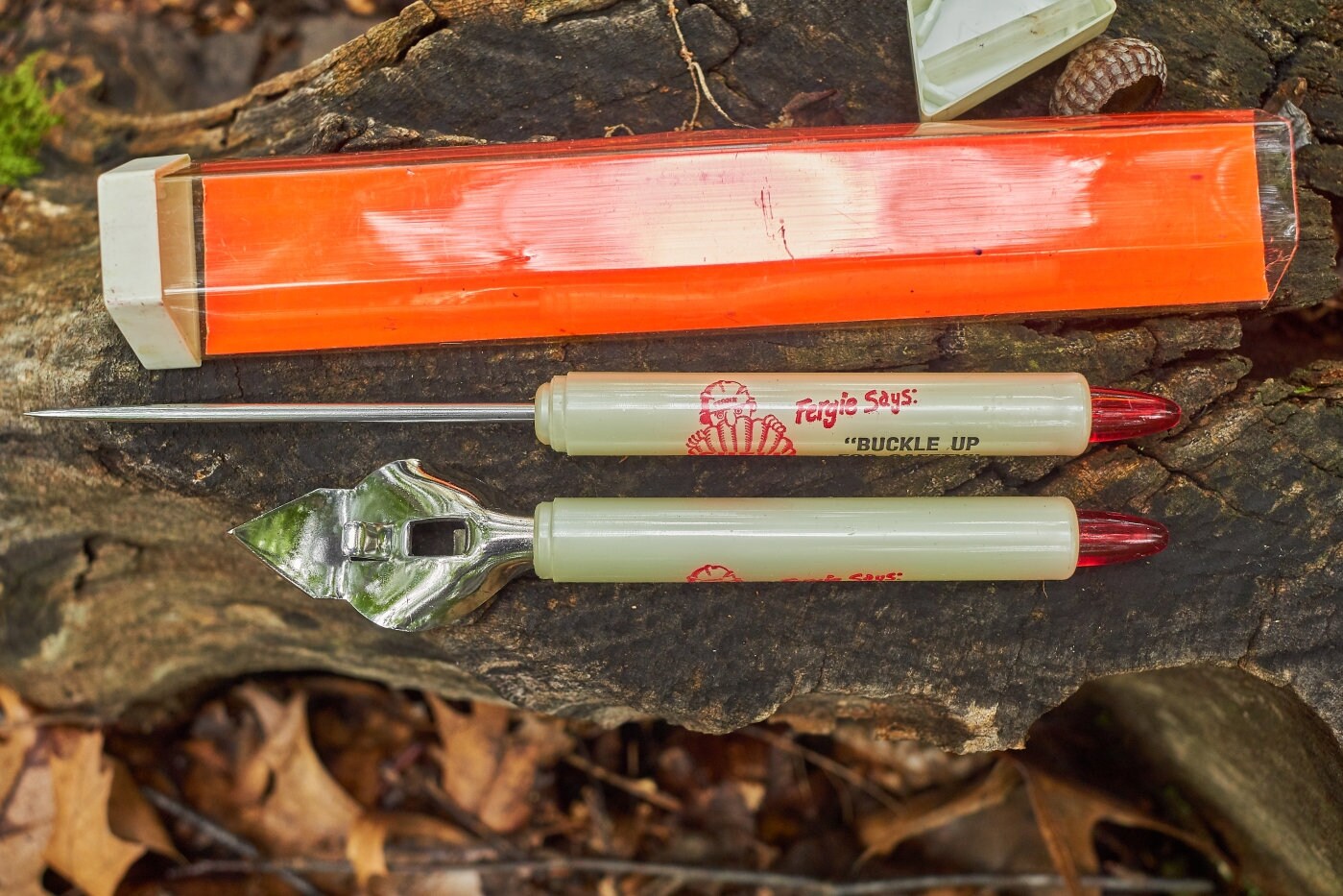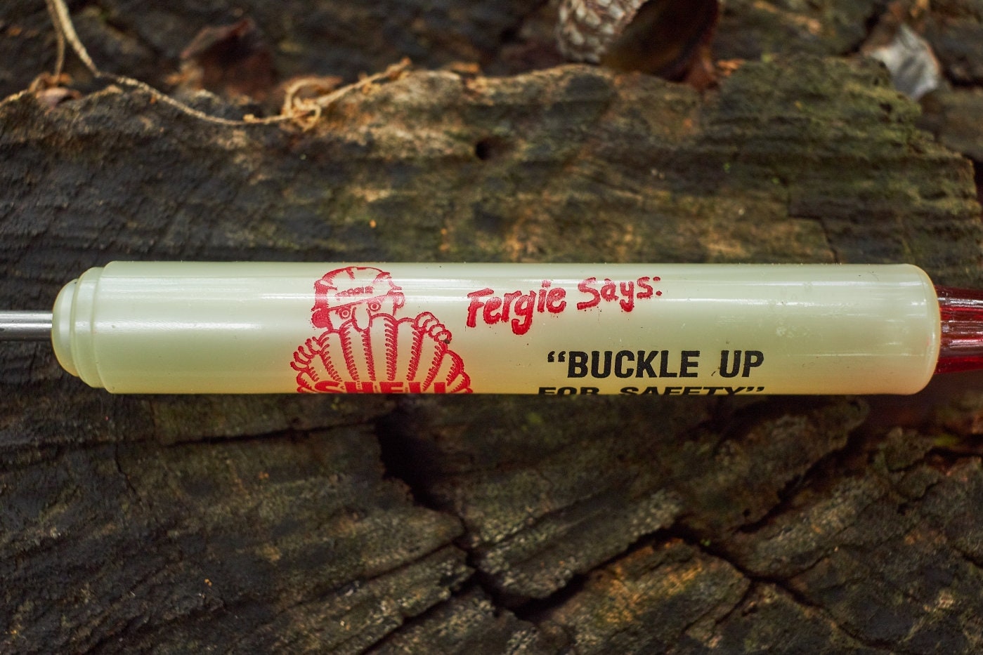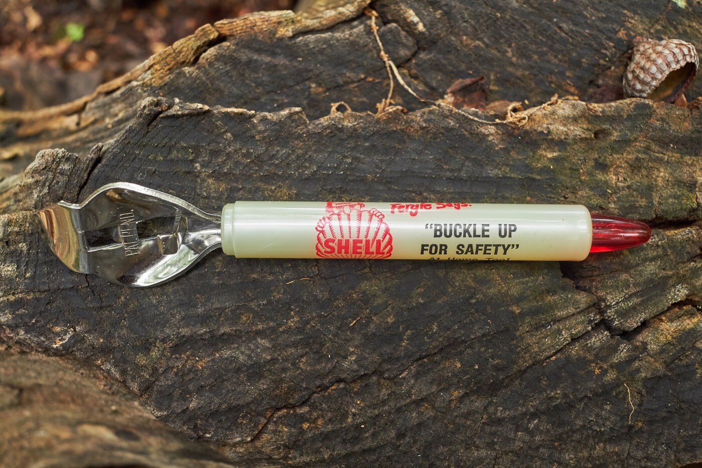 Vintage Shell Gas Station ice pick and bottle opener set .Fergie Says Buckle Up for Safety .This set is in good condition and in its original container . Nice vintage advertising piece from Shell Oil .
