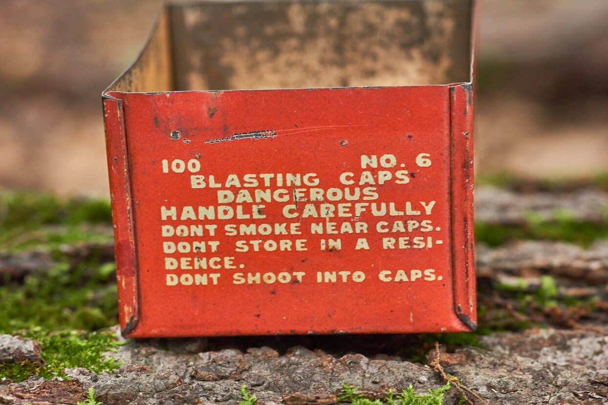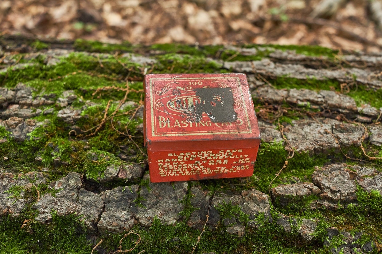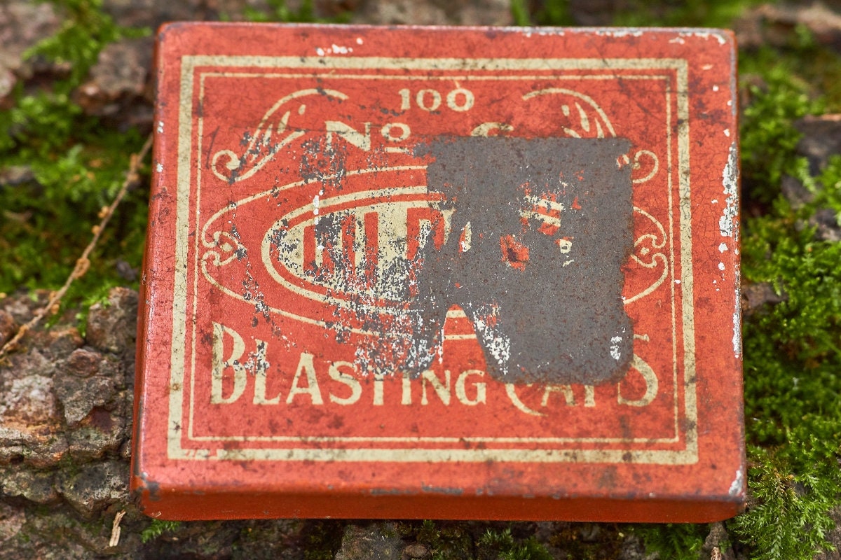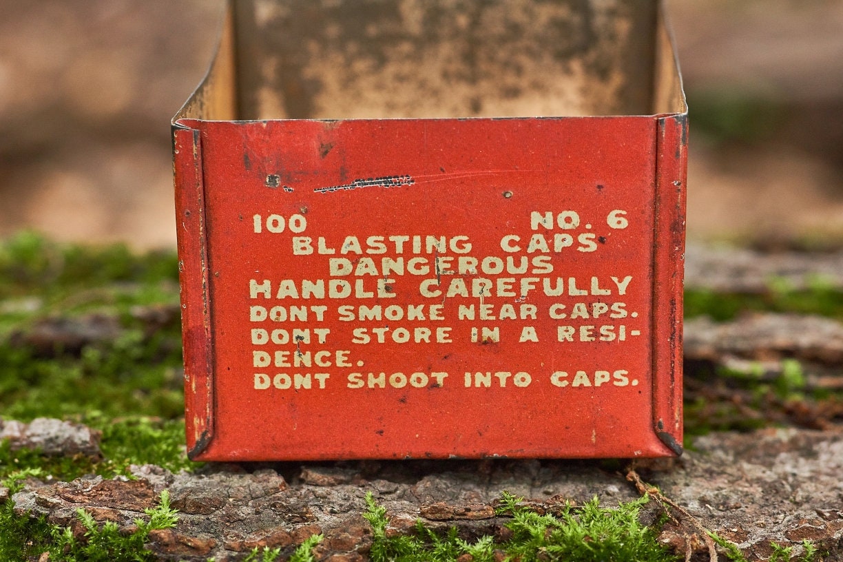 Vintage Dupont blasting cap metal box is 2 5/8 x 2 1/4 x1 1/2 in size . Very neat Americana collectible .