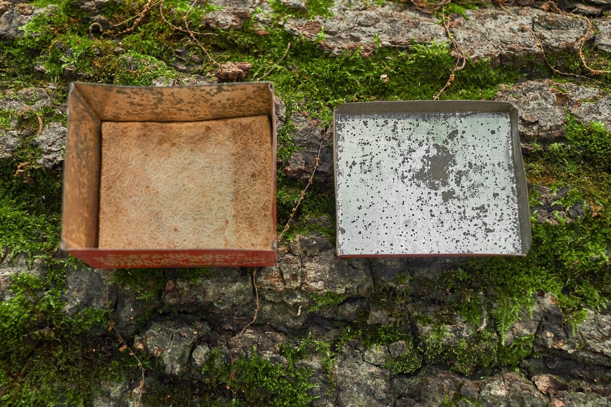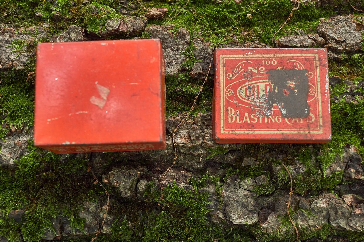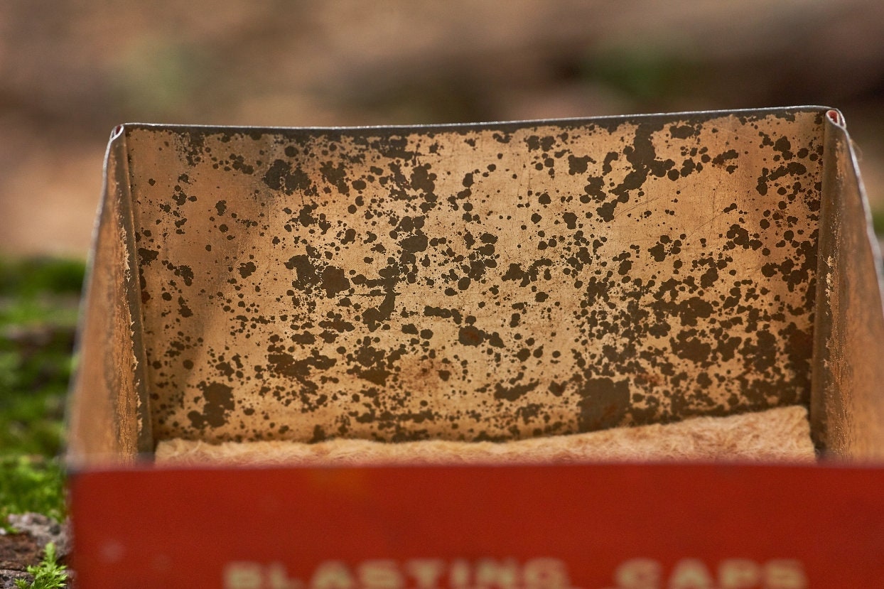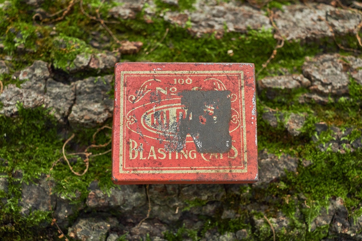 Vintage Dupont blasting cap metal box is 2 5/8 x 2 1/4 x1 1/2 in size . Very neat Americana collectible .