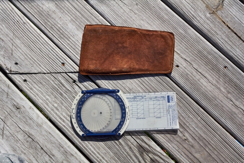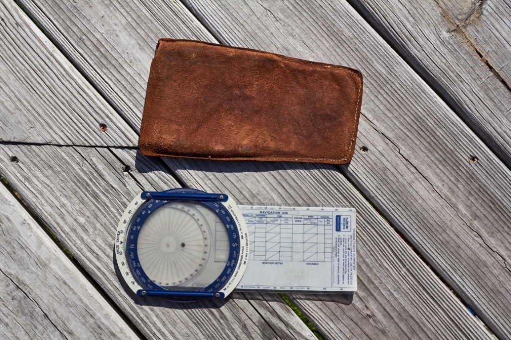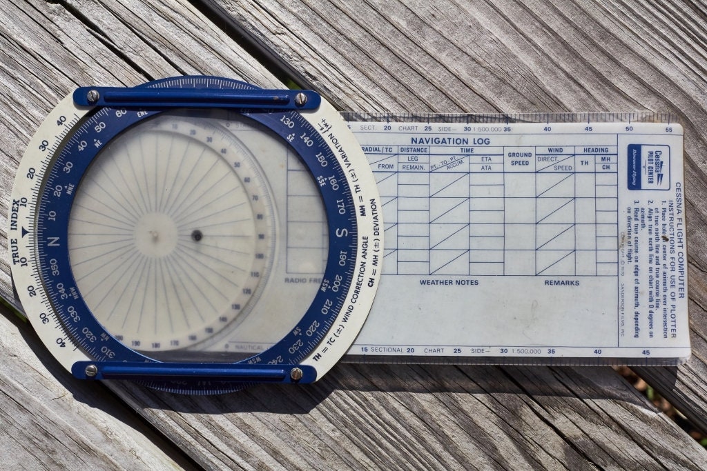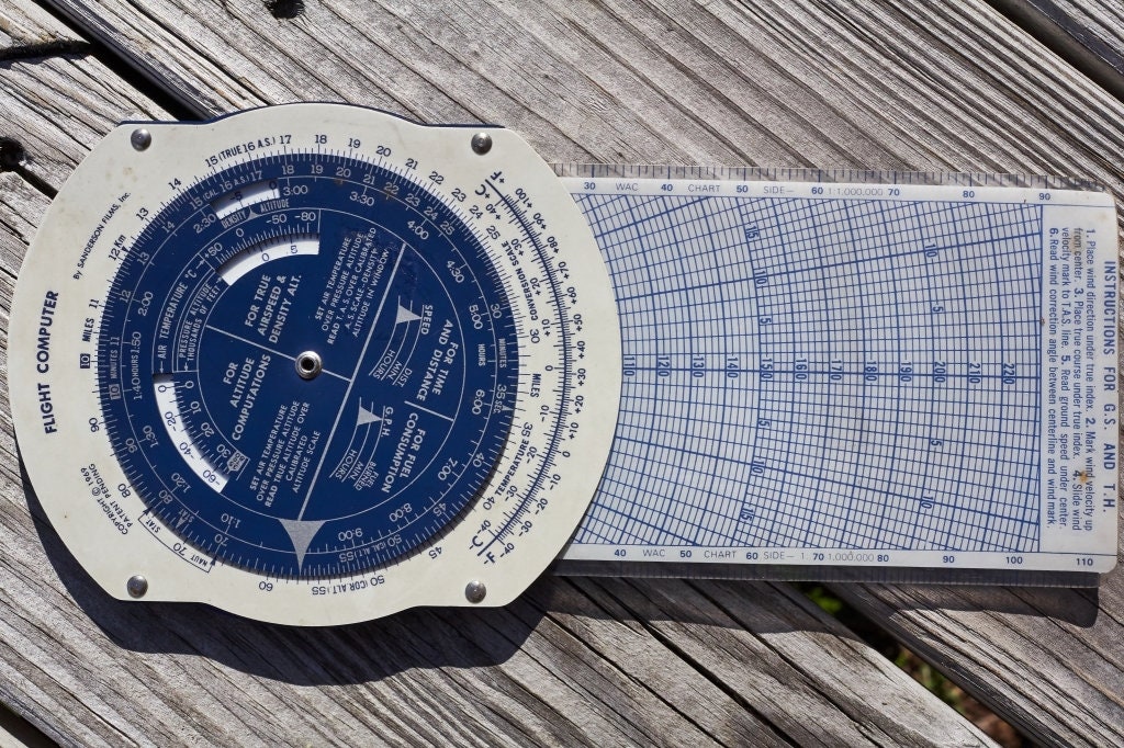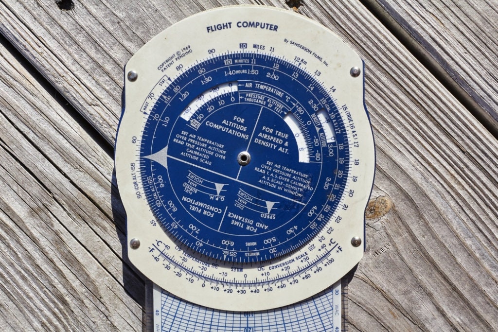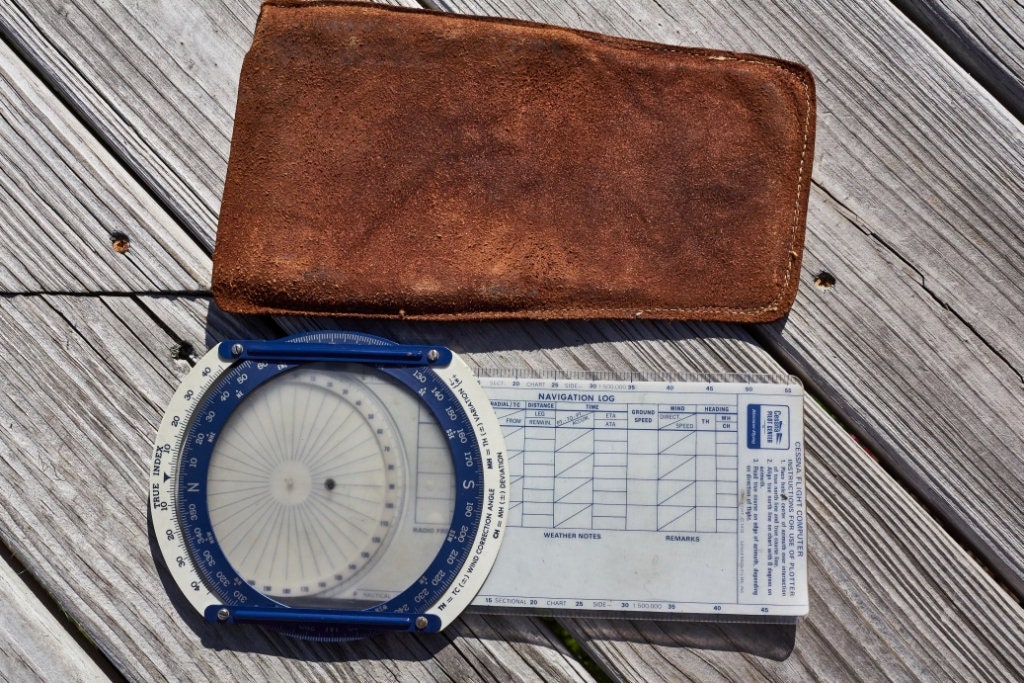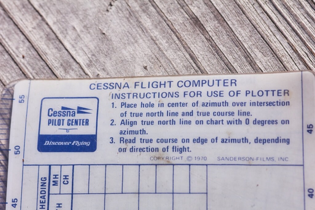 Vintage Flight computer made by Sanderson in 1970 .Has Cessna Flight Center labeling .What is really neat about this flight computer is that it belonged to Cmdr Jim Newton USN ret. USS Leyte VB 74 . His name is written on the outside of the leather case.