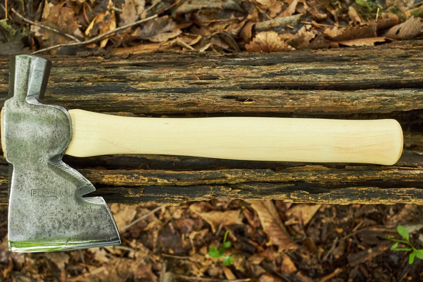 Vintage Plumb hatchet has been cleaned of rust and the edge sharpened .This hatchet was hung on a new 13 inch American Hickory handle . The new handle was hand sanded smooth and hand rubbed with orange oil and beeswax .Comes with a handmade leather sheath . Length 13 inches and weighs 1 lb 11 oz
