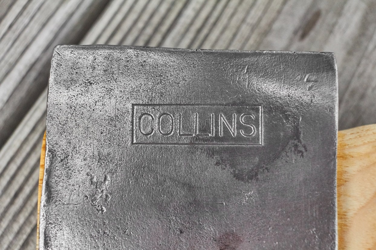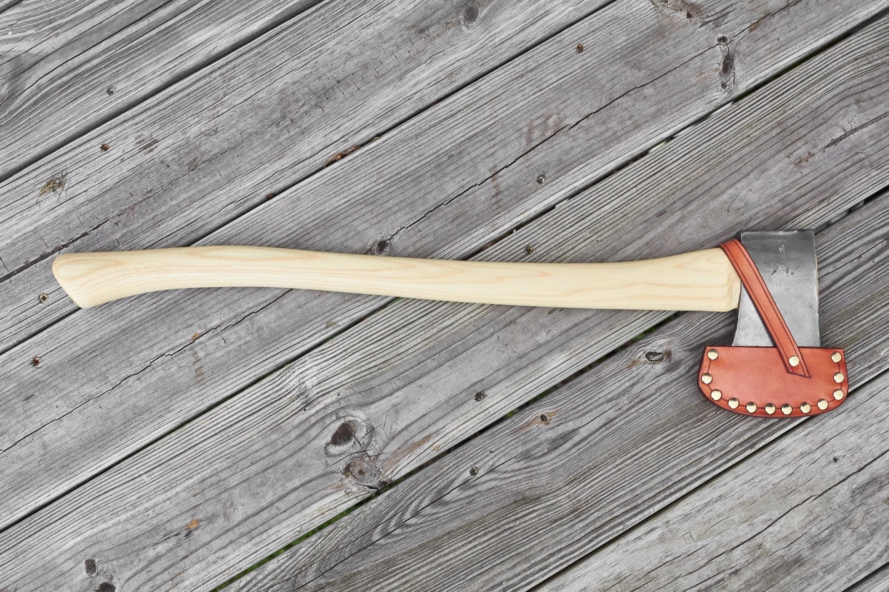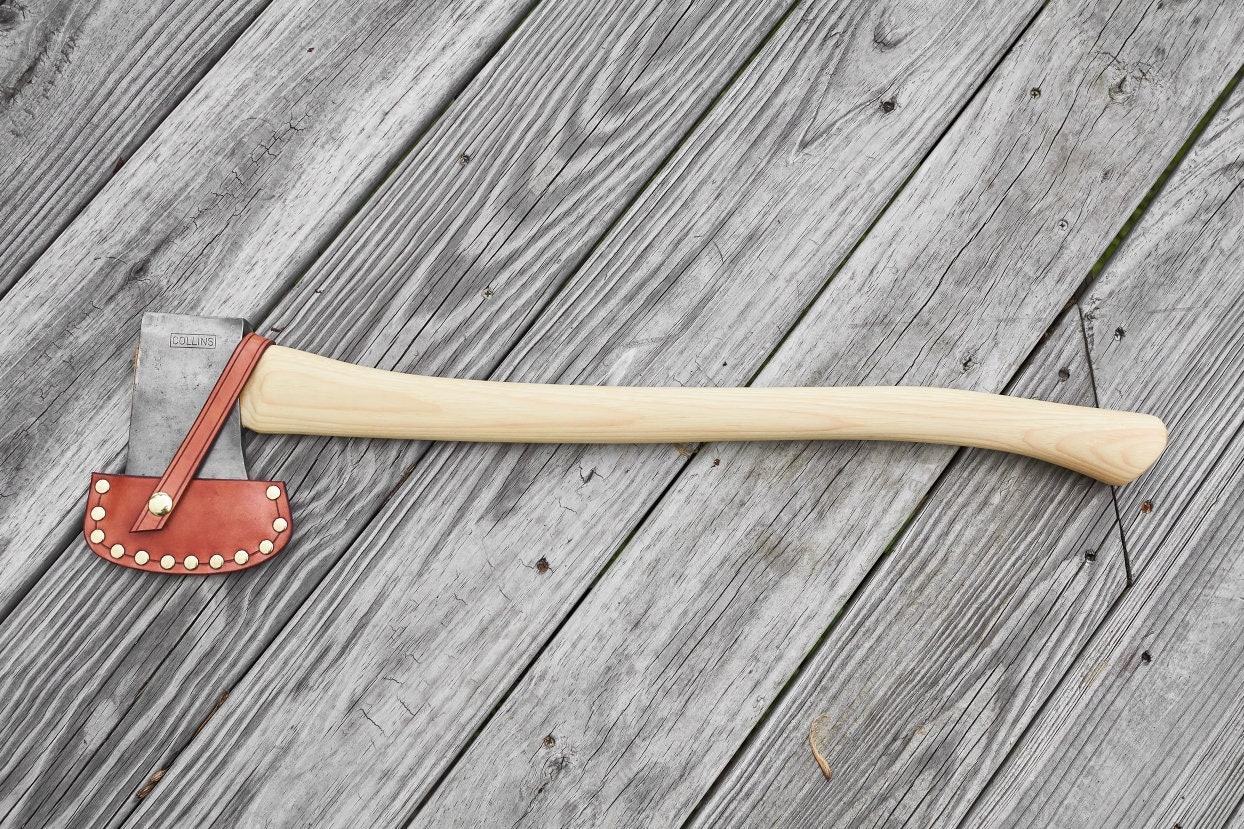 Vintage Collins Boys axe has been cleaned and sharpened and hung on a new American Hickory handle .The American Hickory handle has been hand sanded smooth and hand rubbed with orange oil and beeswax . The leather sheath was hand crafted right here in our Appalachiann Axeworks shop .Overall length is 27 inches and weighs 3 lbs 5 oz .