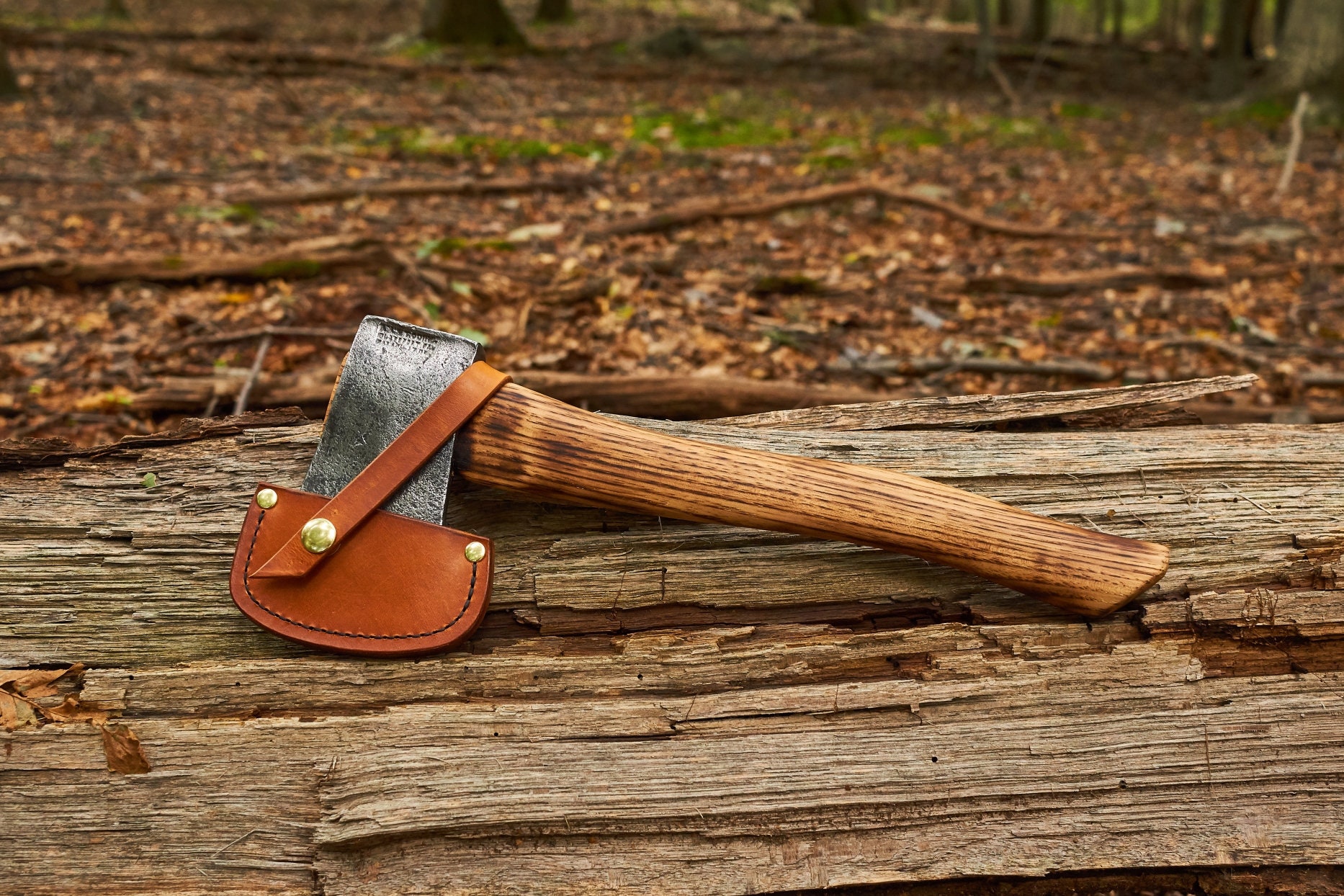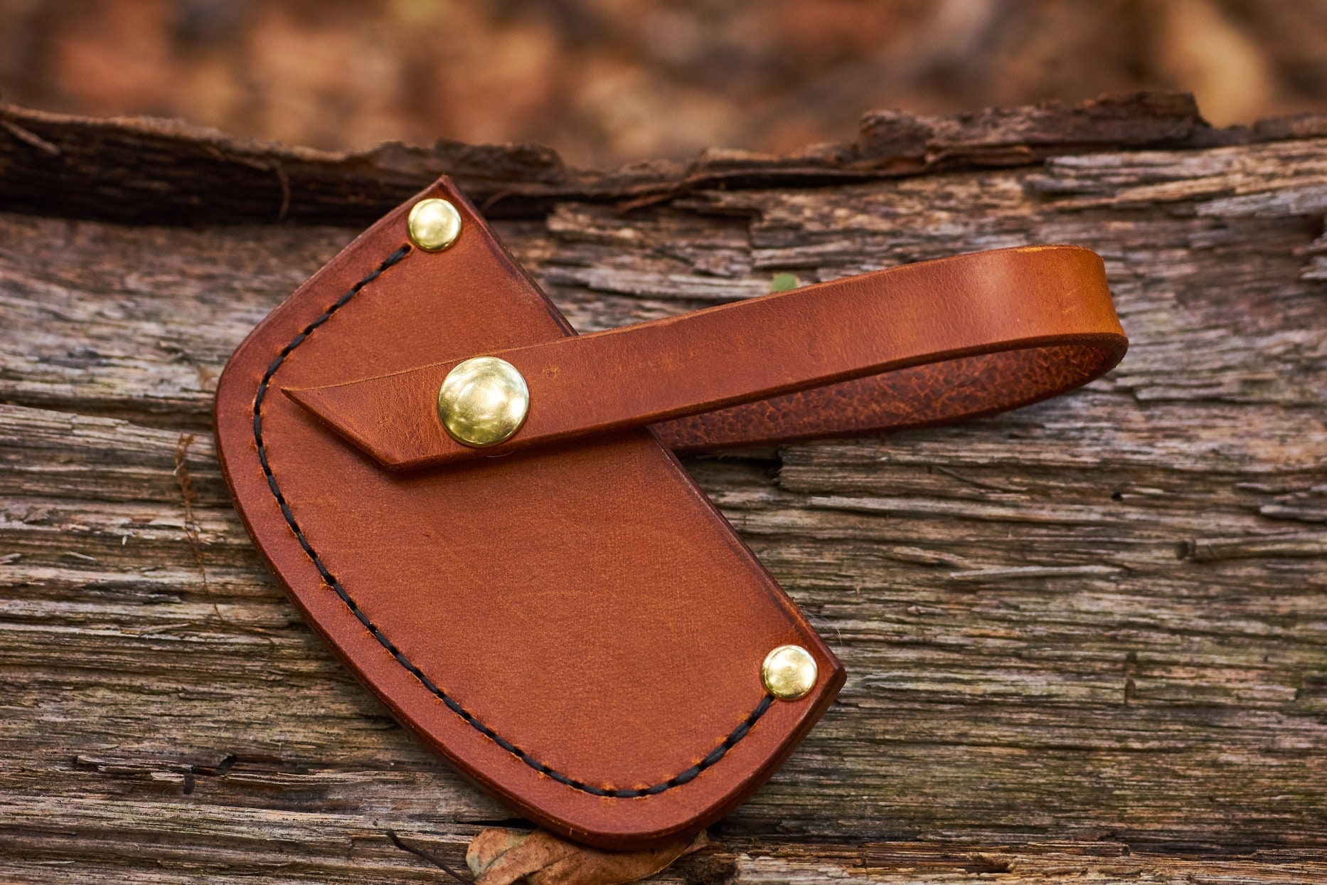Vintage American Axe and Tool Co hatchet has been cleaned and sharpened .The new American hickory handle has been hand sanded smooth and given a torch treatment and hand rubbed with orange oil and beeswax . The leather sheath was hand stitched with Tiger thread from 8/9 oz leather and given a rich saddle tan stain and finished off with brass rivets and snap . The handle is 14 inches long and total weight is 2 lbs .