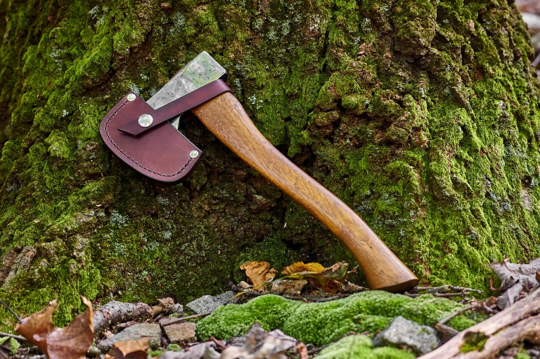 Vintage Norlund hatchet has been cleaned and sharpened .The original hickory handle was removed sanded lightly and the headd was rehung .The handle was hand rubbed with orange oil and beeswax . This hatchet is ready for your next outdoor adventure ,camping or hiking trip .The leather sheath is from 8/9 oz leather and given a deep rich mahogany stain and hand stitched with black Tiger thread and finished off with silver rivets and snap . The leather sheath was treated with Obenaufs Heavy Duty Leather Preservative . The overall length is 13 inches and weighs 1 lb 8 oz .
