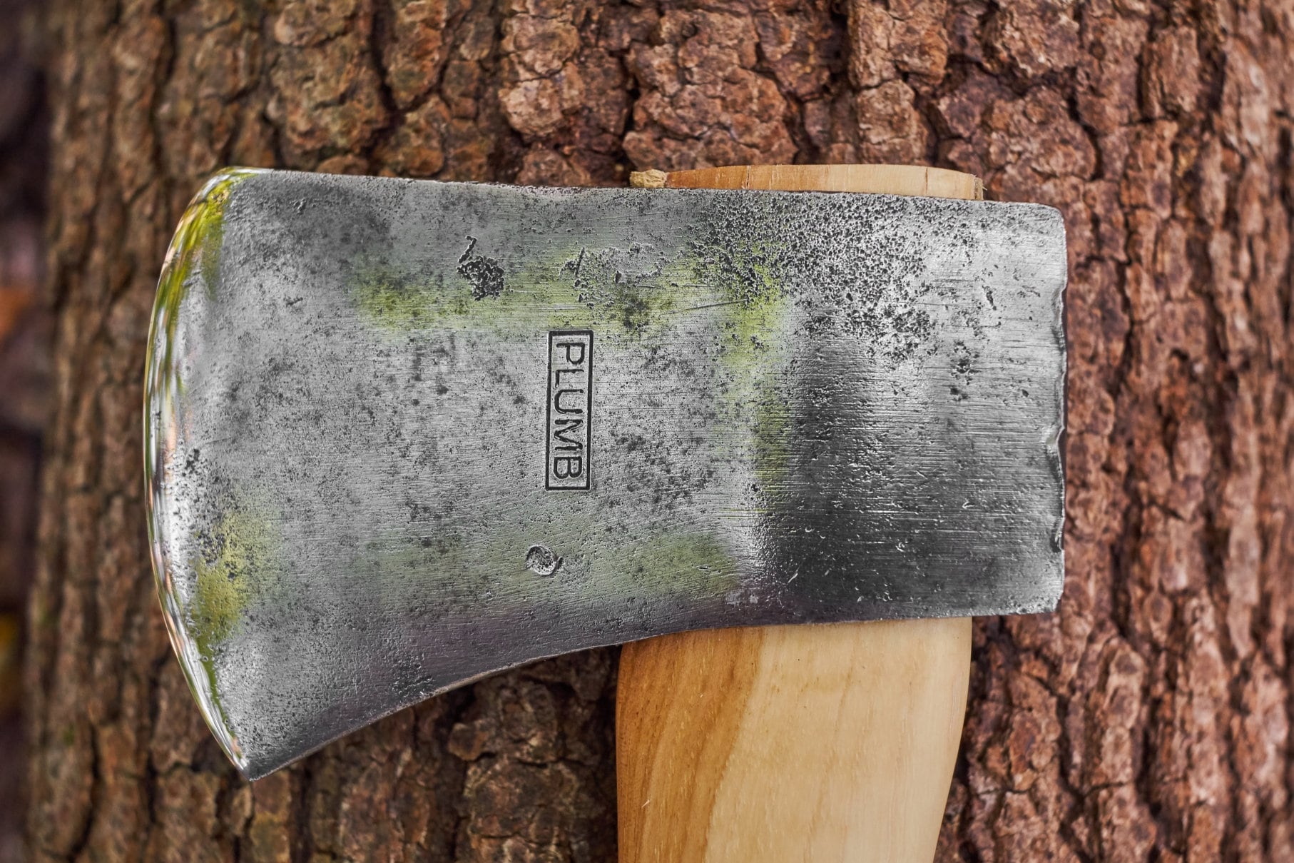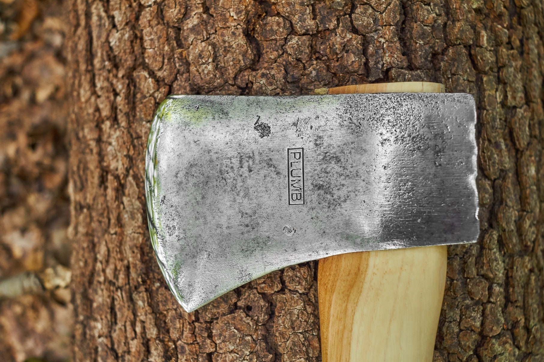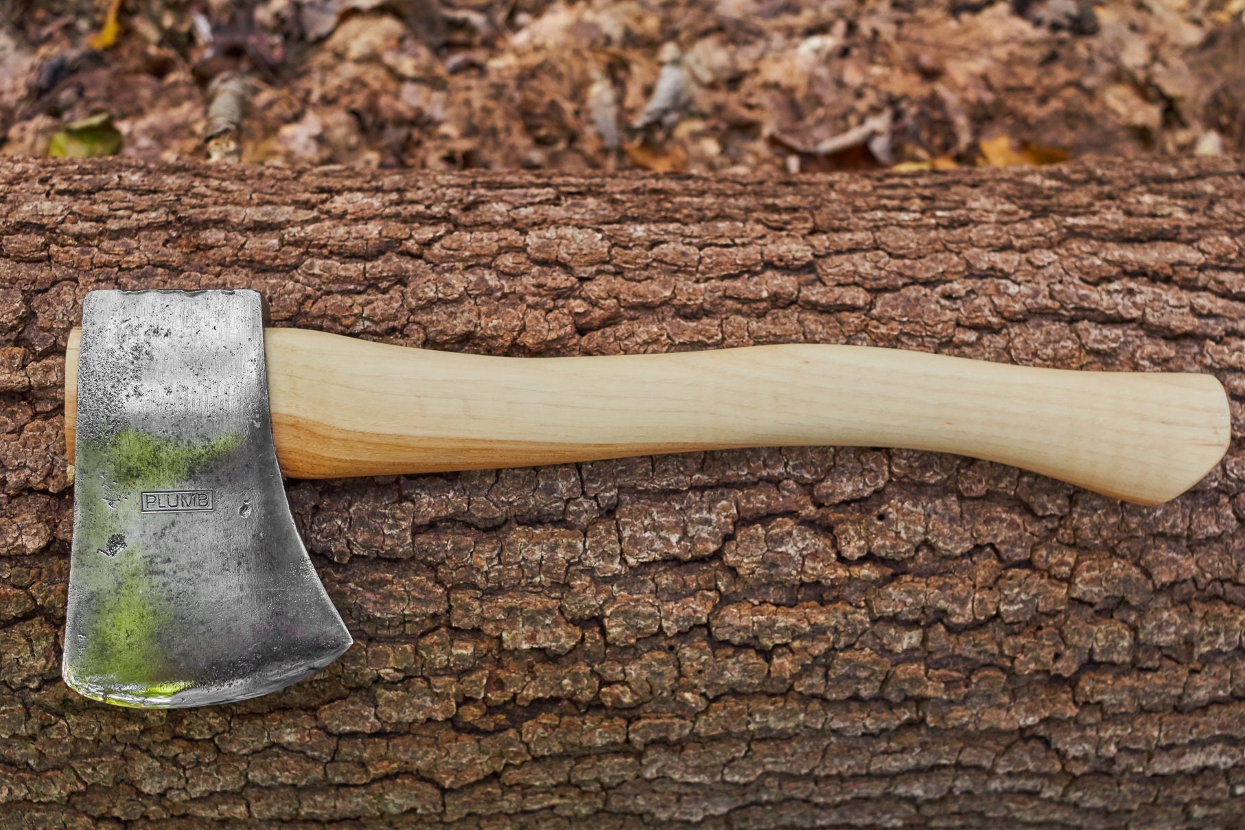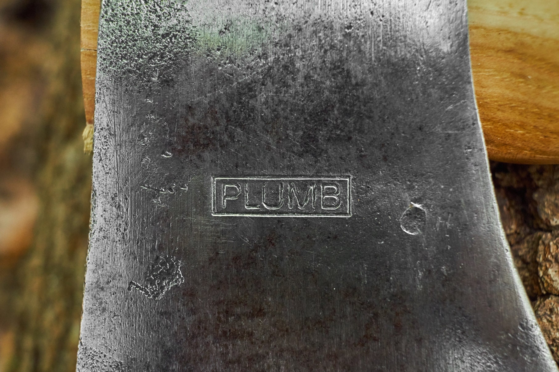 Vintage Plumb hatchet has been cleaned and sharpened .The new American Hickory handle has been hand sanded smooth and hand rubbed with orange oil and beeswax .The leather sheath is 8/9 oz leather hand stitched with black Tiger Thread and dyed a rich saddle tan color .The leather sheath was treated with Obenaufs Heavy Duty Leather Preservative .Overall length is 14 inches and weighs 2 lbs