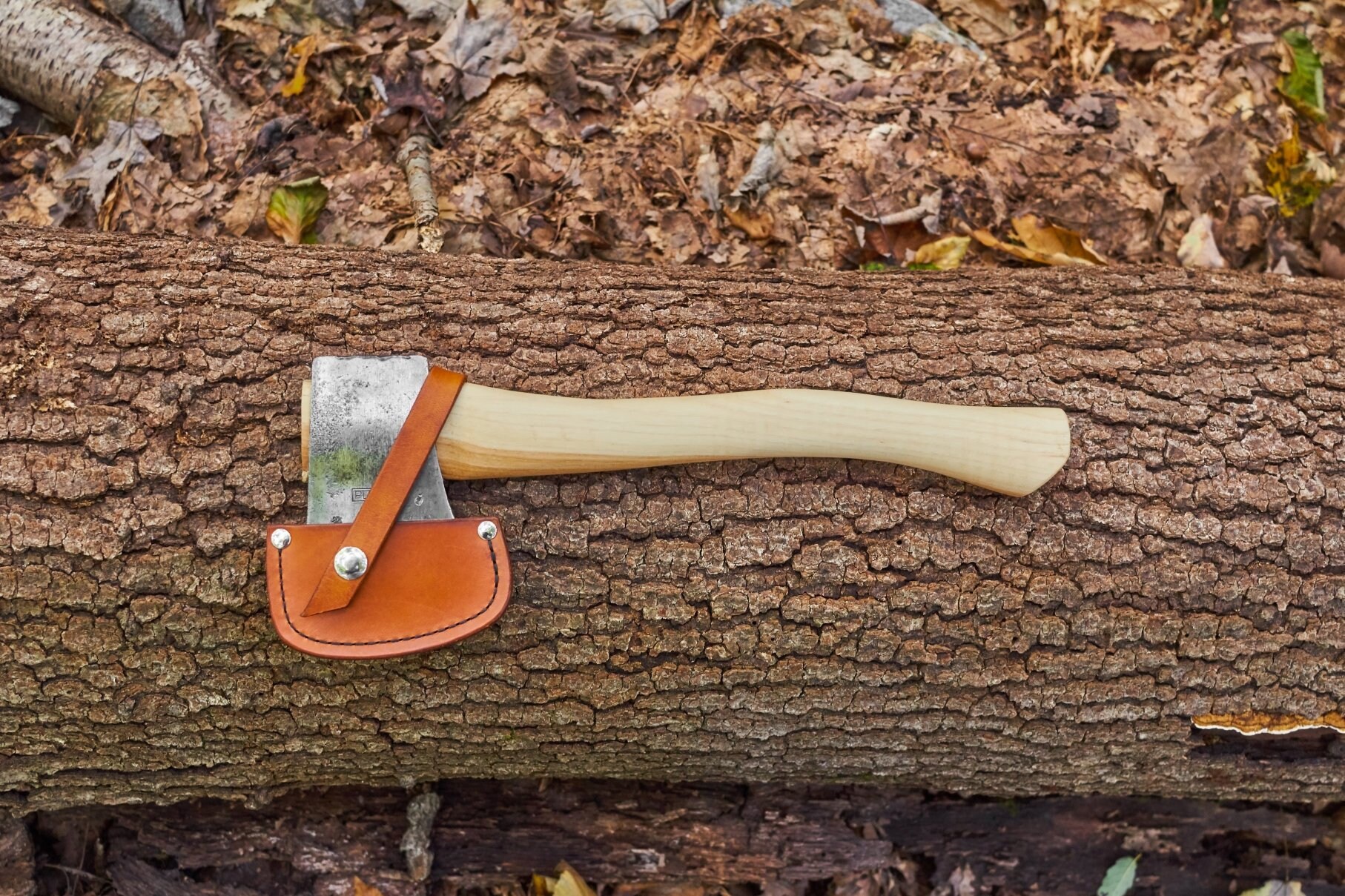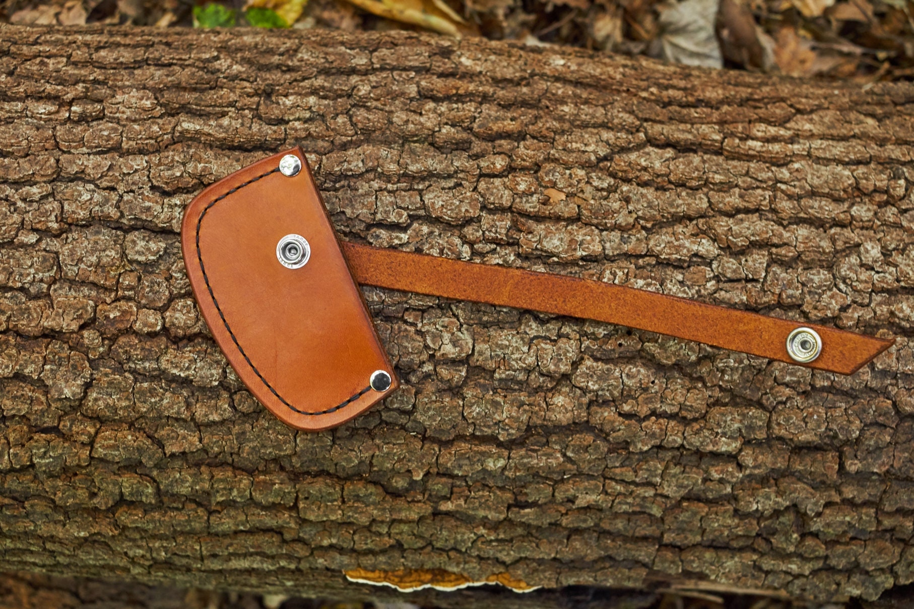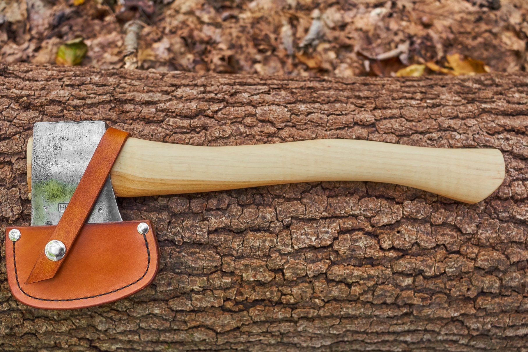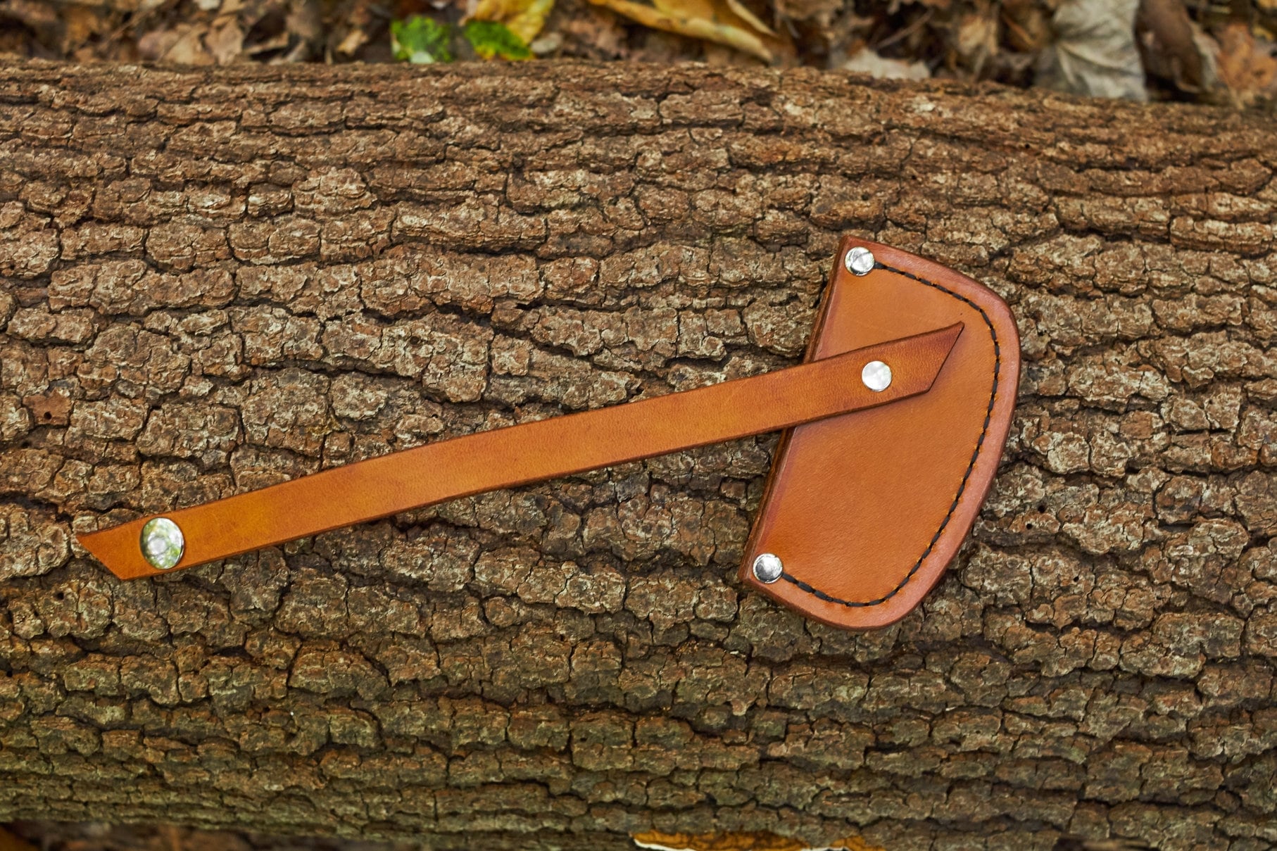 Vintage Plumb hatchet has been cleaned and sharpened .The new American Hickory handle has been hand sanded smooth and hand rubbed with orange oil and beeswax .The leather sheath is 8/9 oz leather hand stitched with black Tiger Thread and dyed a rich saddle tan color .The leather sheath was treated with Obenaufs Heavy Duty Leather Preservative .Overall length is 14 inches and weighs 2 lbs