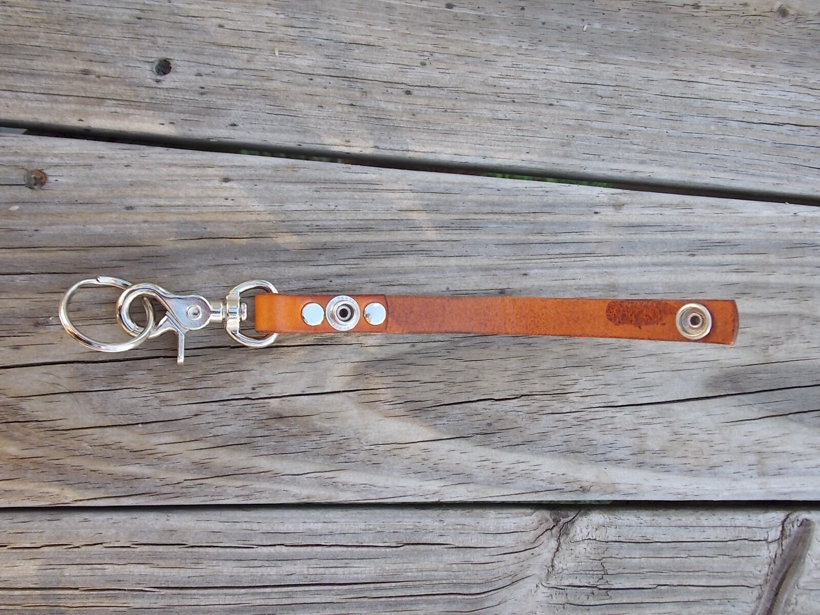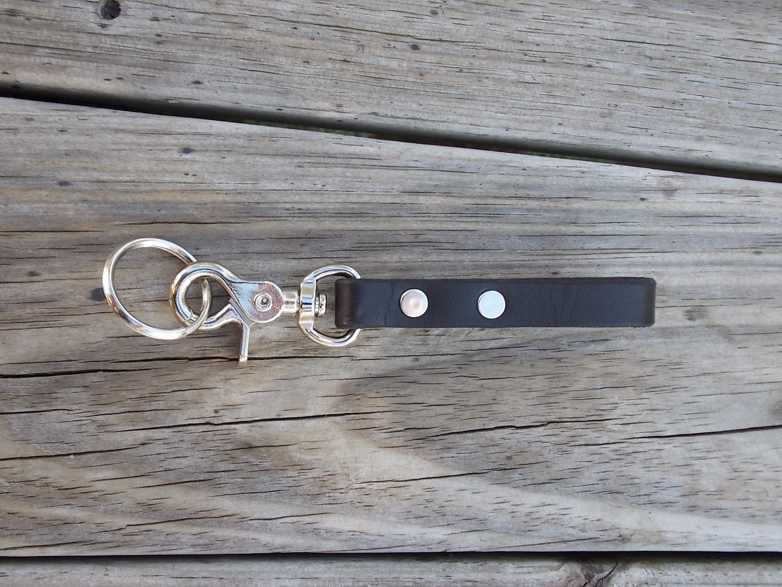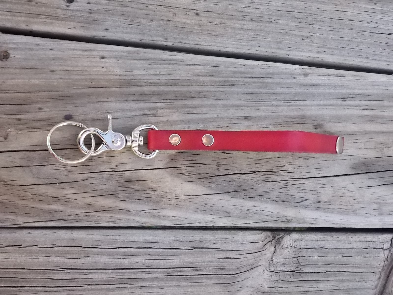 Handmade leather keychain with heavy duty swivel lobster claw and key ring nickel in color . These handmade keychains were made using heavy 8/9 oz leather and hand dyed to the colors seen in the pictures . Total length is just over 7 inches with key ring . Colors are black ,Saddle Tan and Pink . These leather keychains were handmade by the craftsman here at the Appalachian Axeworks Shop .