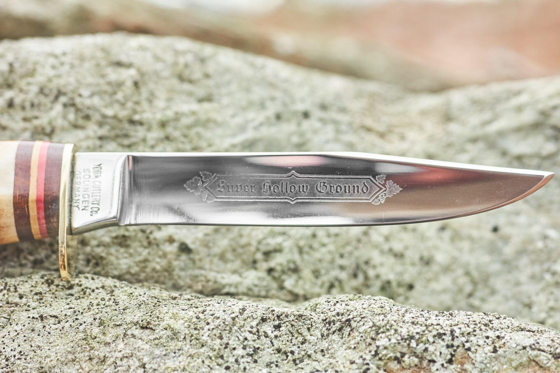 Vintage York Cutlery Co fixed blade knife made in Solingen Germany . The handle is stag with brass hilt with Super Hollow Ground Etched on the blade . This knife has been cleaned and sharpened and comes with the original leather sheath . The sheath is in good condition . Length is almost 8 inches and blade length is almost 4 inches .