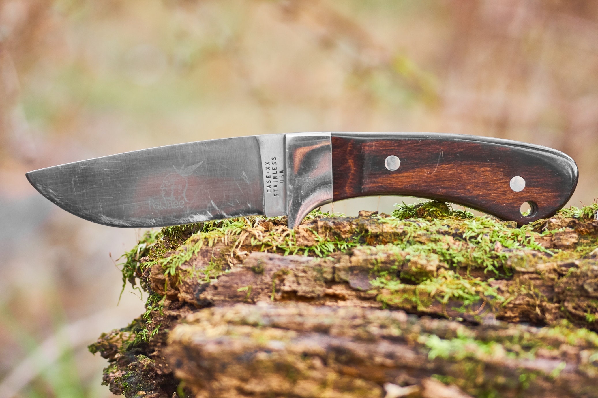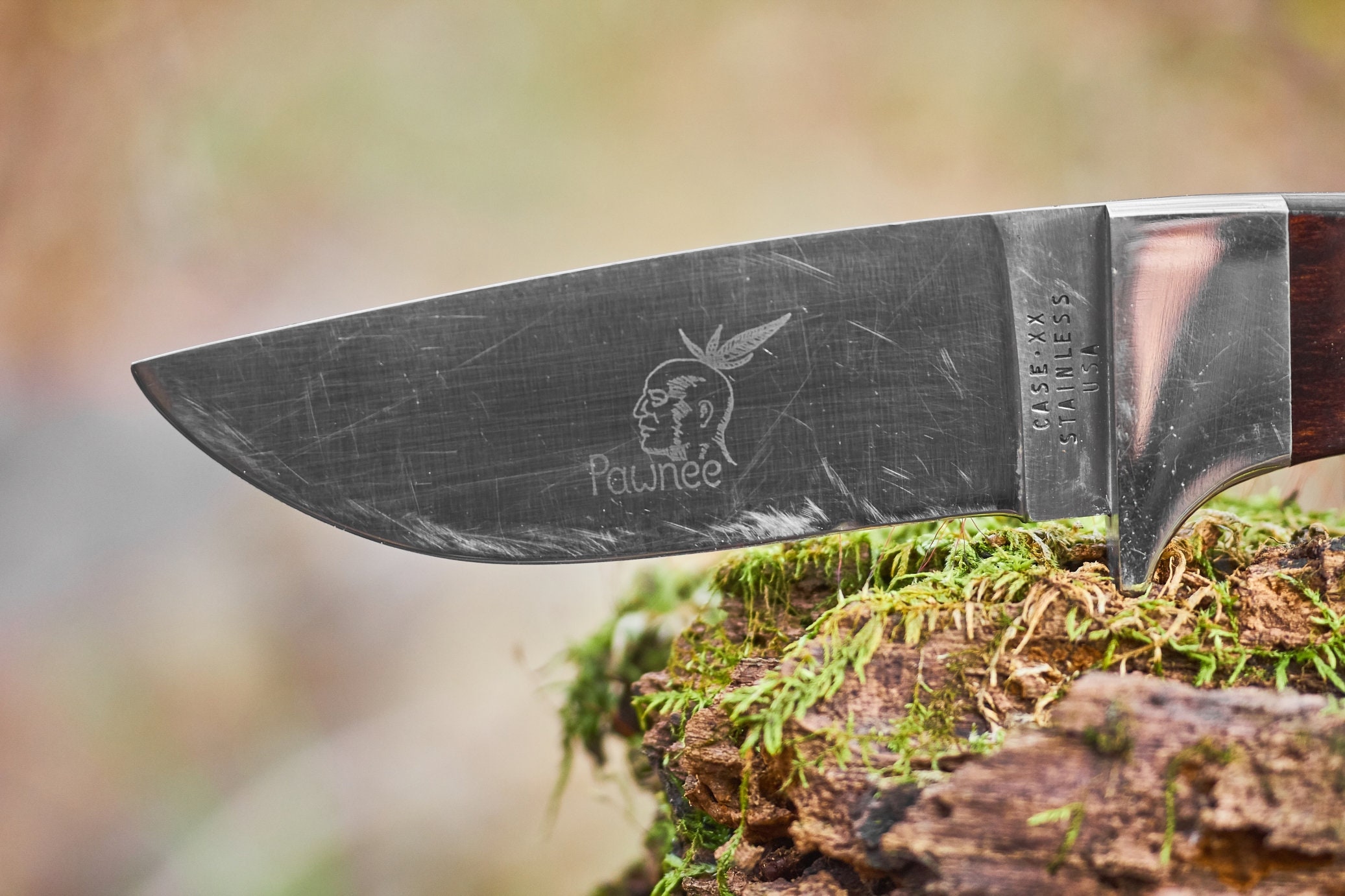 Vintage Case Pawnee Fixed blade knife with original leather sheath . This is a Case XX Stainless Steel fixed blade knife cleaned and sharpened and ready for your next outdoor adventure . The original leather sheath is solid and ready to carry this knife for many years to come . Knife total length is 9 1/8 inches and blade length is 4 1/4 inches .