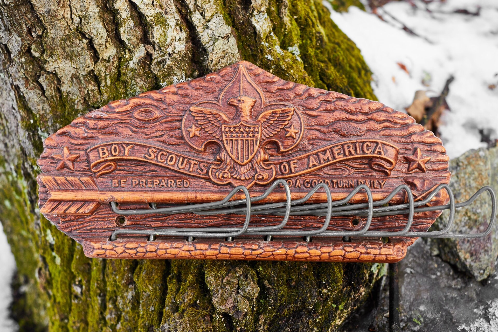 Vintage Boy Scouts of America tie rack is ready for your wall to hang ties ,belts or neckerchiefs .