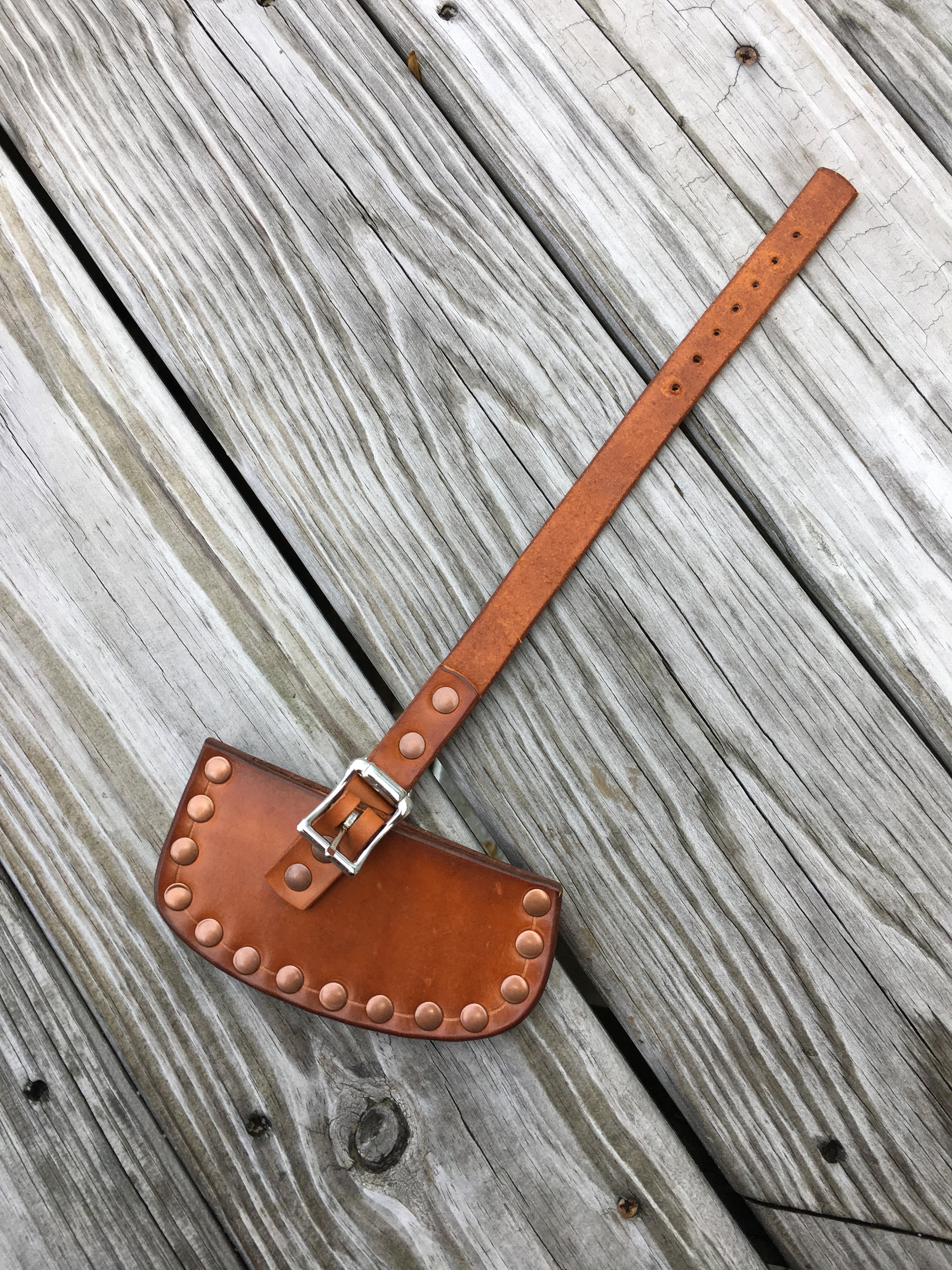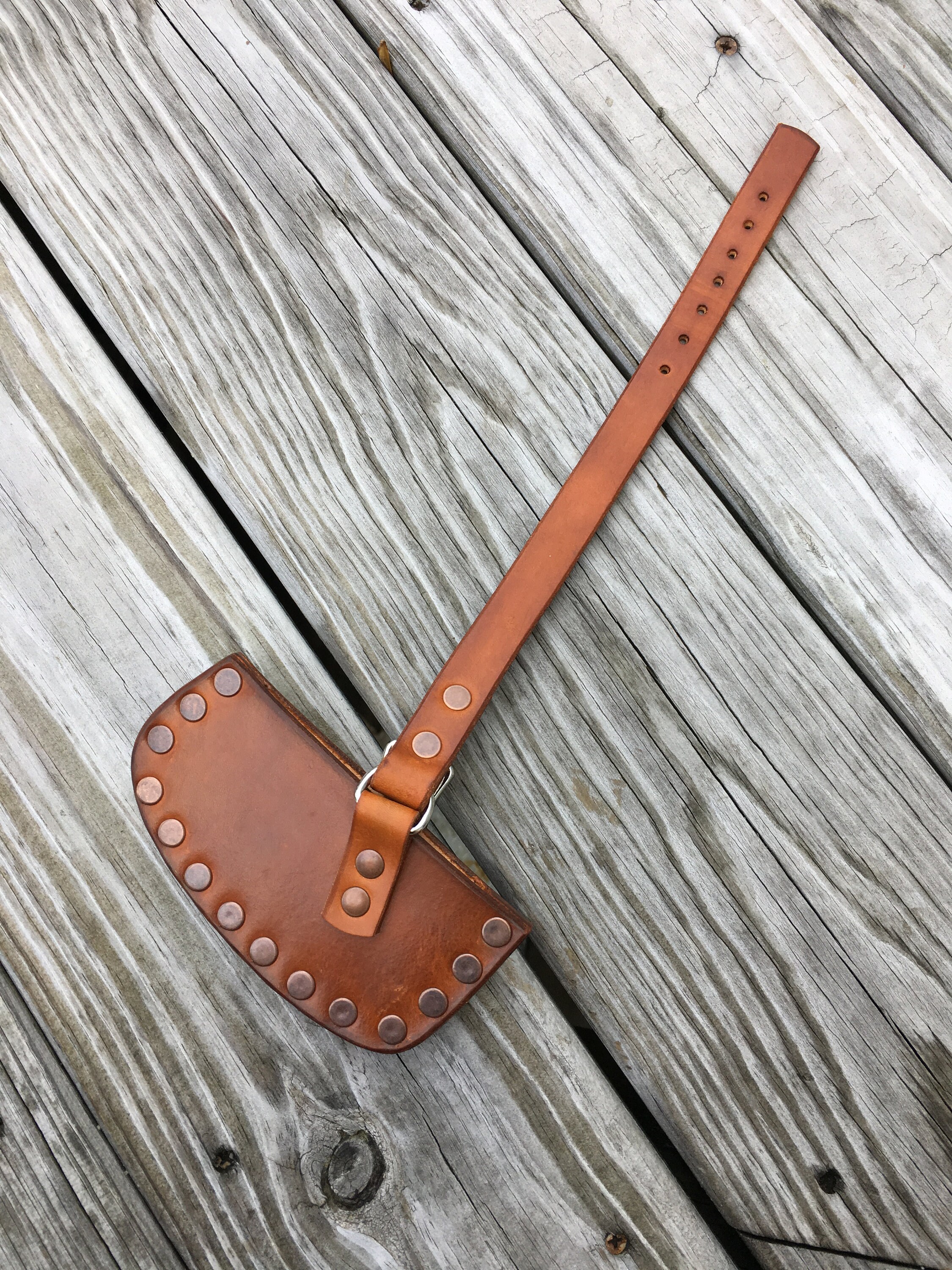 Handmade leather axe or hatchet sheath will fit an axe or hatchet with a 3 3/4 inch cutting edge ,great for a camp axe or boys axe . This sheath was made from 8/9 oz leather finished with Fiebings Pro saddle tan stain , and treated with Obenaufs Heavy Duty LP . This is a heavy duty welted sheath hand crafted in our shop .