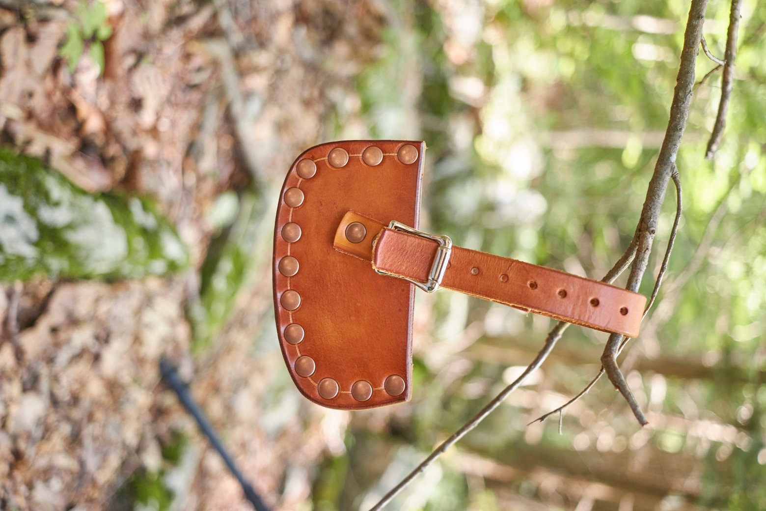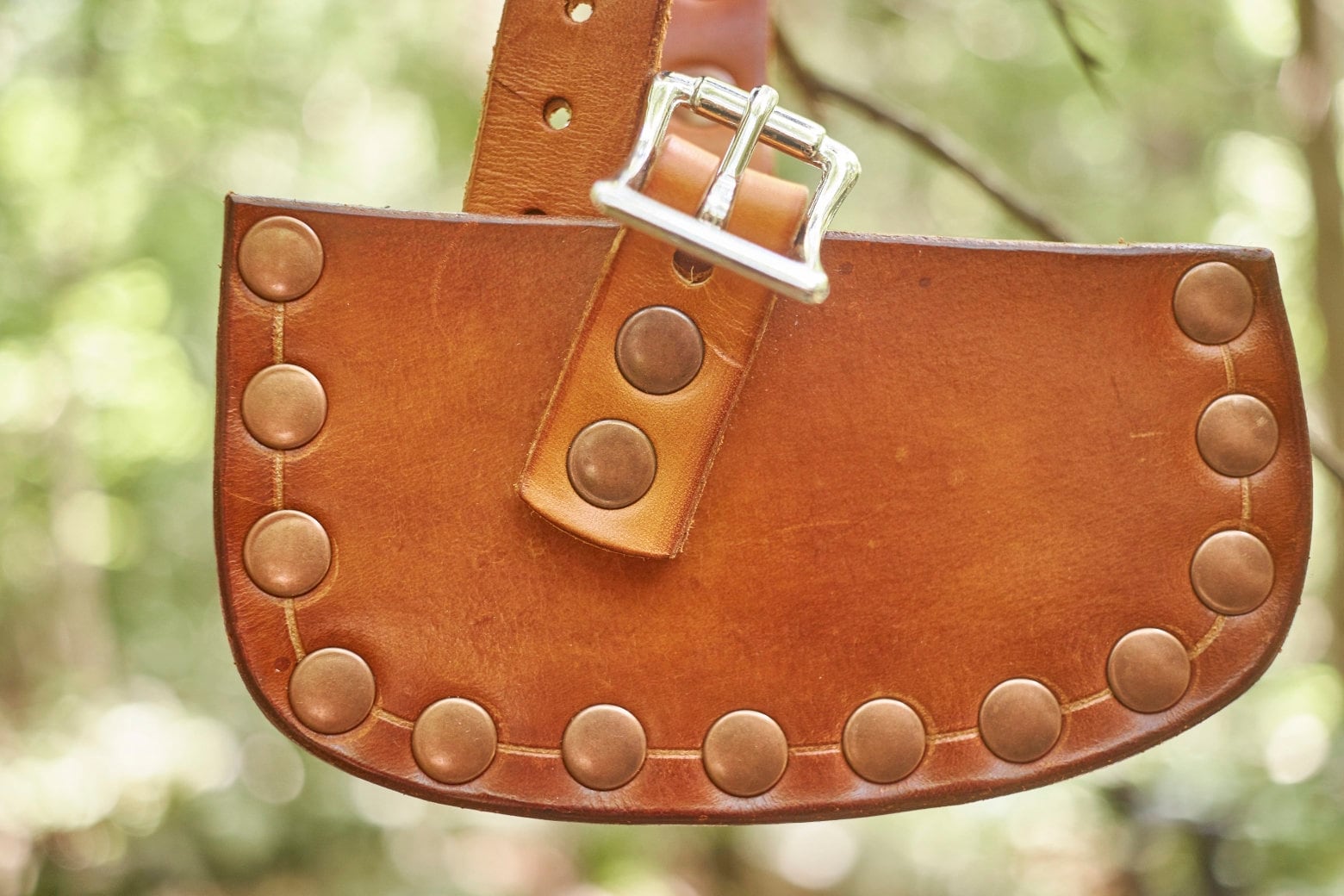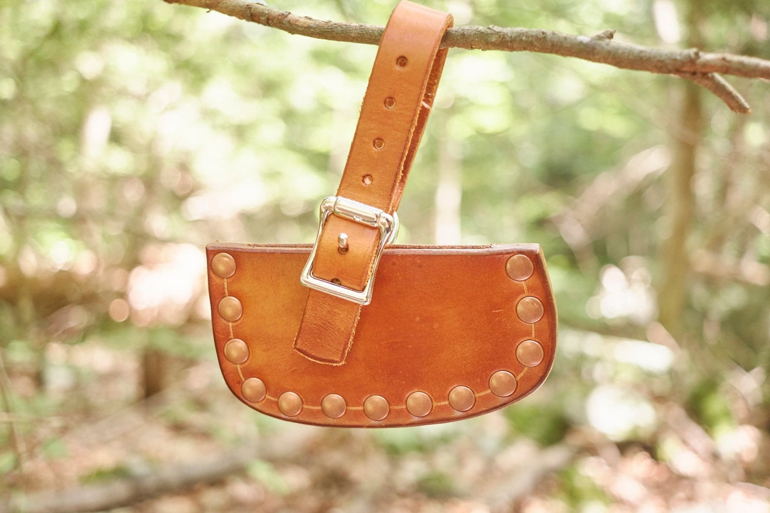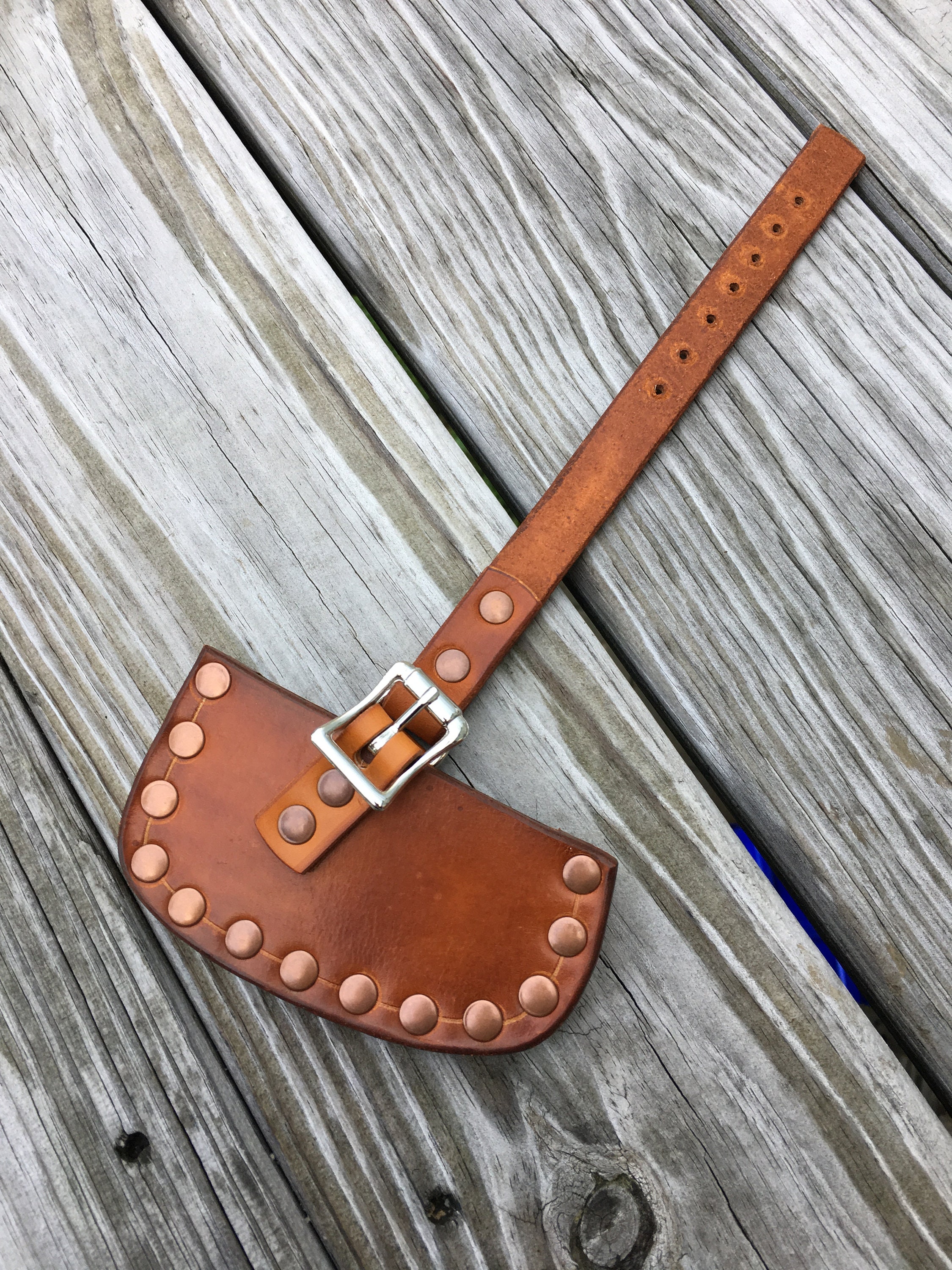 Handmade leather axe/hatchet sheath for a axe/hatchet with a 3 1/4 inch cutting edge . This sheath was handmade in our shop by one of our skilled artisans . This sheath is made from 8/9 oz veg tanned leather and given a Fiebing Pro Dye saddle tan finished and treated with Obenaufs Heavy Duty Lp . This is a heavy duty welted sheath ready for work or play .