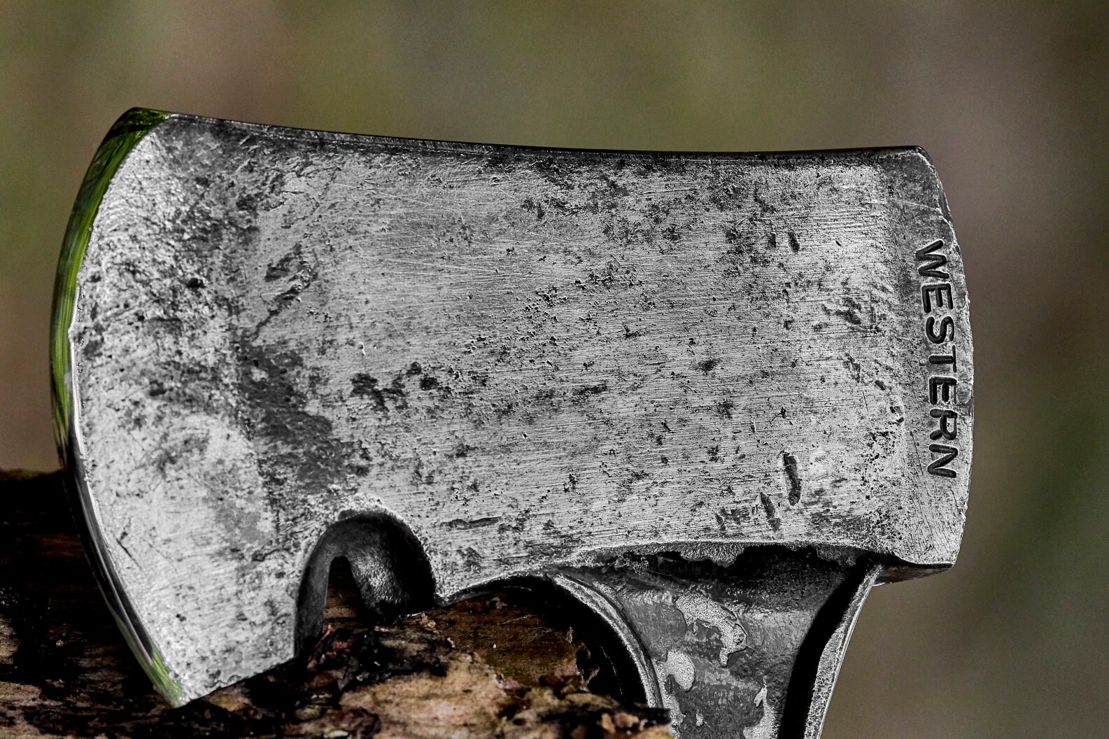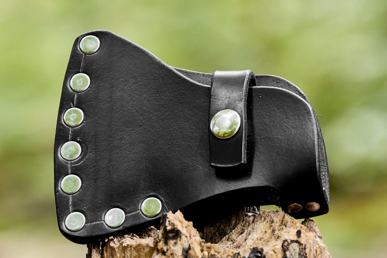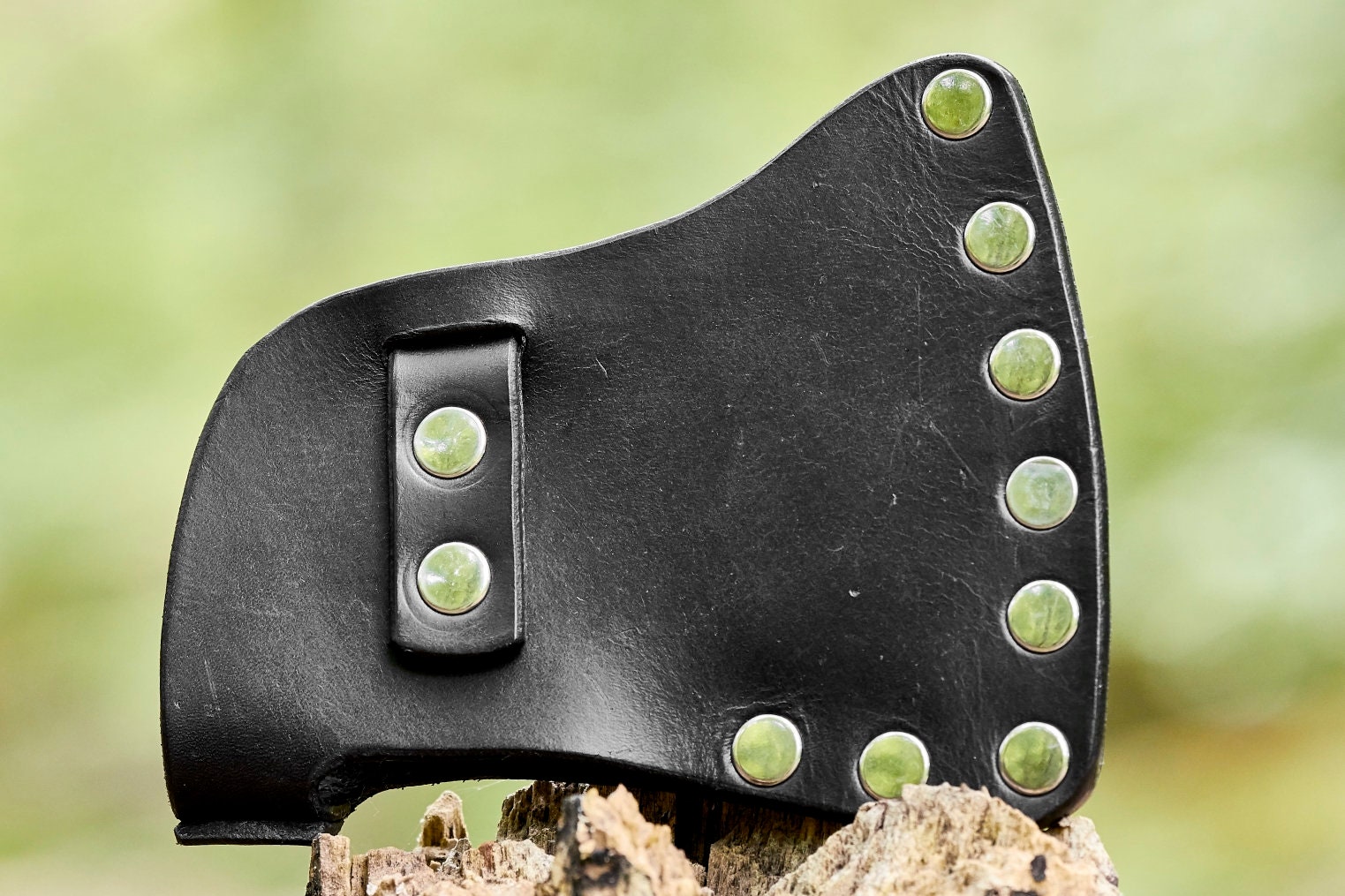 Vintage Western Black Beauty hatchet has been cleaned and sharpened . The custom leather sheath was made in our shop from 8/9 oz veg tan leather ,dyed with Fiebings Black Pro dye and finished of with nickel finished hardware . The sheath has been treated with Obenaufs Heavy Duty Leather Preservative . This hatchet is solid and ready for your next adventure .Lenght 12 inches and weighs 1 lb 13 oz