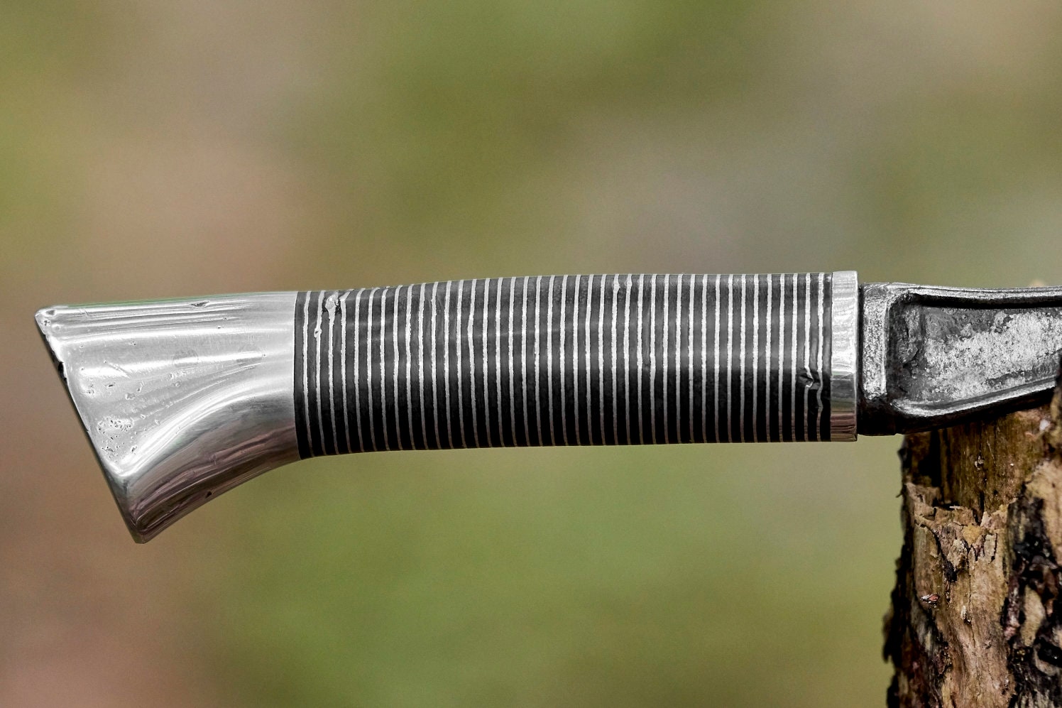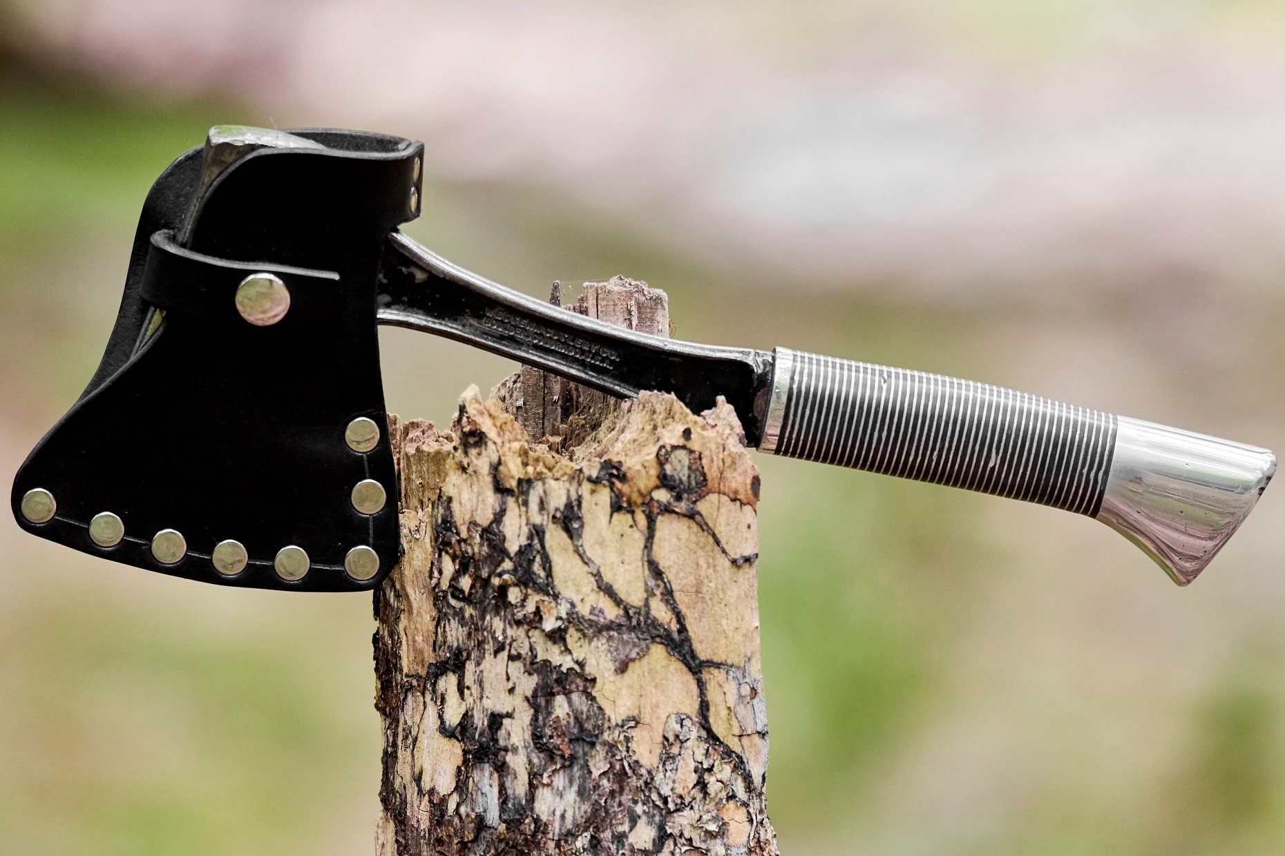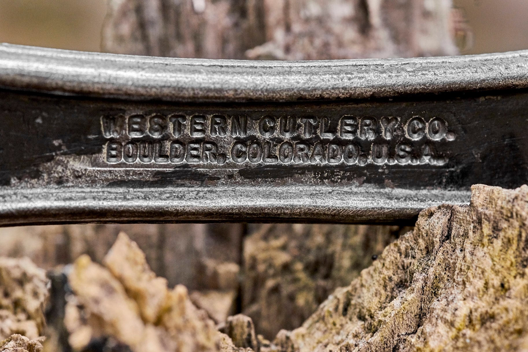 Vintage Western Black Beauty hatchet has been cleaned and sharpened . The custom leather sheath was made in our shop from 8/9 oz veg tan leather ,dyed with Fiebings Black Pro dye and finished of with nickel finished hardware . The sheath has been treated with Obenaufs Heavy Duty Leather Preservative . This hatchet is solid and ready for your next adventure .Lenght 12 inches and weighs 1 lb 13 oz