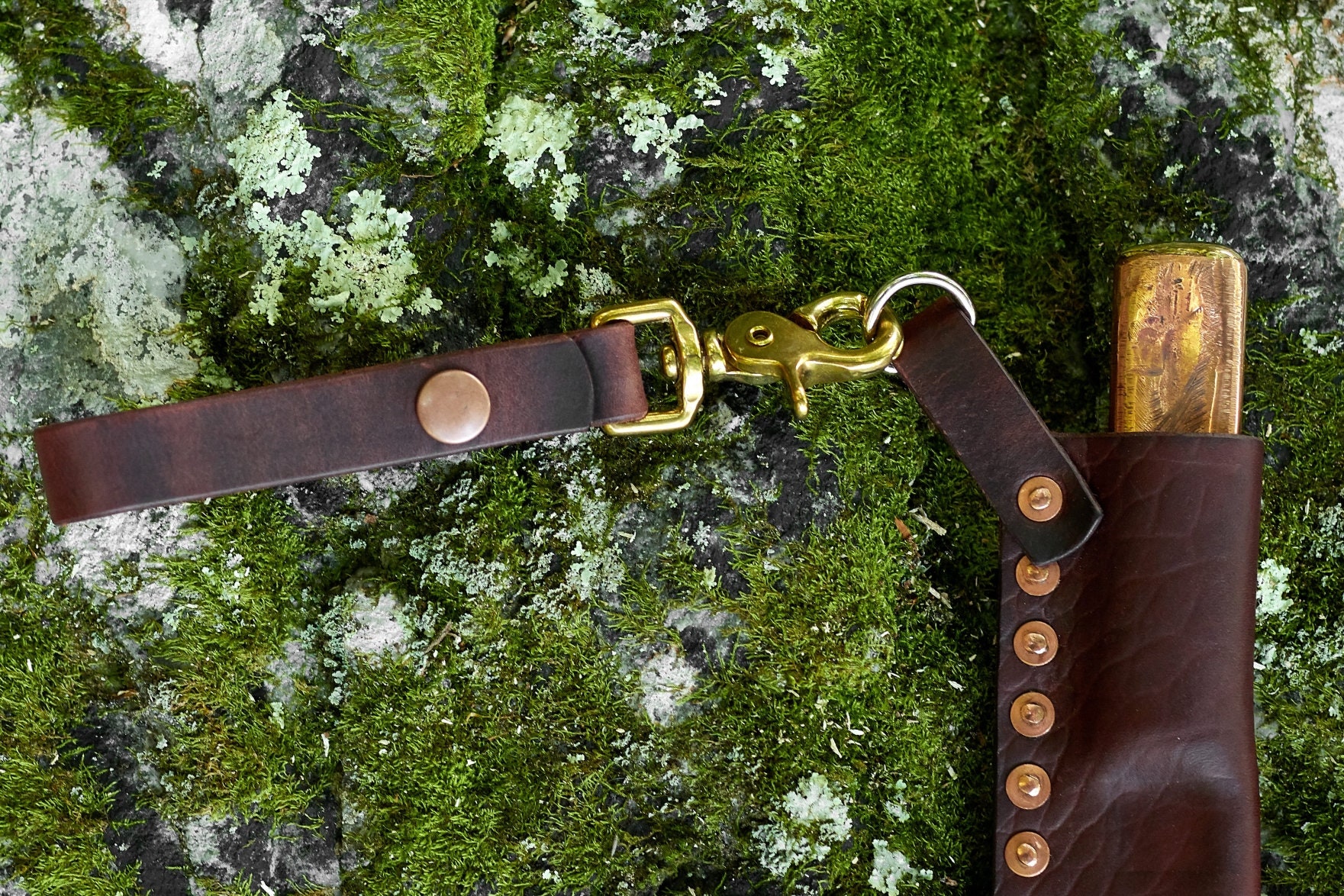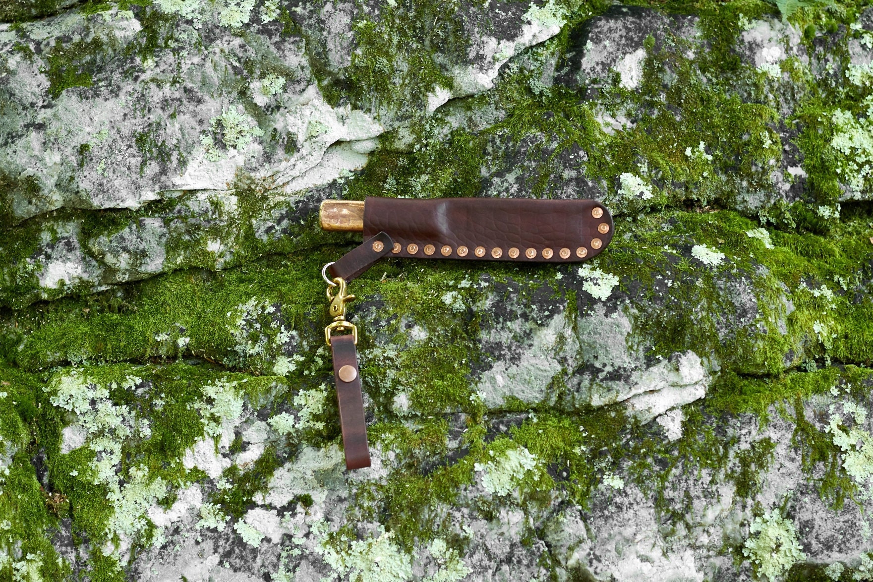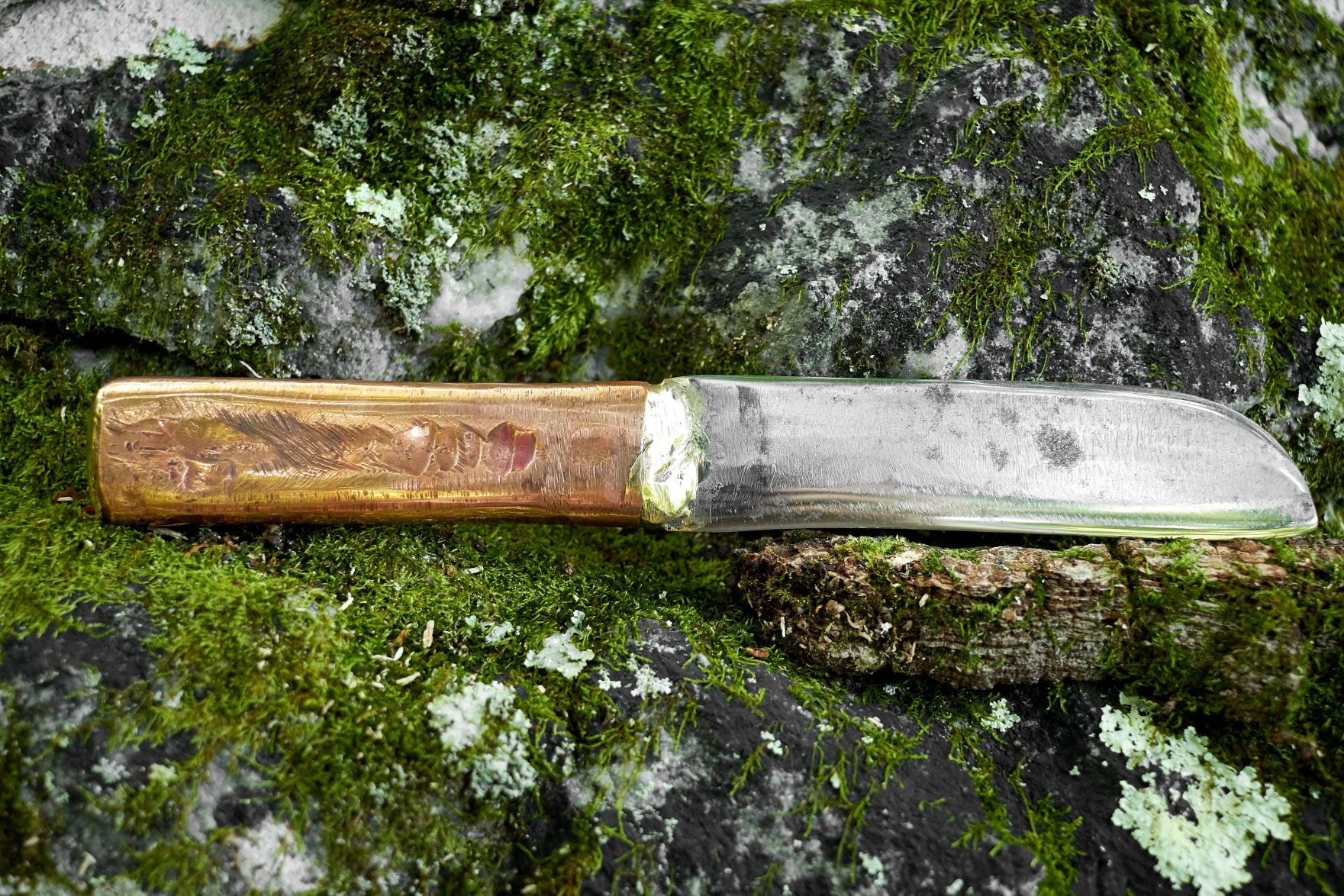 Vintage handmade rigging knife with copper and brass handle is 9 inches long , blade length is 4 3/4 inches . This knife has been cleaned , sharpened and the copper /brass handle polished . This knife was given a handmade custom fit dangler sheath made from 8/9 oz alligator embossed veg tan leather . Solid Copper rivets were used on the sheath and belt loop , belt loop clip is brass . The leather was dyed with Fiebing dark brown Pro dye and treated with Bickmore Heavy Duty Leather Preservative . This knife is ready for work or add it to your vintage knife collection .