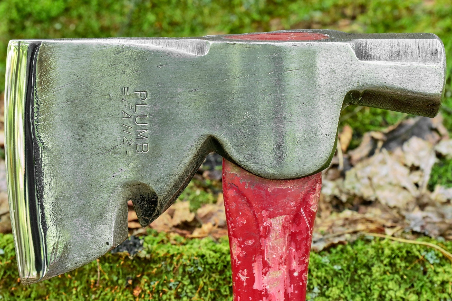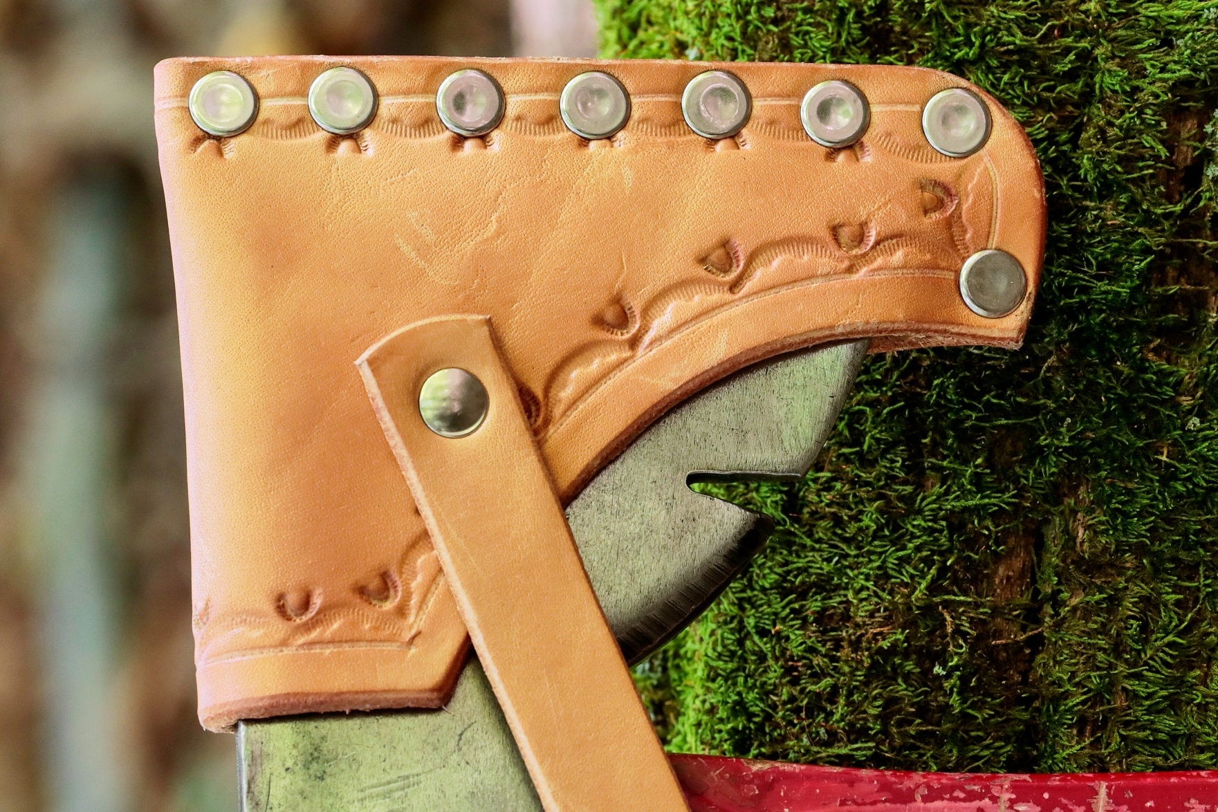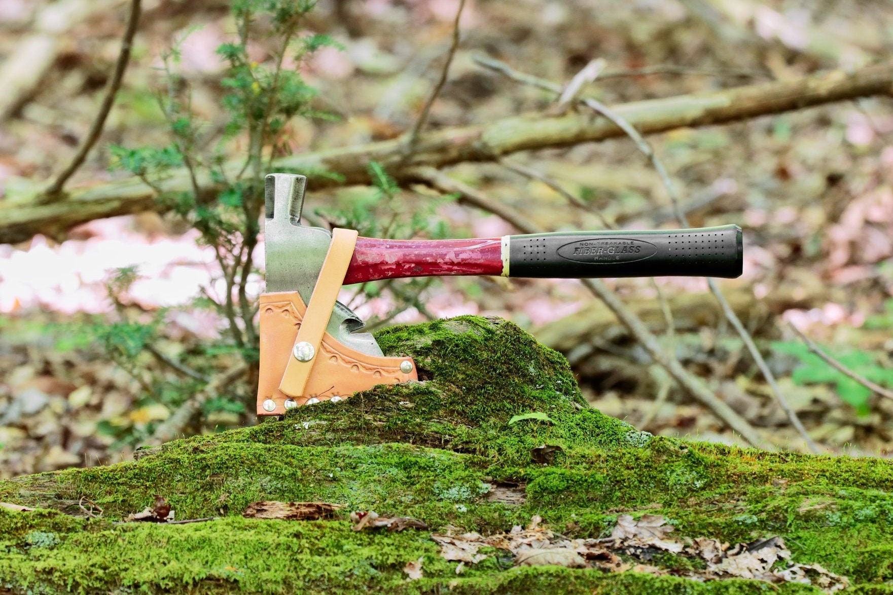 Vintage Plumb Hatchet with fiberglass handle has been cleaned and sharpened . The custom leather sheath is made from 8/9 oz veg tan leather and treated with Bickmore Heavy Duty Leather Preservative . This hatchet is very solid and ready for work . Length 13 inches weight 2 lb 4 oz