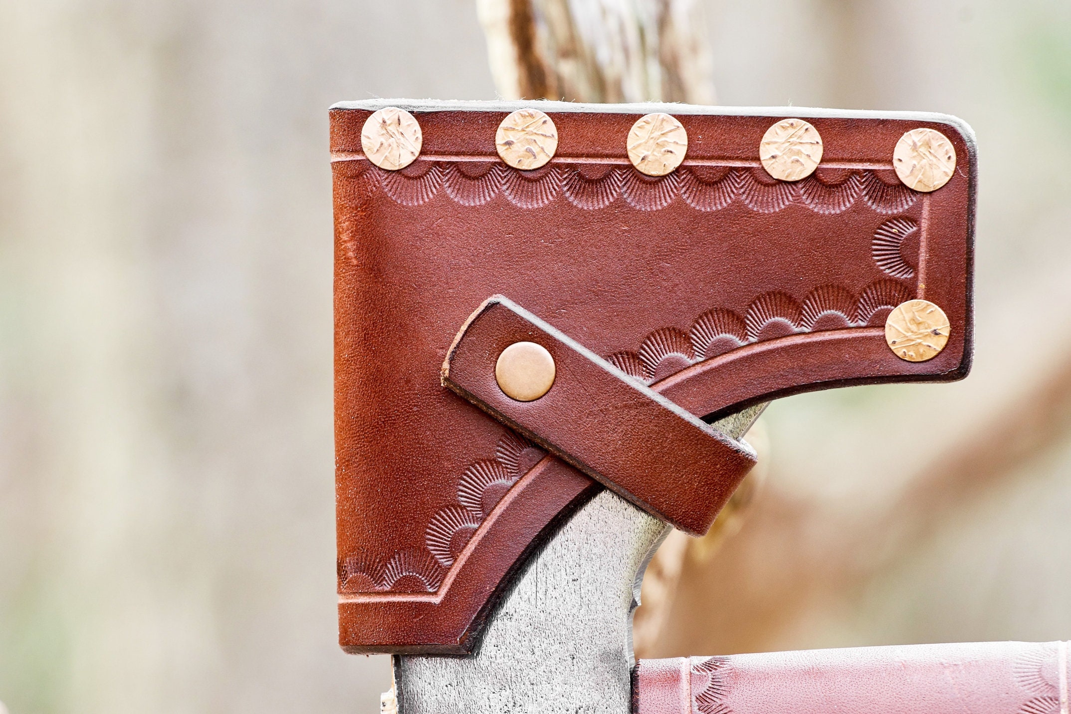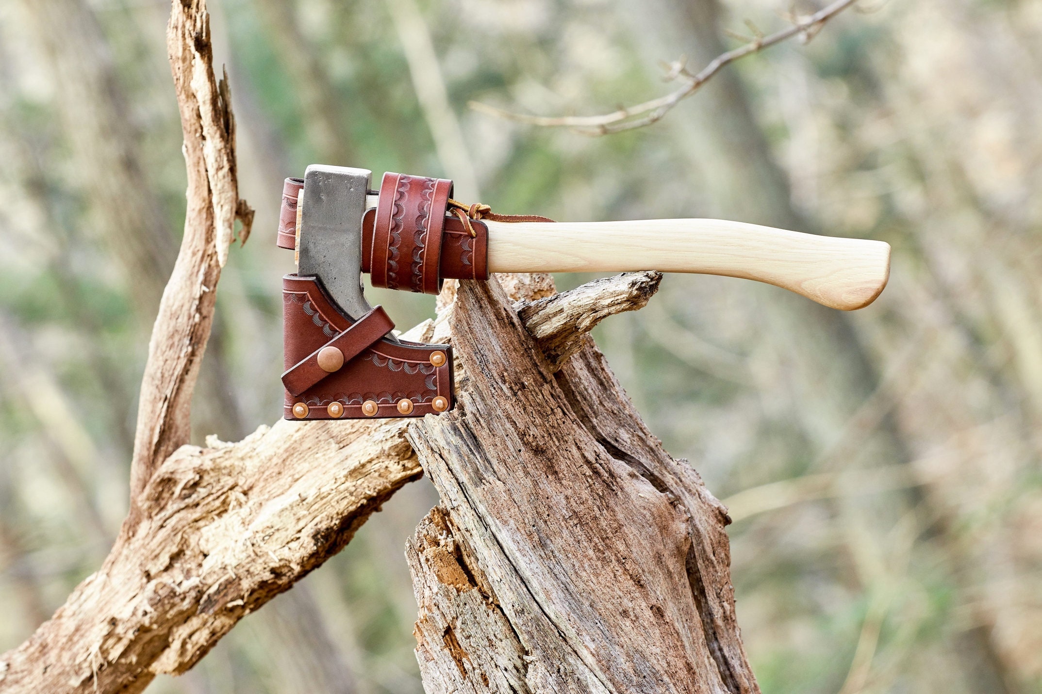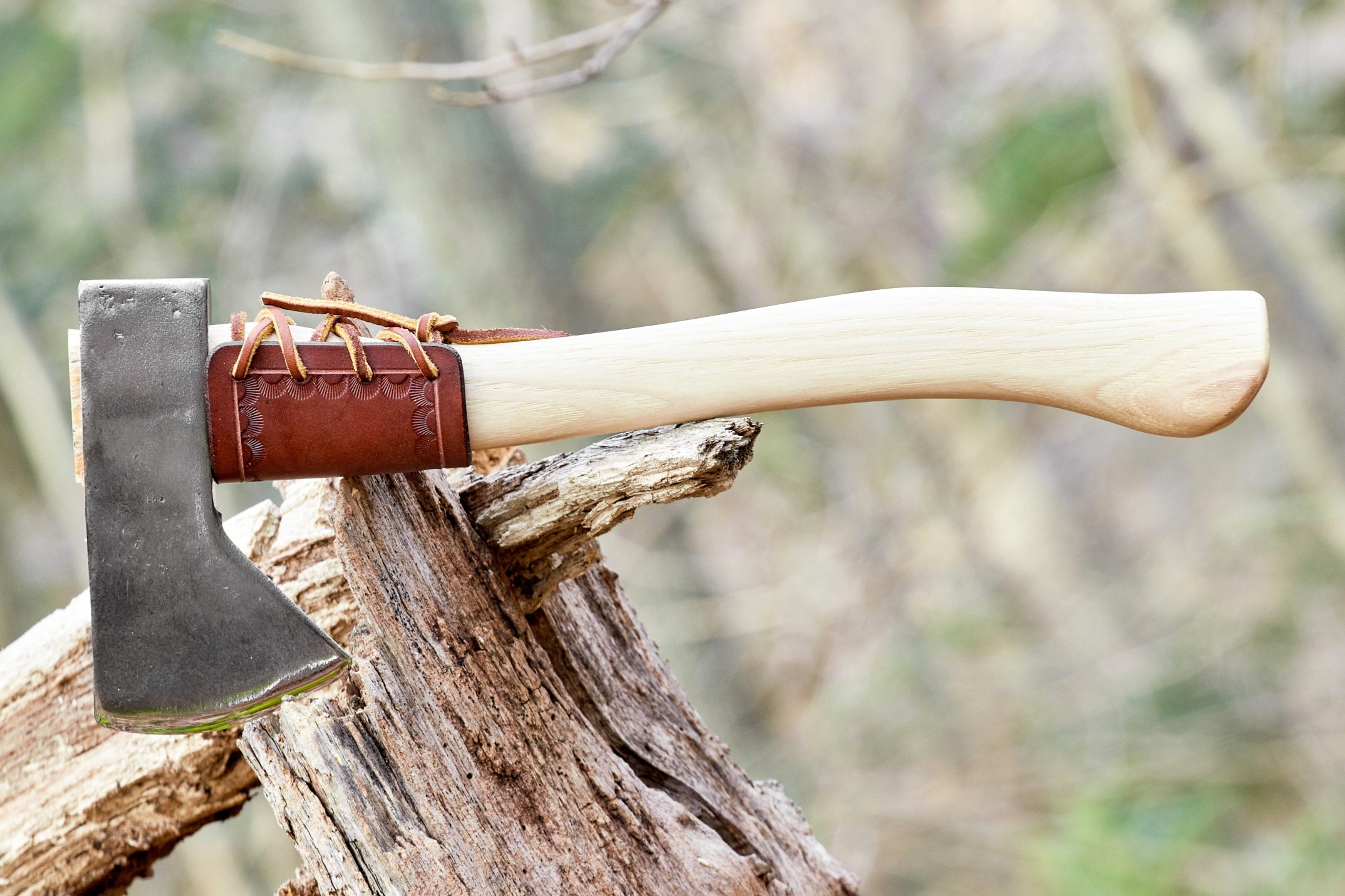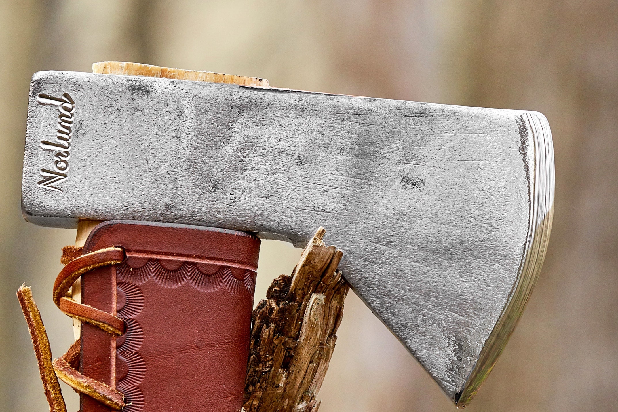 Vintage Norlund hatchet has been cleaned and sharpened and hung on a new American Hickory handle . The handle has been hand sanded smooth and hand rubbed with orange oil and beeswax . The custom leather sheath , overstrike guard and belt hanger are made from 8/9 oz veg tan leather and given a rich mahogany color . The leather is treated with Bickmore Heavy Duty Leather Preservative and finished of with copper rivets . Length is 13 inches and weighs 1 lb 8 oz cutting edge is just shy of 3 inches . The orange tape was applied at the factory and provides some link to its history . This hatchet is ready for the woods , camping , hunting ,or hiking .