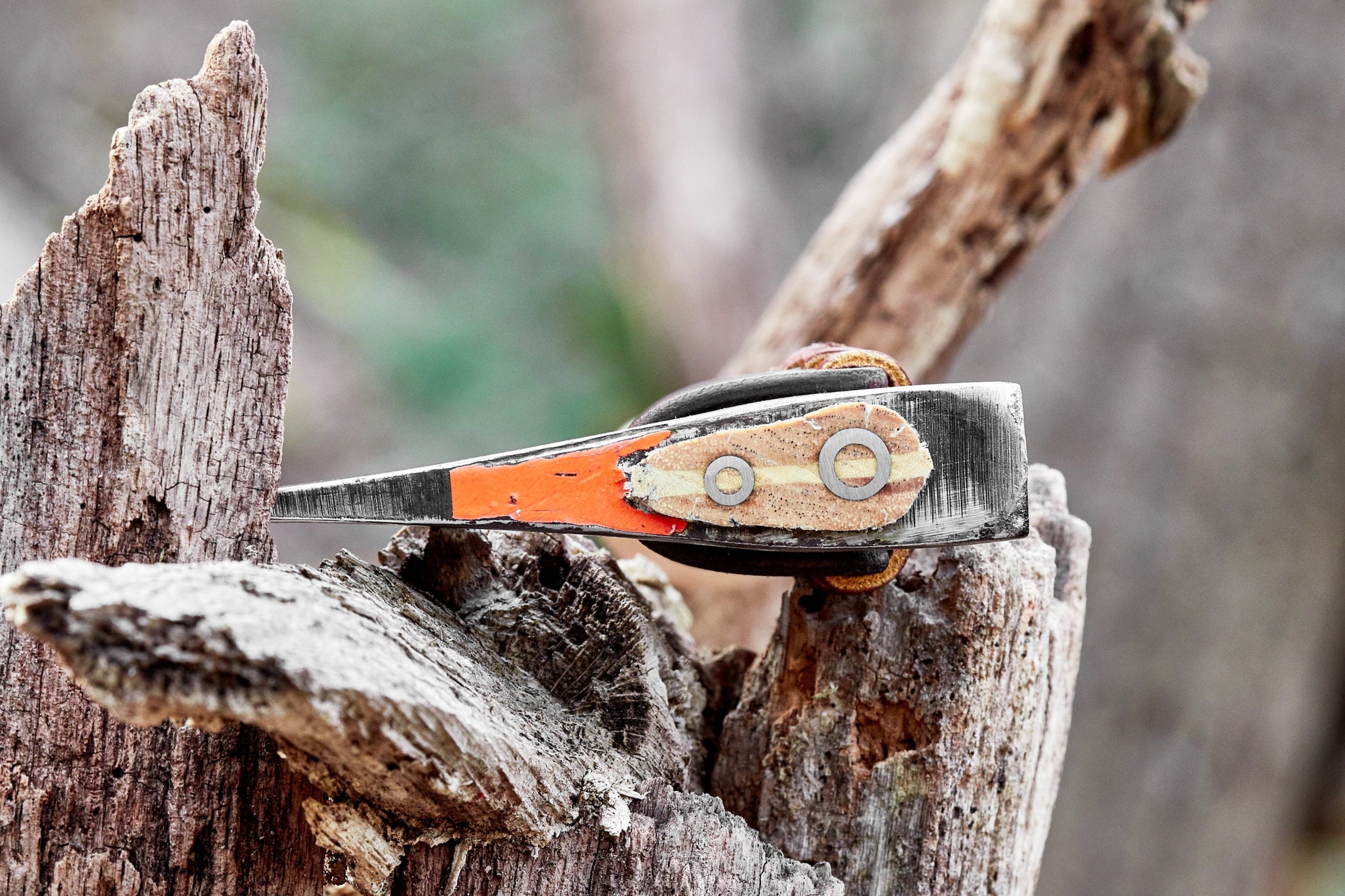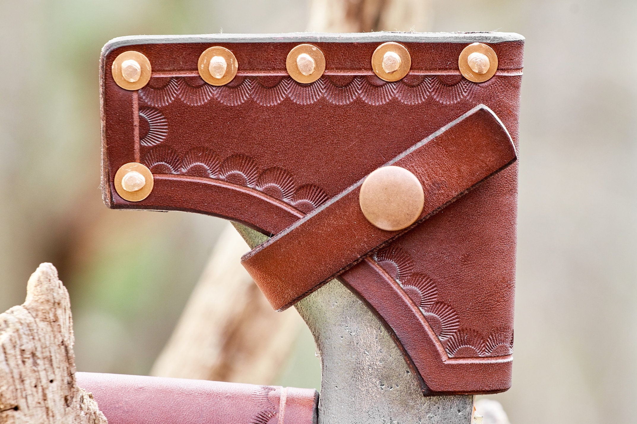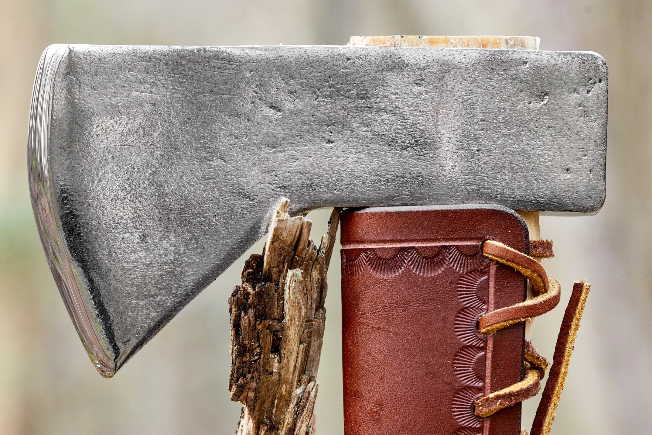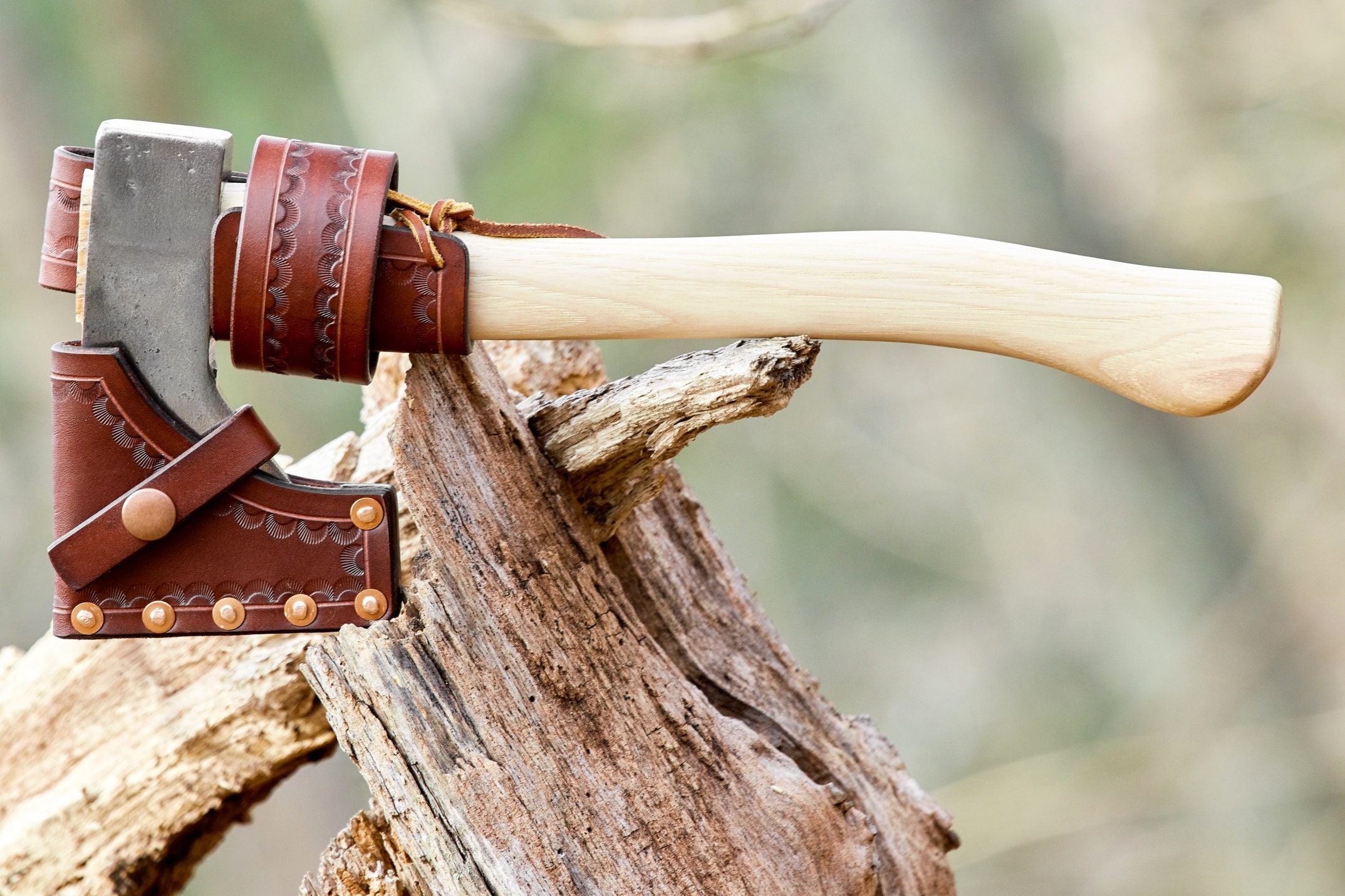 Vintage Norlund hatchet has been cleaned and sharpened and hung on a new American Hickory handle . The handle has been hand sanded smooth and hand rubbed with orange oil and beeswax . The custom leather sheath , overstrike guard and belt hanger are made from 8/9 oz veg tan leather and given a rich mahogany color . The leather is treated with Bickmore Heavy Duty Leather Preservative and finished of with copper rivets . Length is 13 inches and weighs 1 lb 8 oz cutting edge is just shy of 3 inches . The orange tape was applied at the factory and provides some link to its history . This hatchet is ready for the woods , camping , hunting ,or hiking .