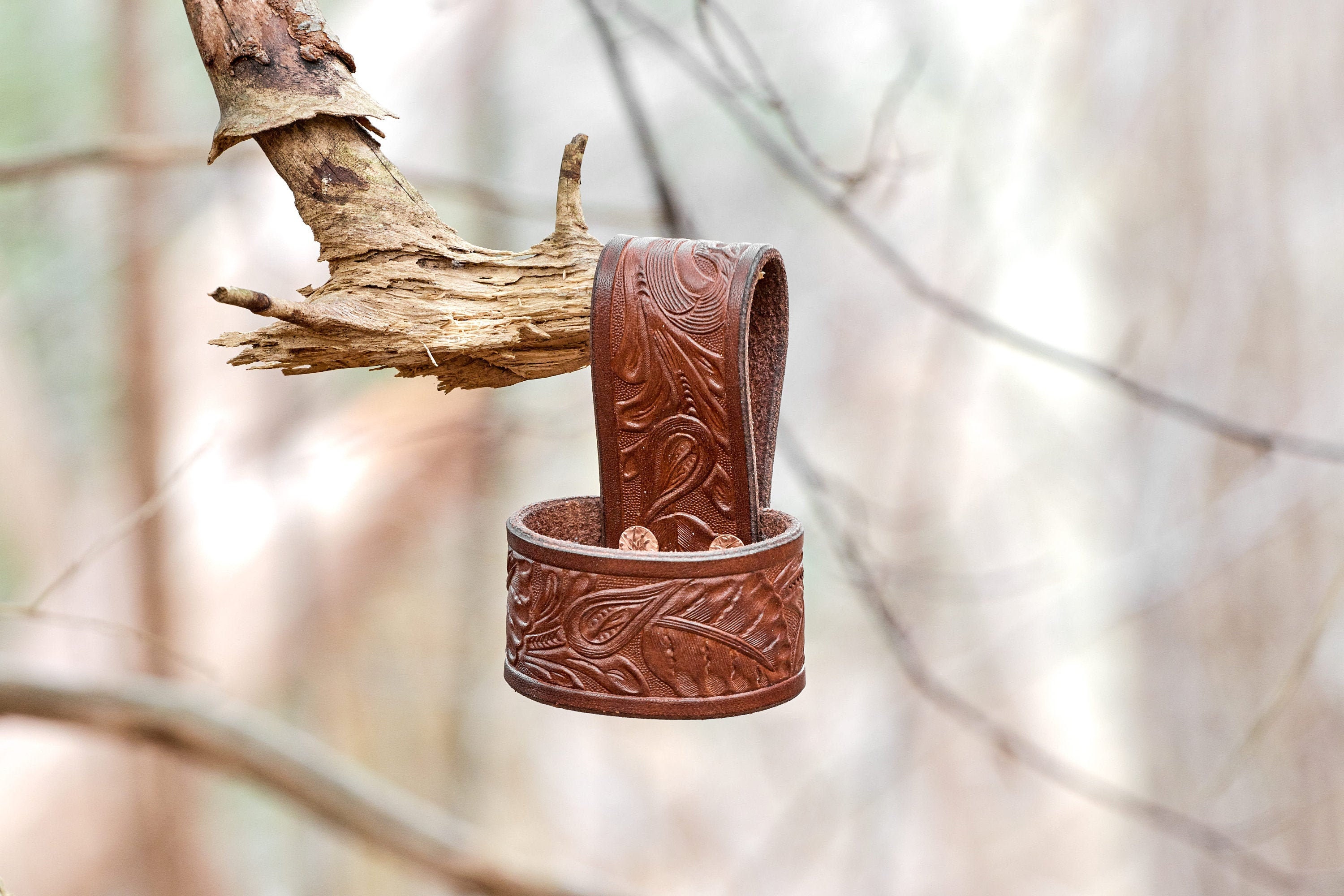Handmade Leatherjackets Axe or Hatchet belt loop or belt hanger . This leather belt loop is crafted from 8/9 oz veg tan leather and dyed with Fiebings Brown Pro Dye and fastened with copper rivets . The leather was treated with Bickmore Heavy Duty Leather Preservative . This loop will accommodate most hatchets and small axes .