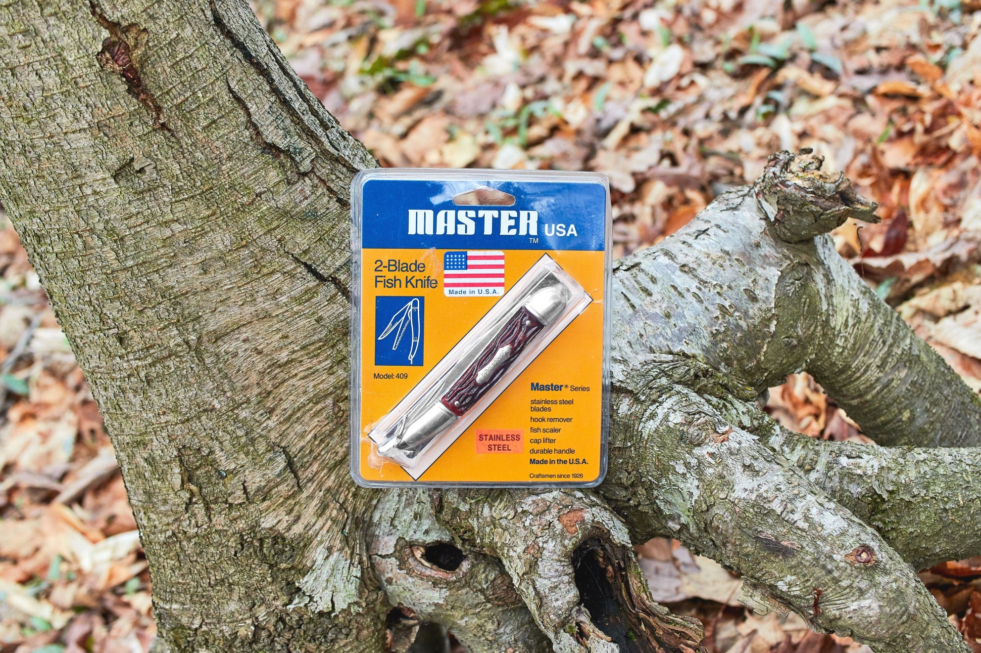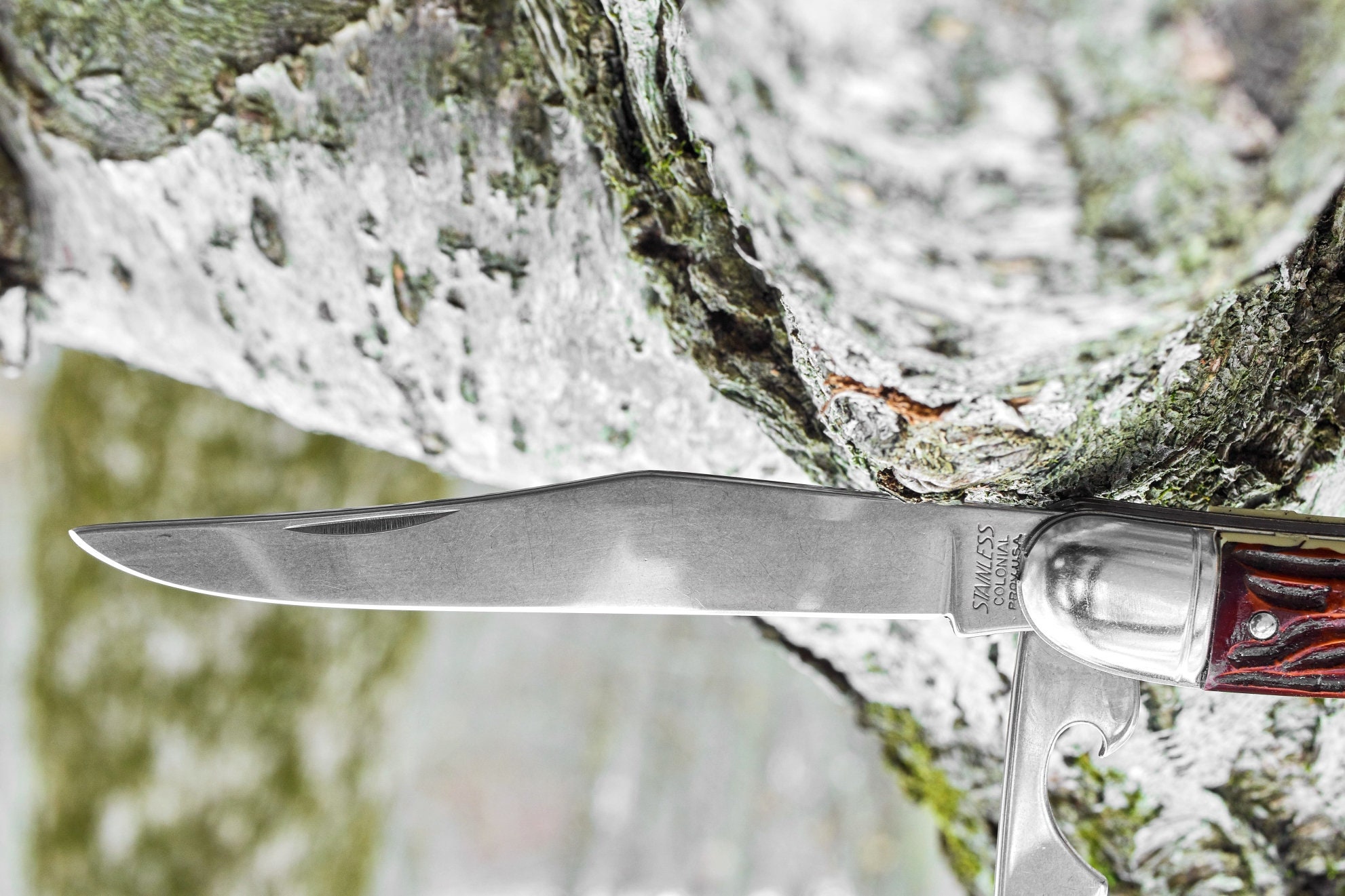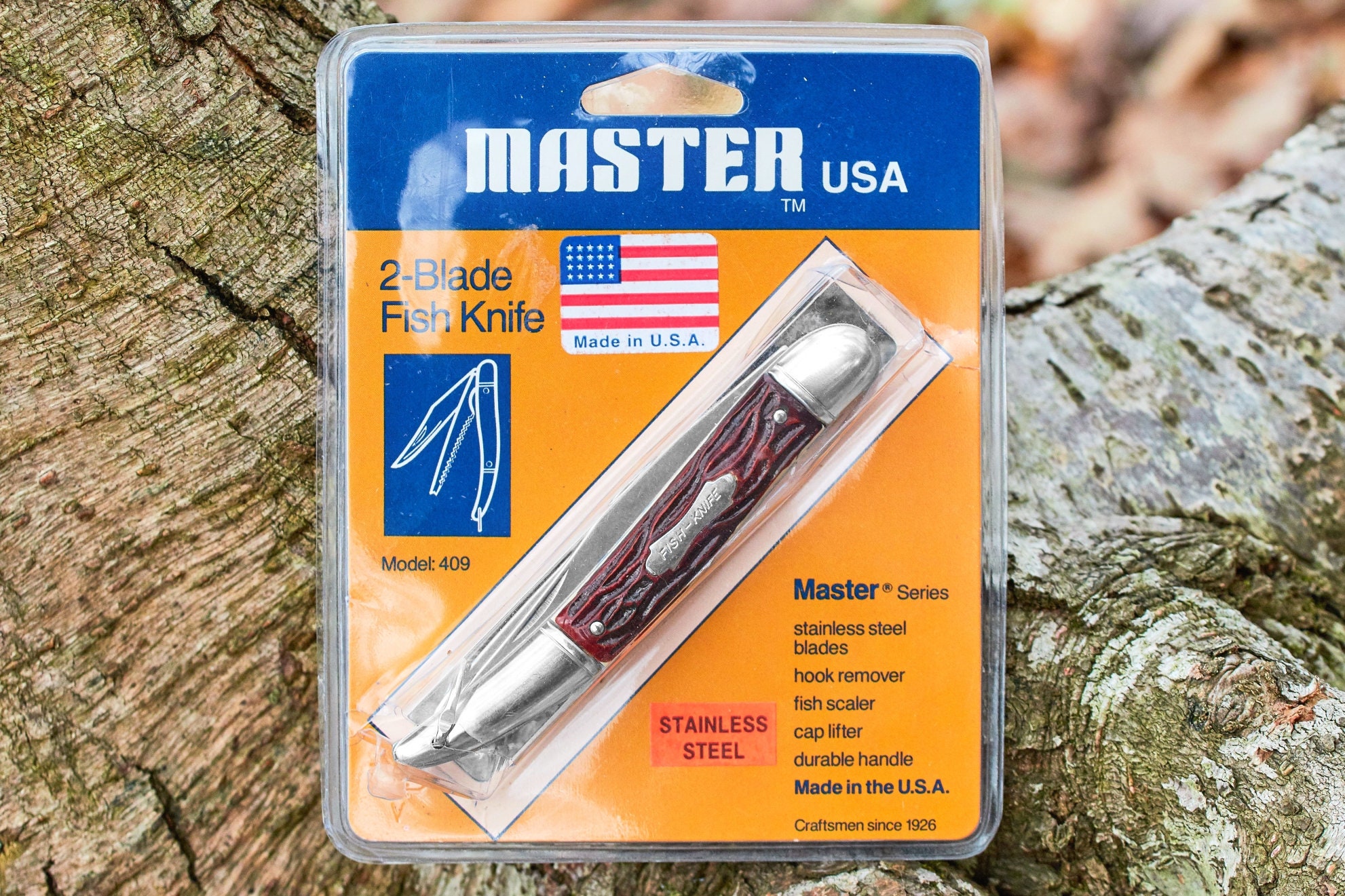 Vintage Colonial fish knife with original plastic packaging has never been used or carried . This knife is in good condition and ready for your pocket or add it to your vintage knife collection . Closed length is 5 inches and open length is 8 7/8 inches . 2 blade pocket knife has 1 straight cutting blade and 1 blade with fish scaler , fish hook remover and bottle opener .
