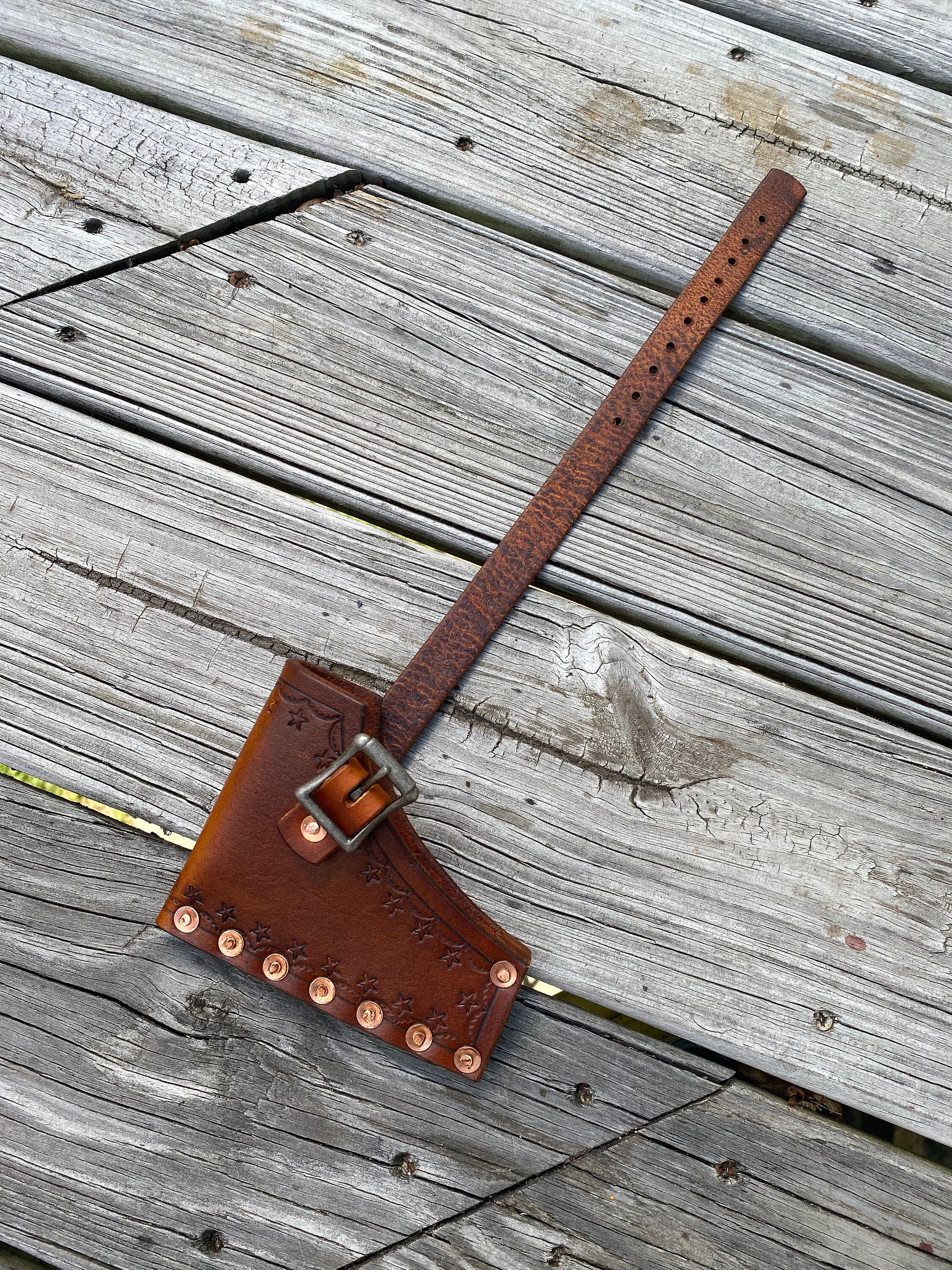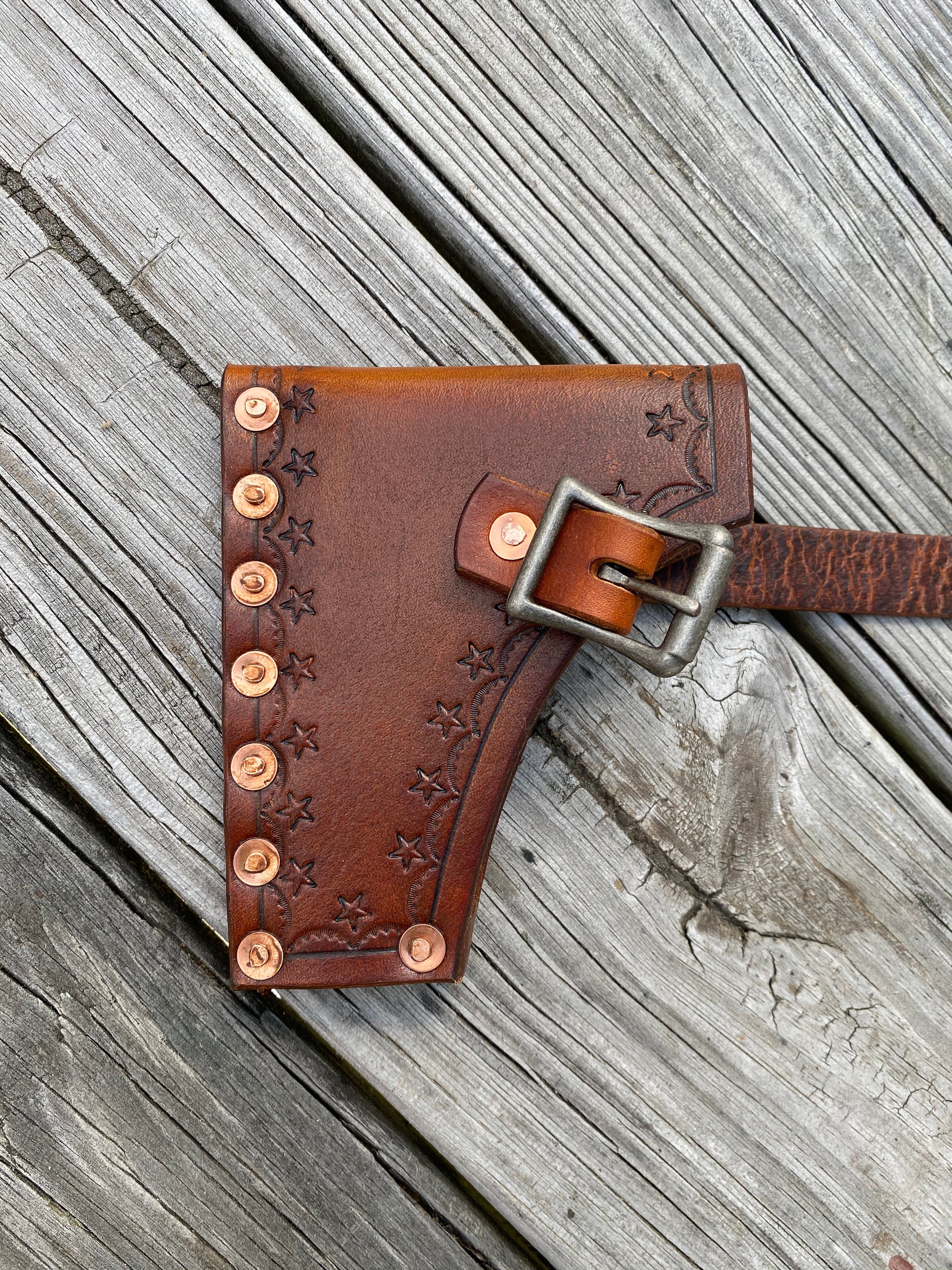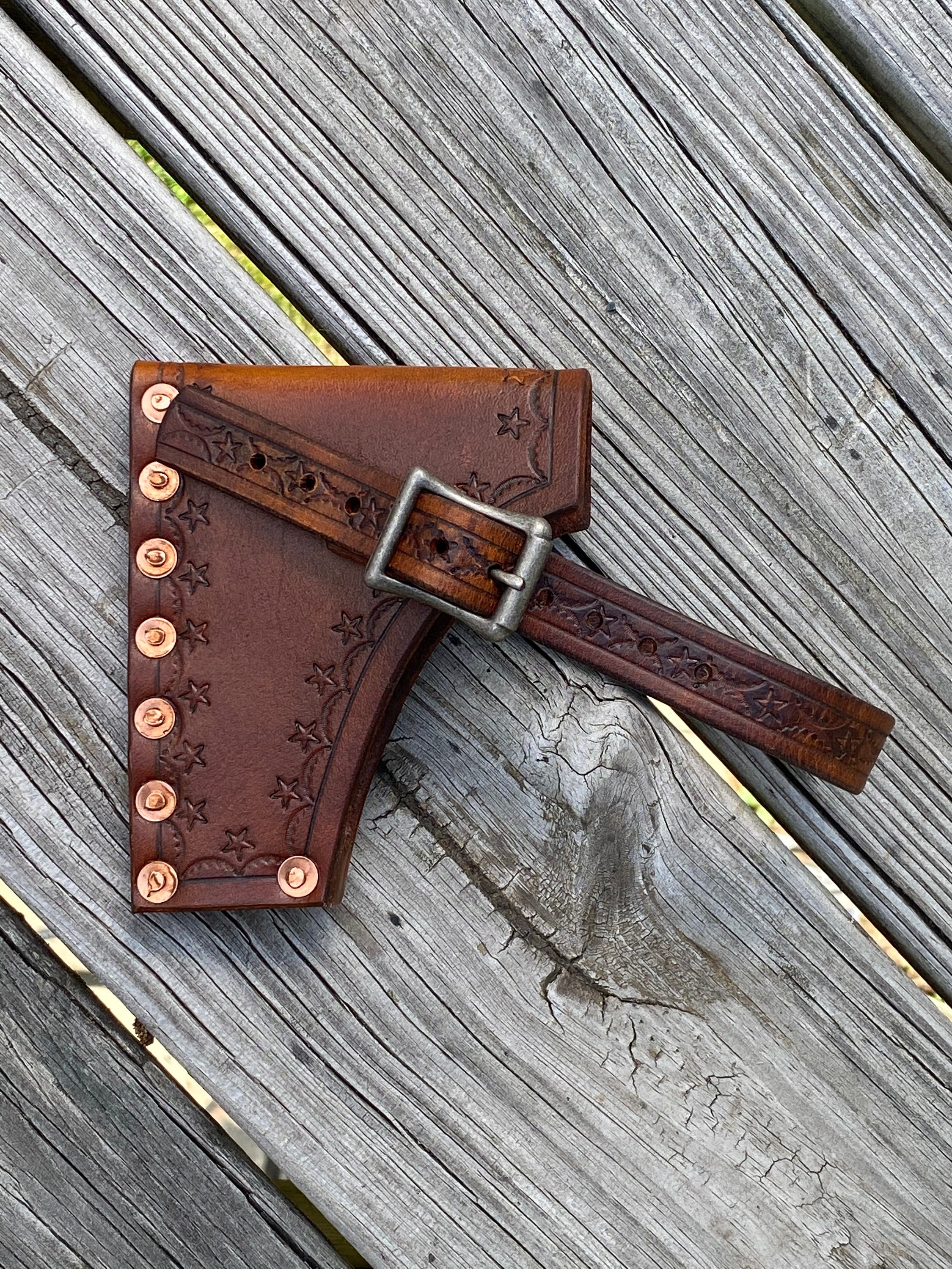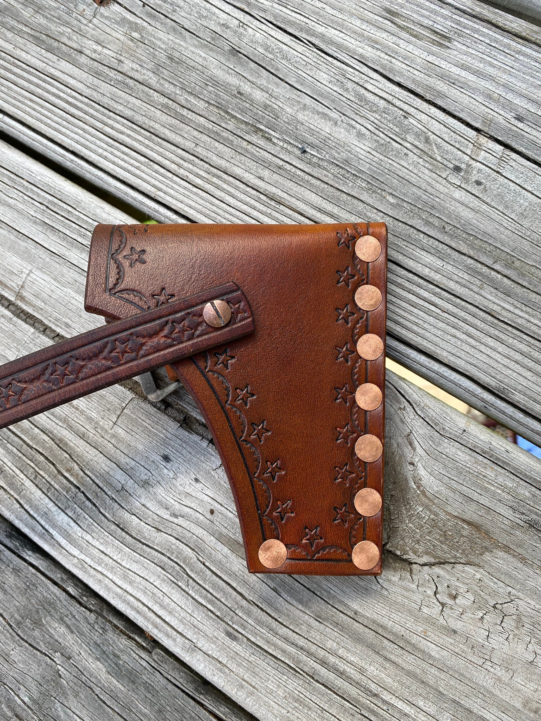 Leather axe sheath handmade from 8/9 oz veg tan leather and given and a rustic antique saddle tan finish . This is a bonded welted sheath fastened with copper rivets and burrs for long lasting durability . This sheath will fit a cutting edge up to 4 inches . The rustic antique finish was achieved with Fiebings Saddle Tan Pro Dye and Fiebing Black Antique and the leather was treated with Bickmore Heavy Duty Leather Preservative . This sheath was Made by one of our Skilled artisans here at Appalachian Axeworks . Thanks for checking out our shop .