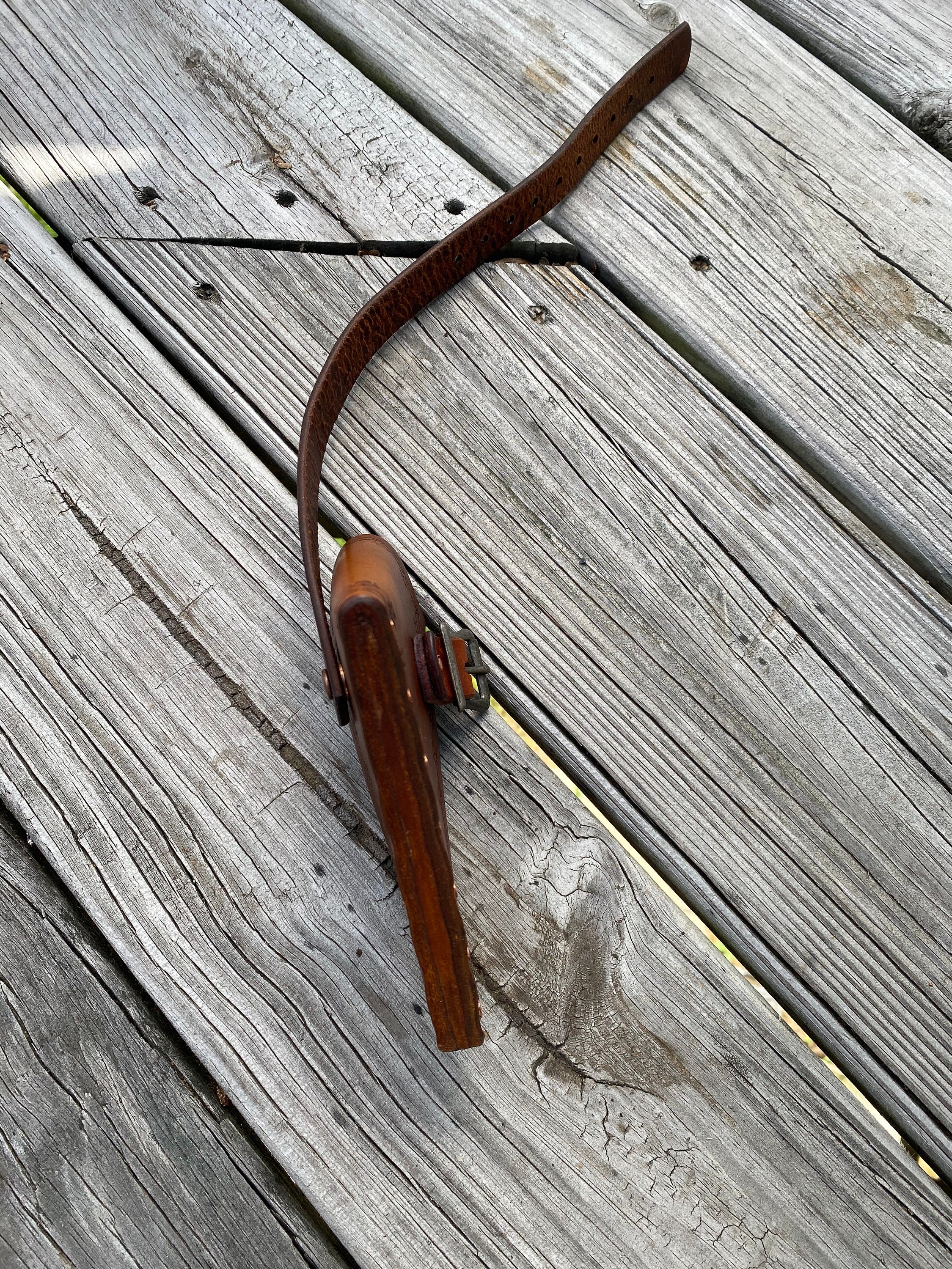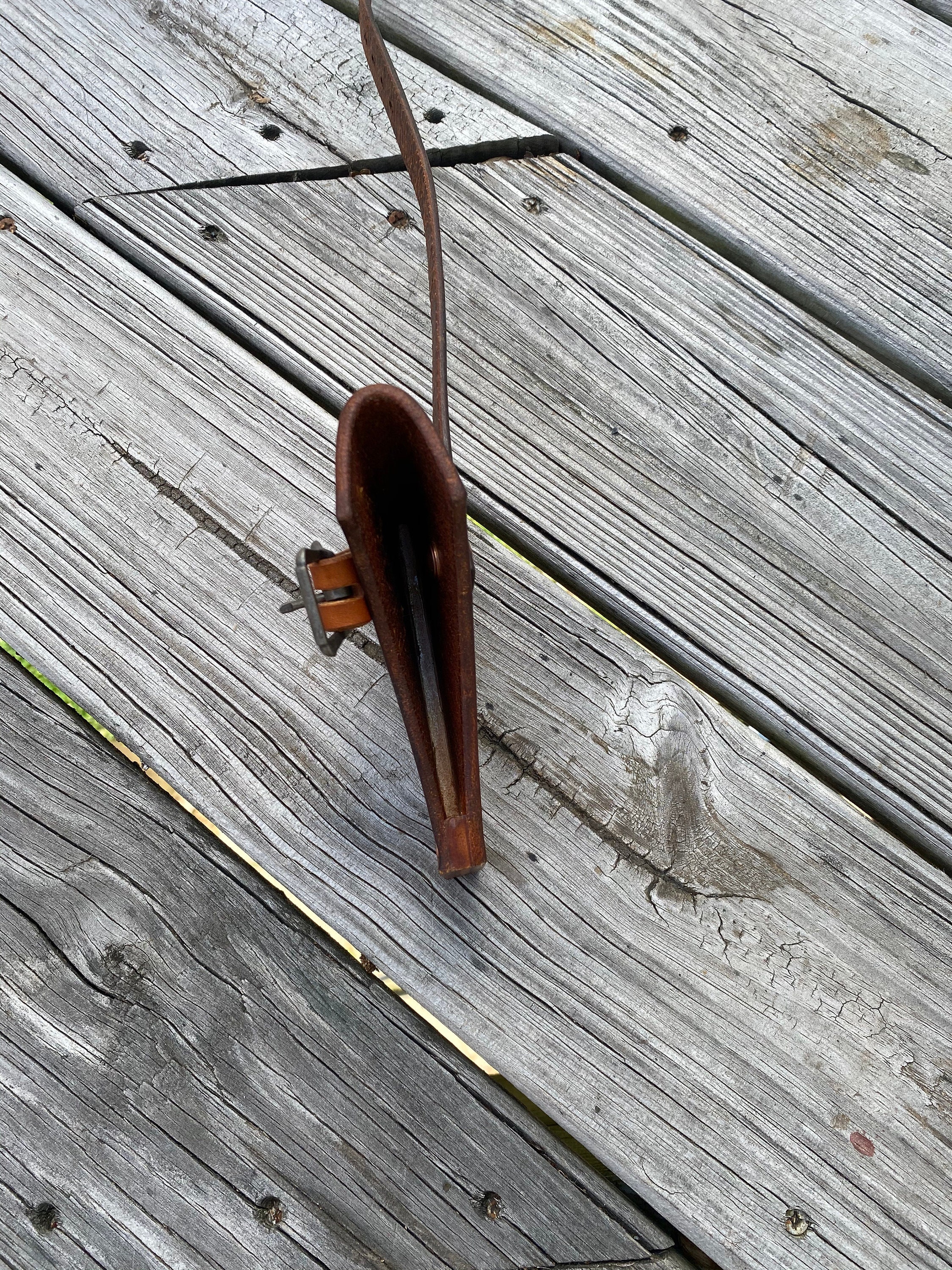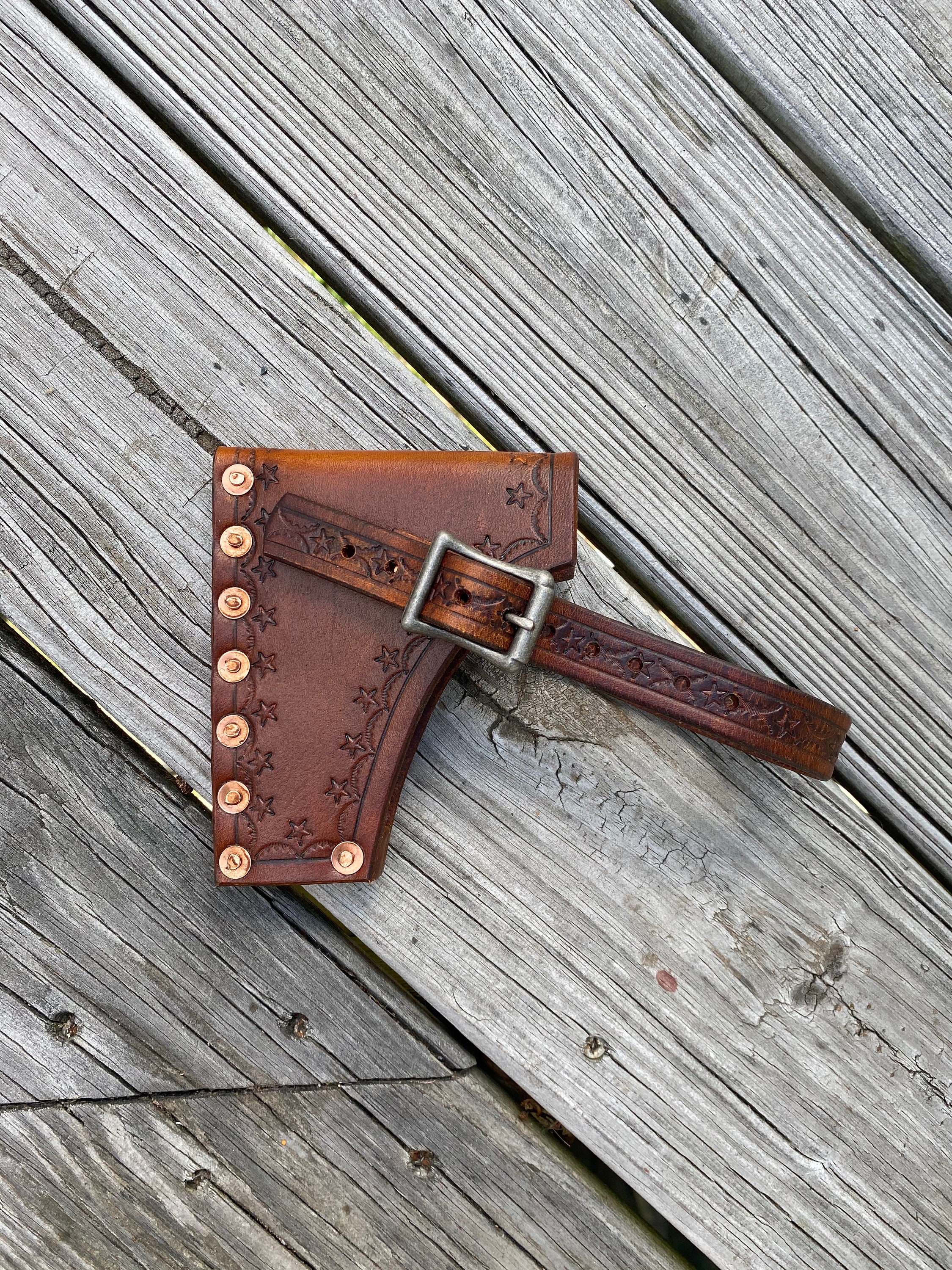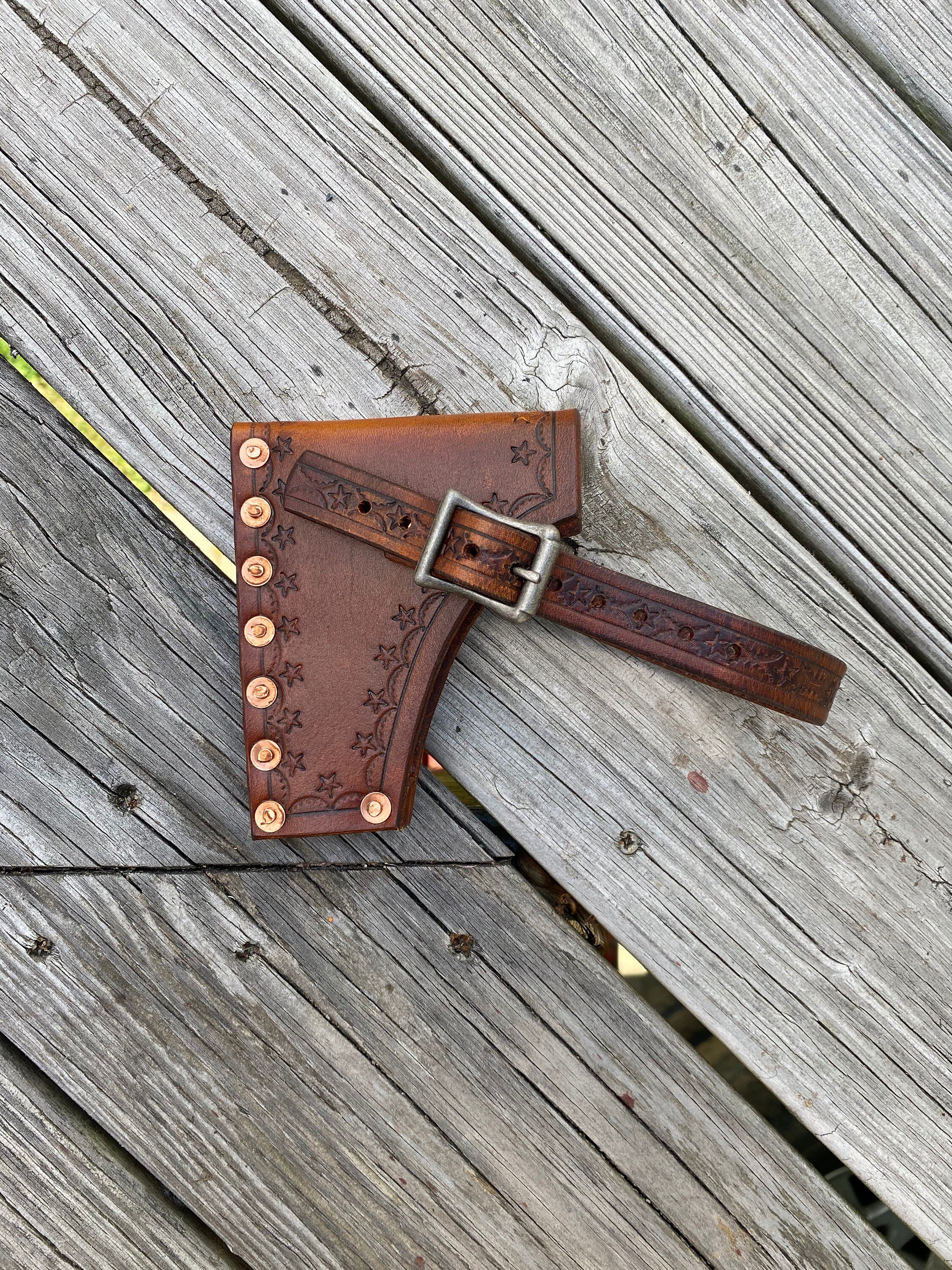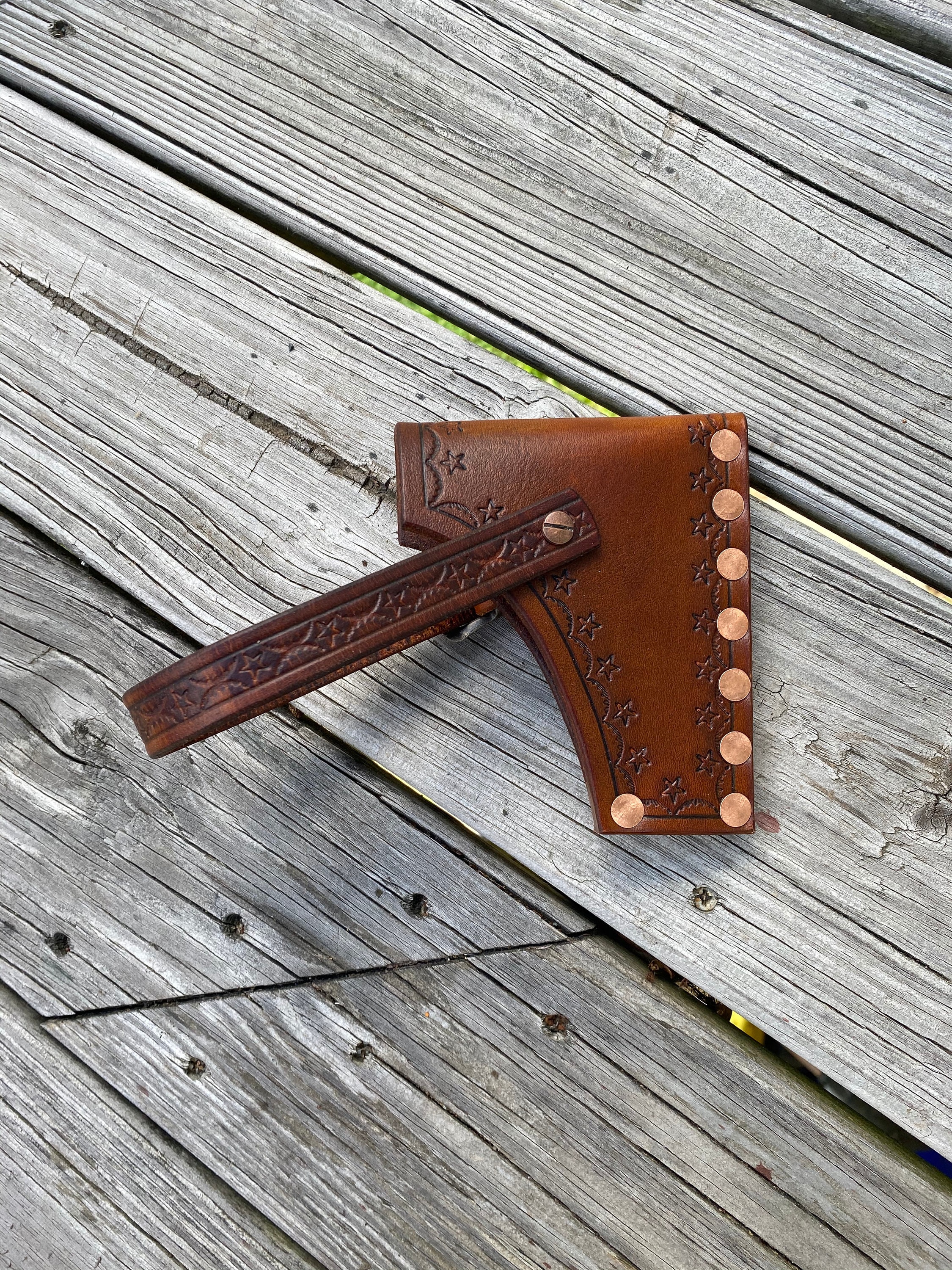 Leather axe sheath handmade from 8/9 oz veg tan leather and given and a rustic antique saddle tan finish . This is a bonded welted sheath fastened with copper rivets and burrs for long lasting durability . This sheath will fit a cutting edge up to 4 inches . The rustic antique finish was achieved with Fiebings Saddle Tan Pro Dye and Fiebing Black Antique and the leather was treated with Bickmore Heavy Duty Leather Preservative . This sheath was Made by one of our Skilled artisans here at Appalachian Axeworks . Thanks for checking out our shop .