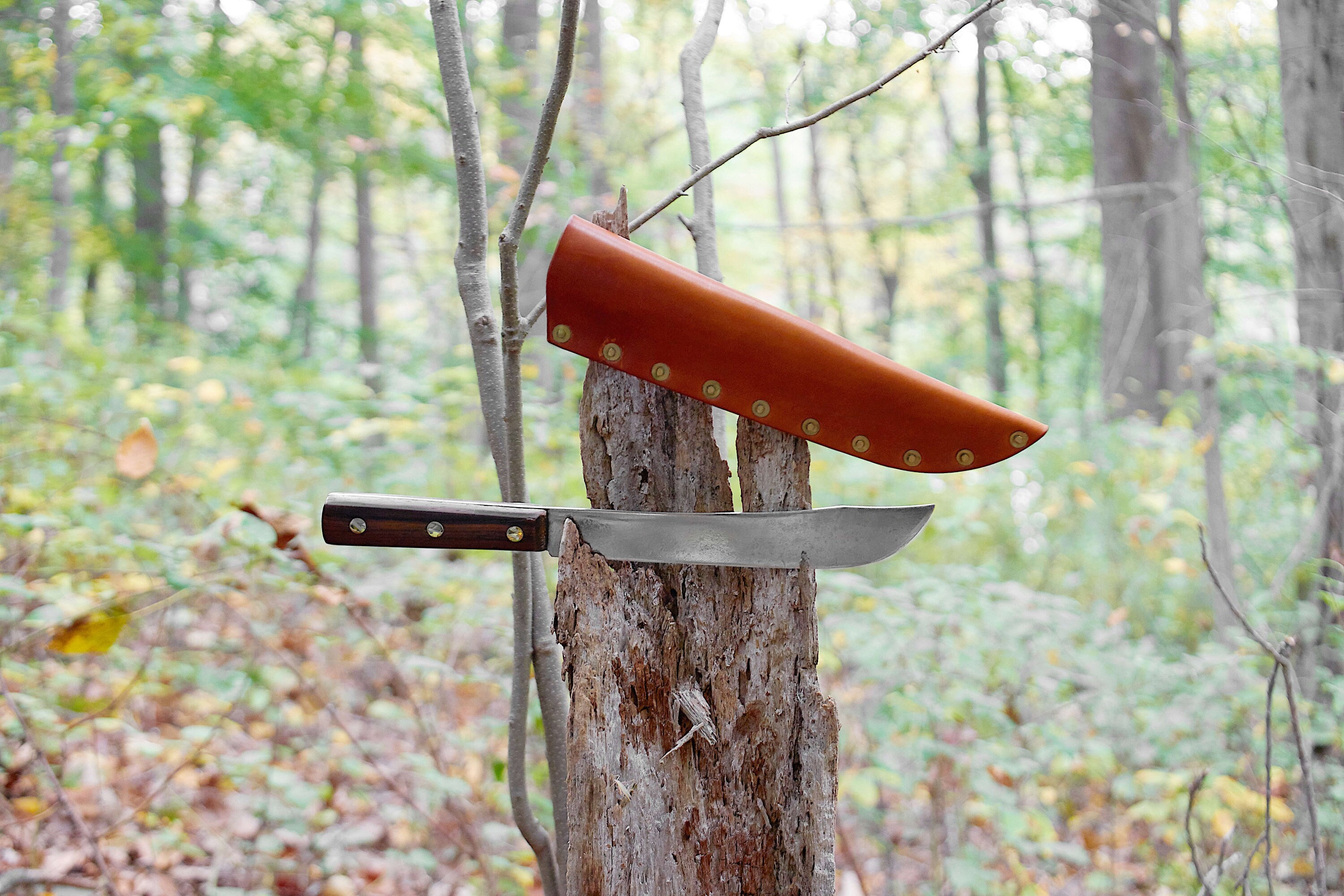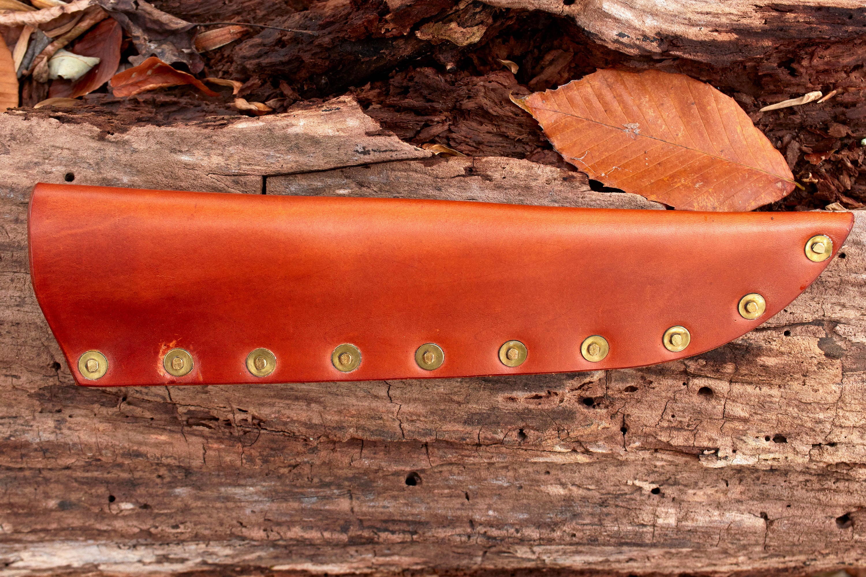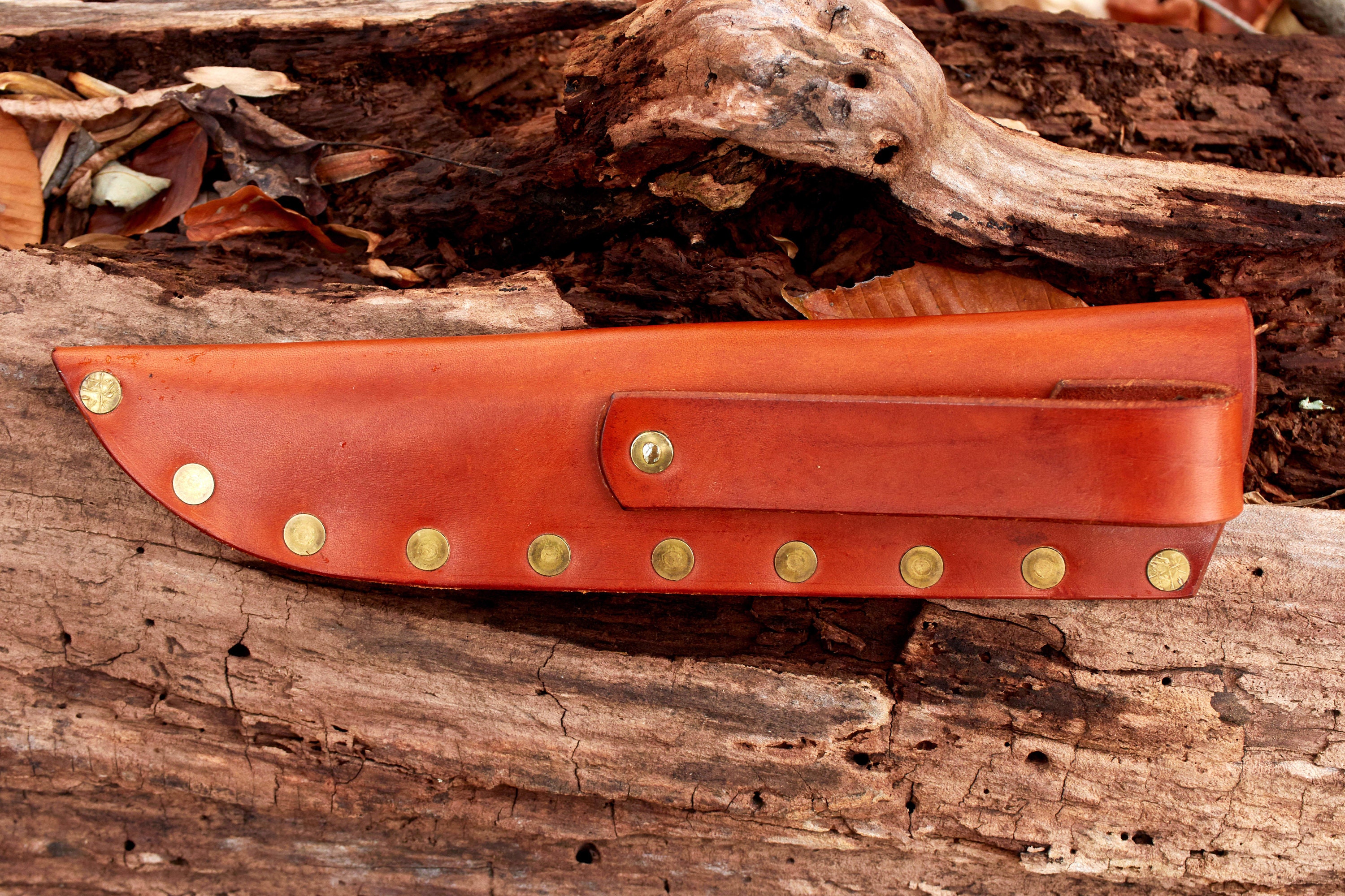 Vintage bushcraft knife has been cleaned and sharpened and a leather sheath was added . This knife is solid and ready for the outdoors . The welted leather sheath is made from 8/9 oz veg tan leather and given a rustic saddle tan finish and fastened with brass rivets . The leather was treated with Bickmore heavy duty leather preservative . Knife length is 12.5 inches and blade length is 8 inches .