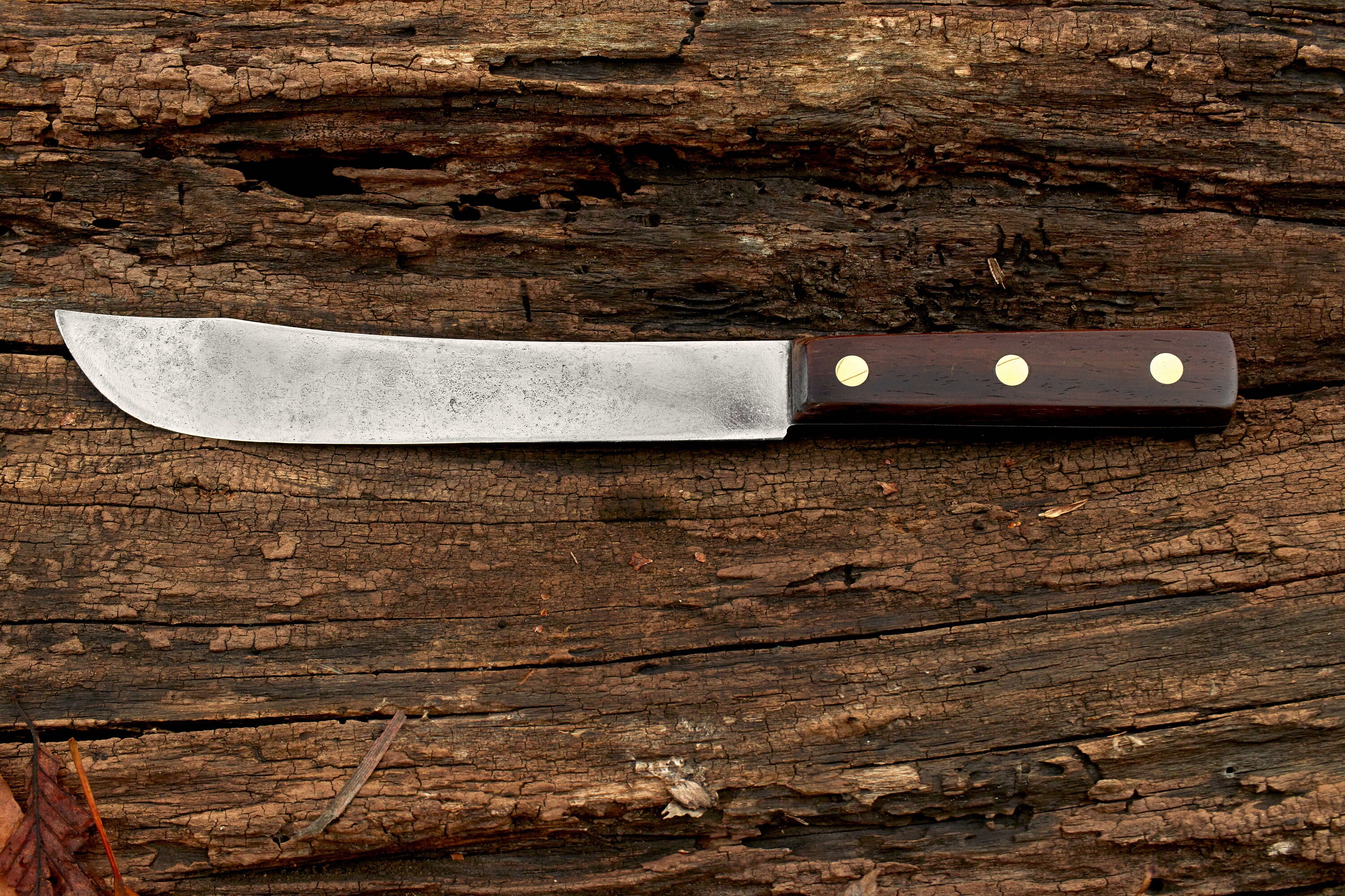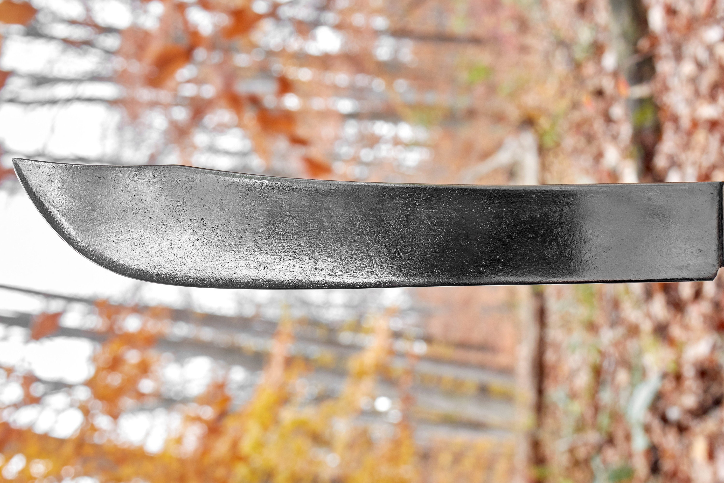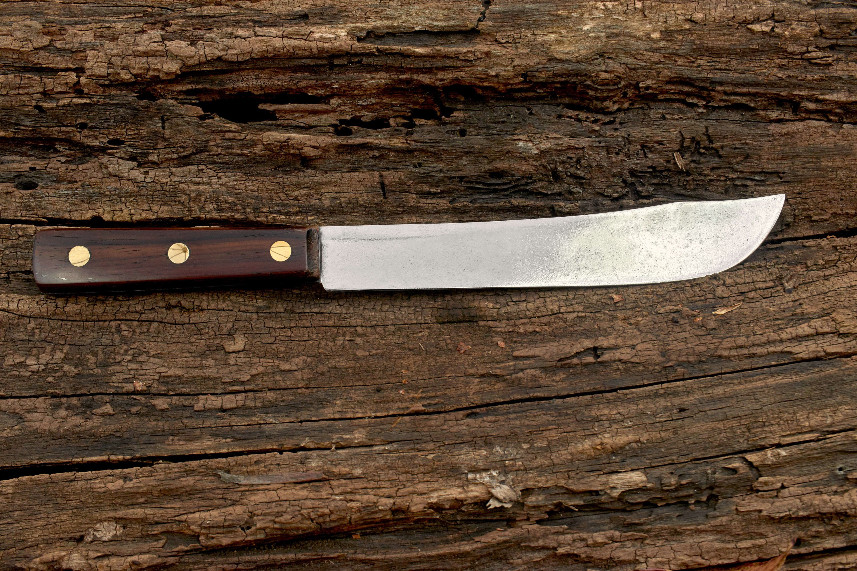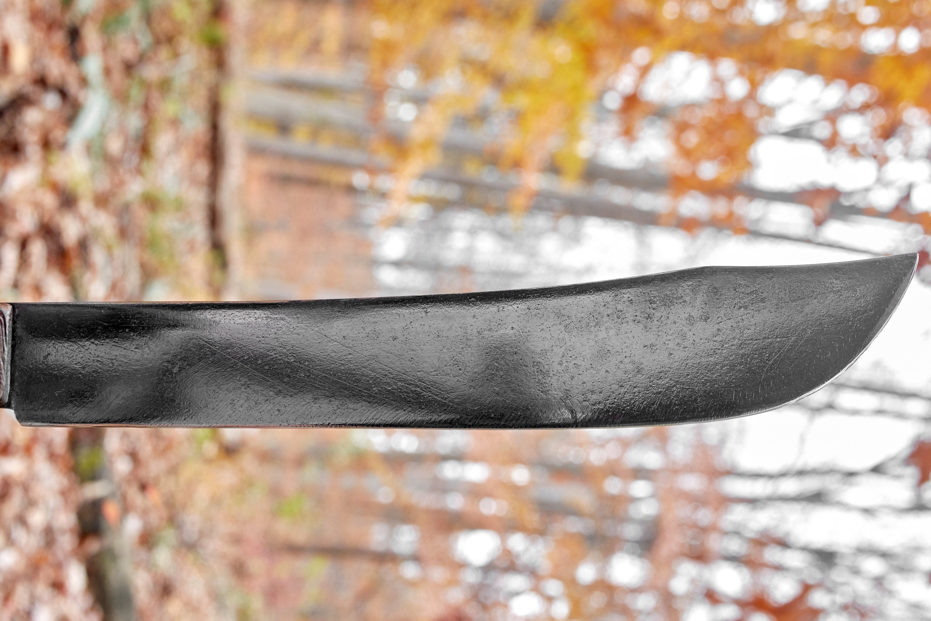 Vintage bushcraft knife has been cleaned and sharpened and a leather sheath was added . This knife is solid and ready for the outdoors . The welted leather sheath is made from 8/9 oz veg tan leather and given a rustic saddle tan finish and fastened with brass rivets . The leather was treated with Bickmore heavy duty leather preservative . Knife length is 12.5 inches and blade length is 8 inches .